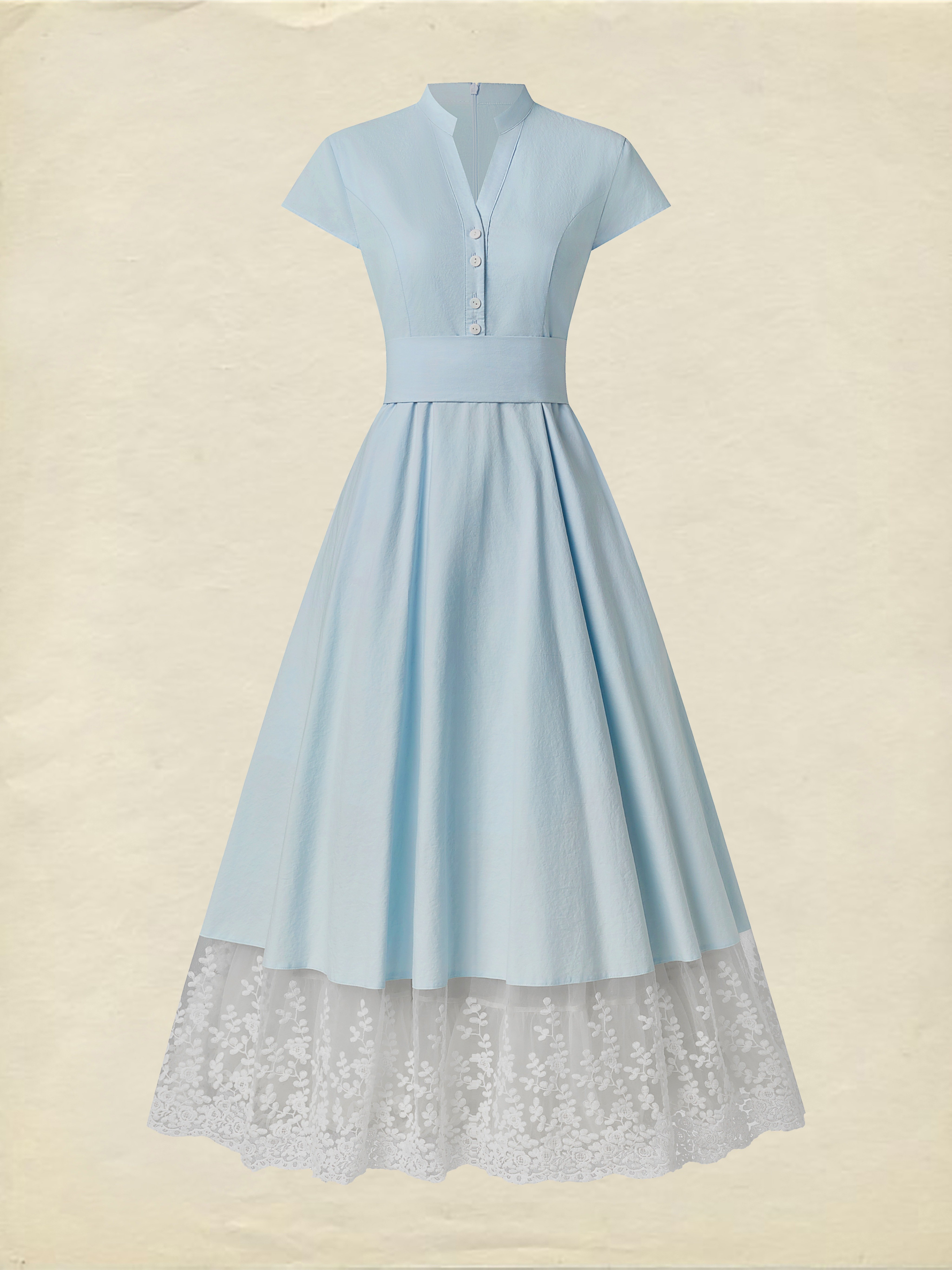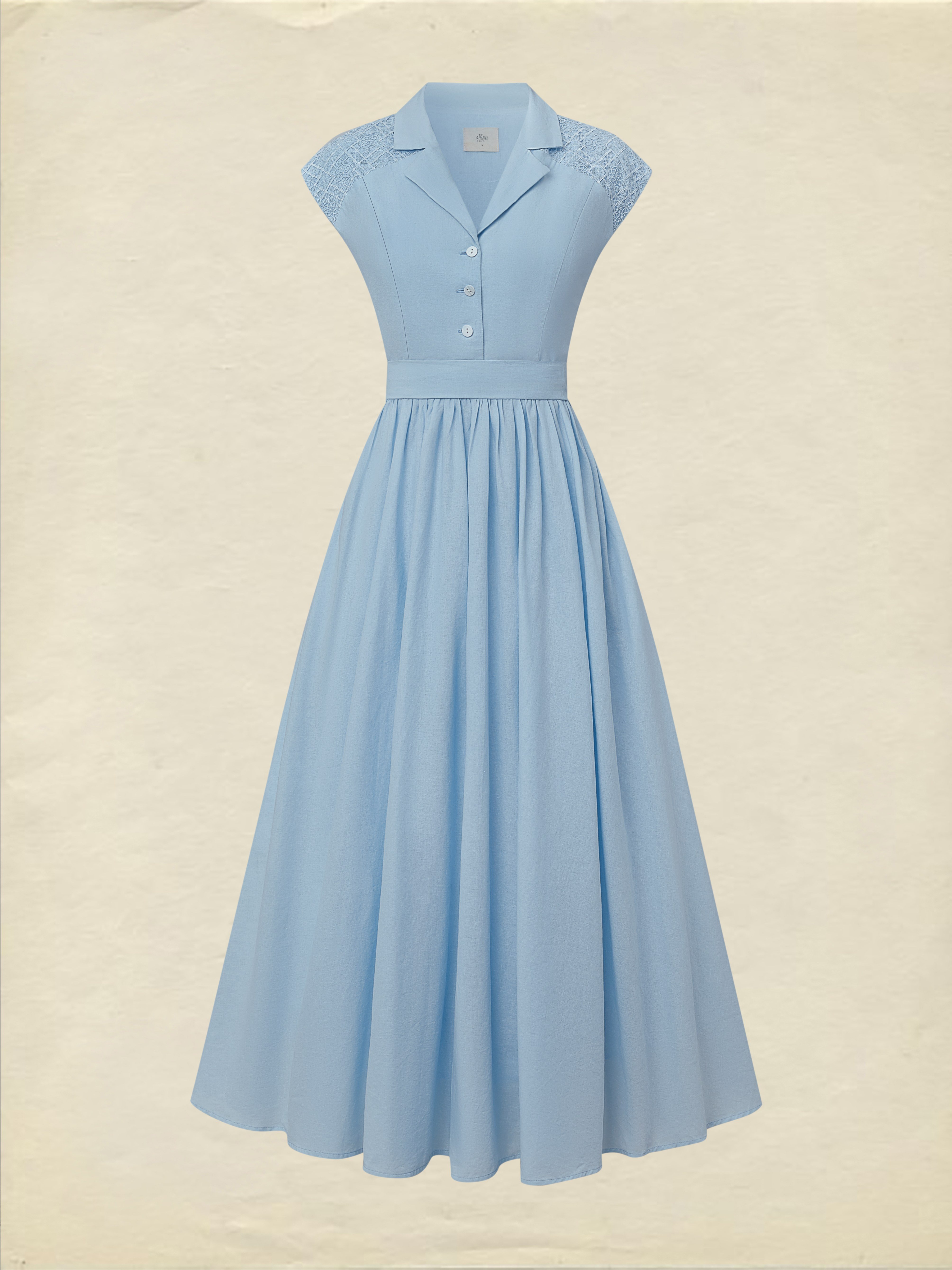 Maxi Linen Dress , Cap Sleeves, Shawl Collar, Plain, Lace, Vintage, Blue