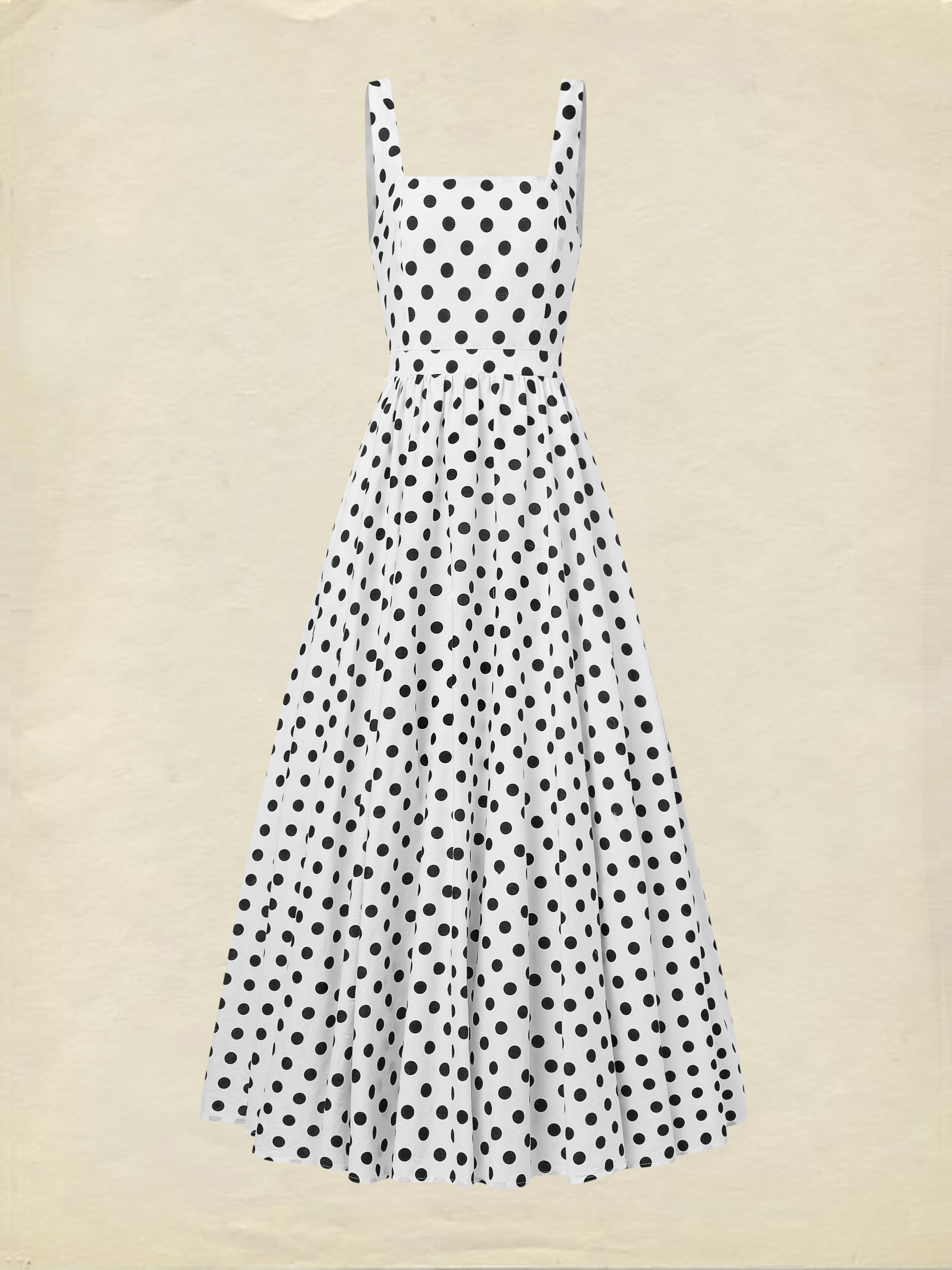 Maxi Cotton Dress , Sleeveless, Square Neck, Polka Dots, Suspenders, Vintage, White