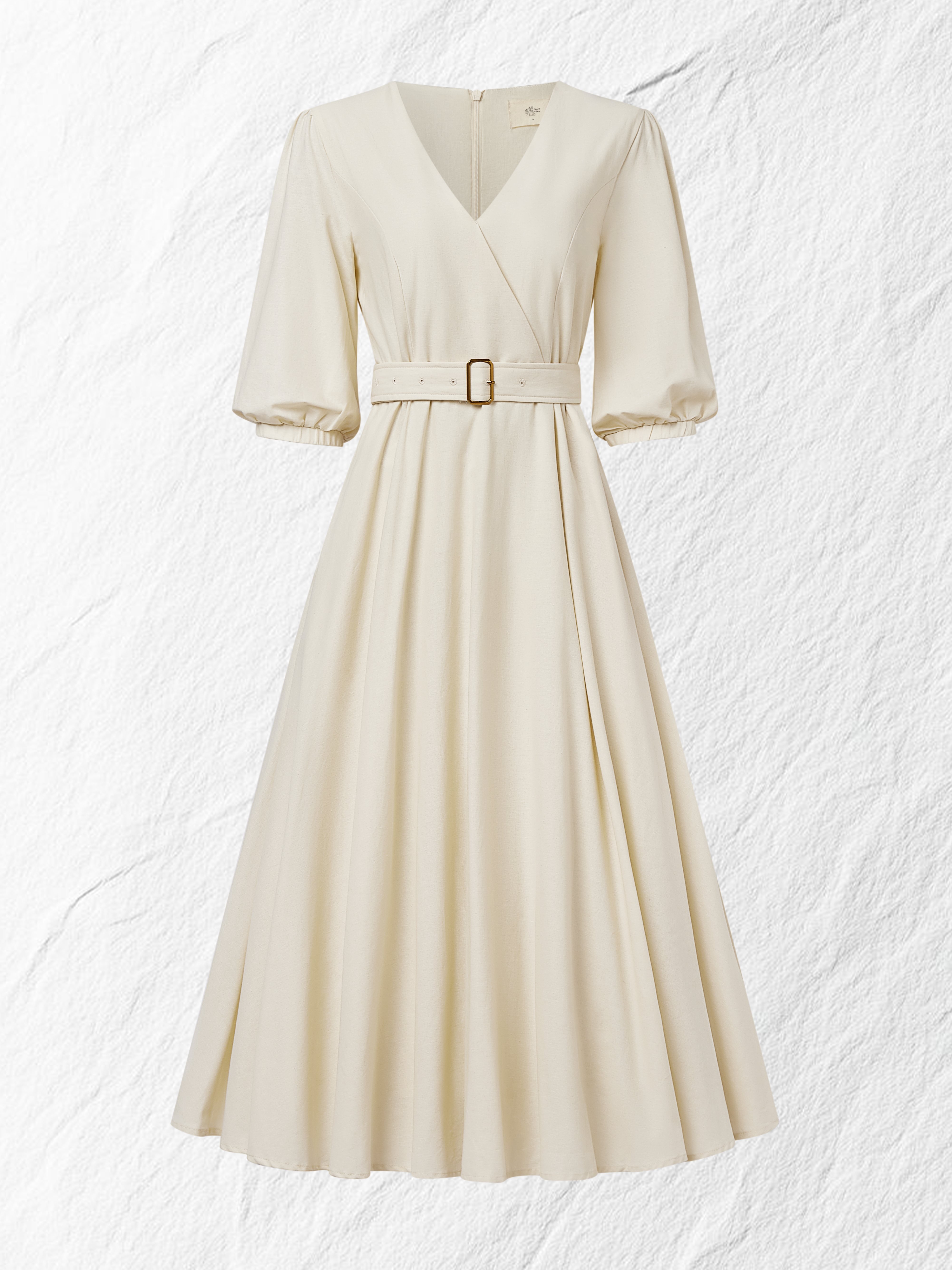 Maxi Cotton Dress, Balloon Sleeve, V Neck, Plain, Belt Design, Vintage, Khaki