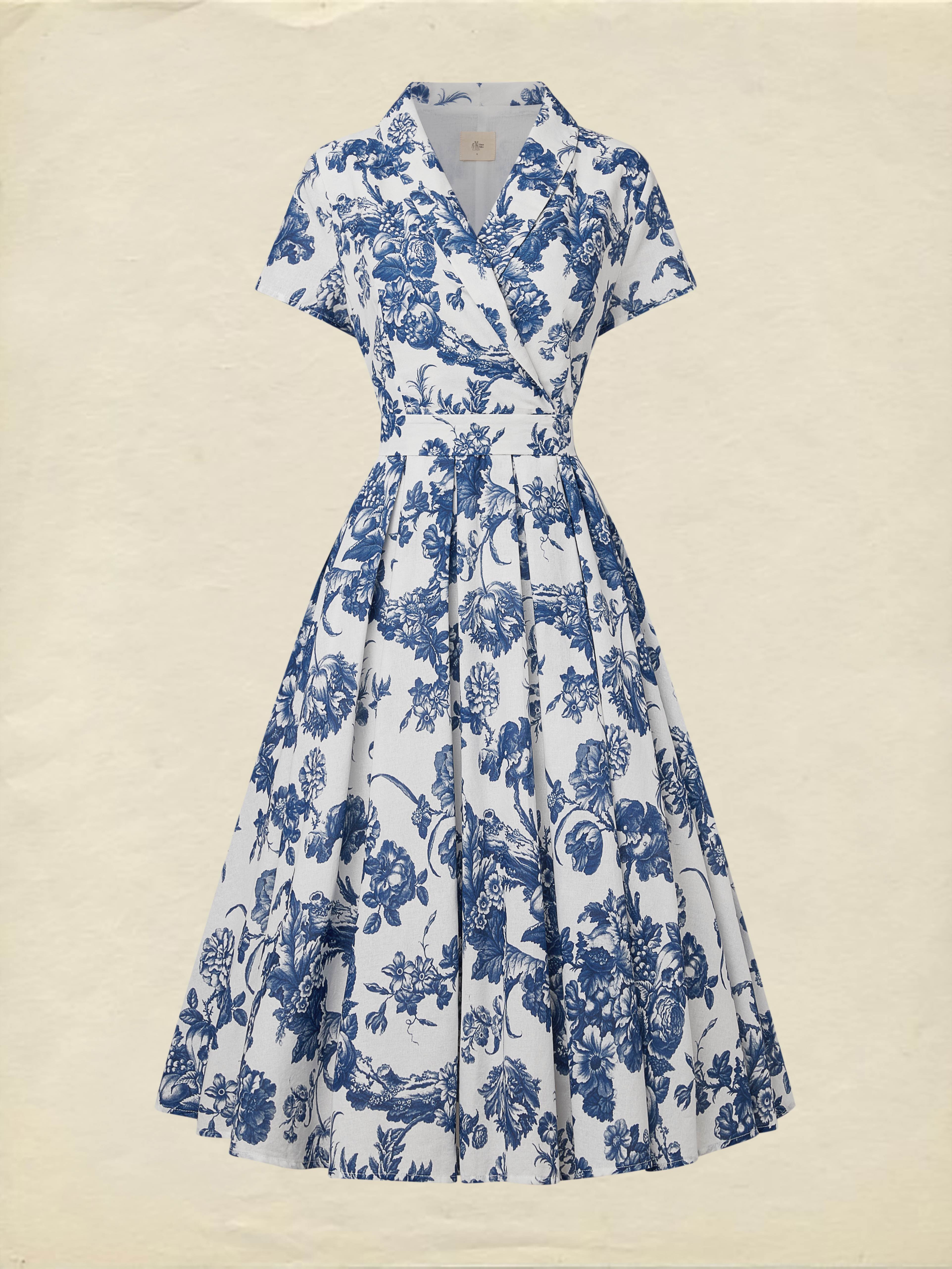 Midi Linen Dress , Short Sleeves, Shawl Collar, Floral, Vacation, Vintage, Blue