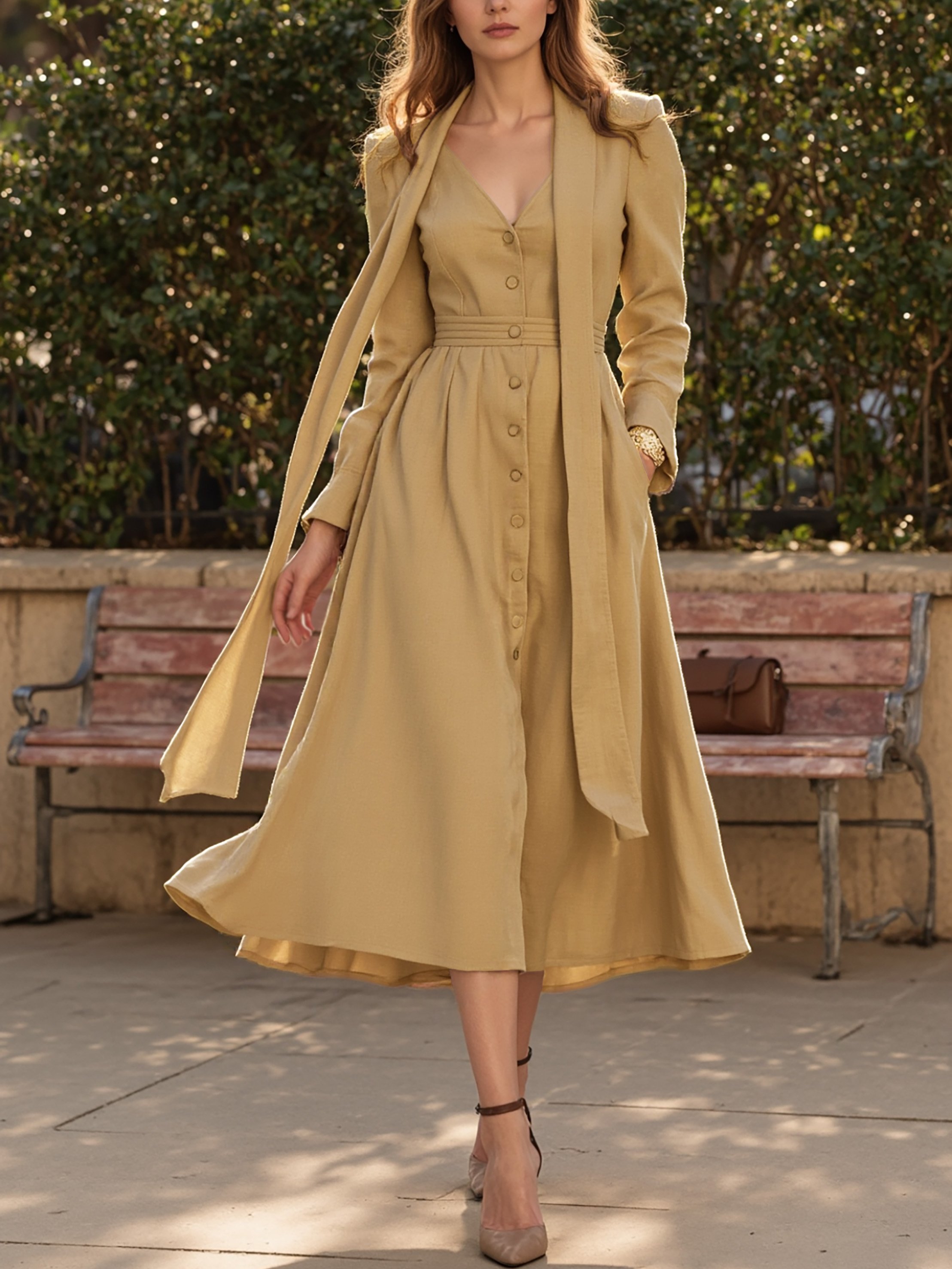 Midi Cotton Dress, Long Sleeves, V Neck, Plain, Button Design, French Vintage, Khaki