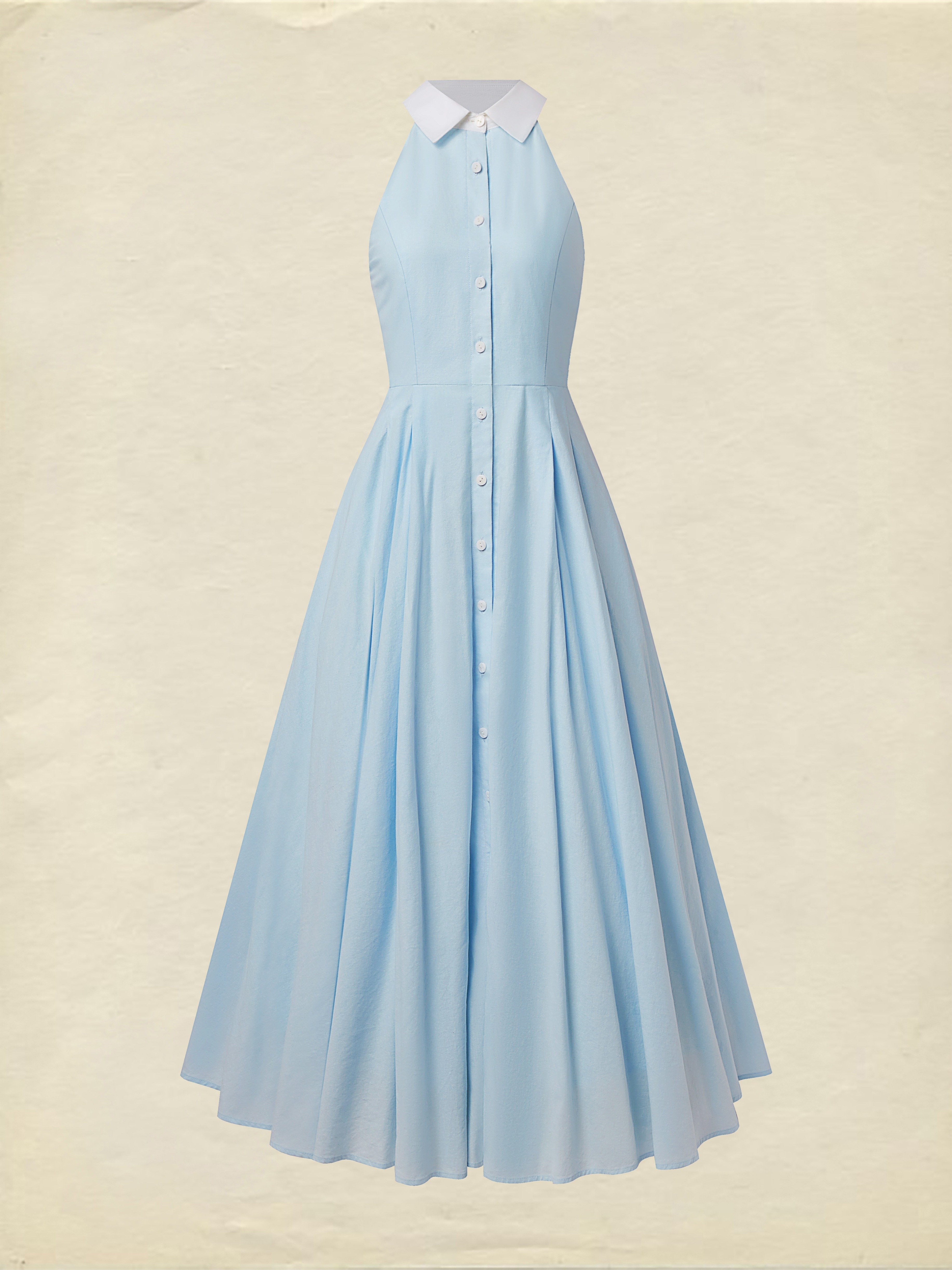 Maxi Linen Dress, Sleeveless, Shawl Collar, Plain, Button Design, Vintage, Blue