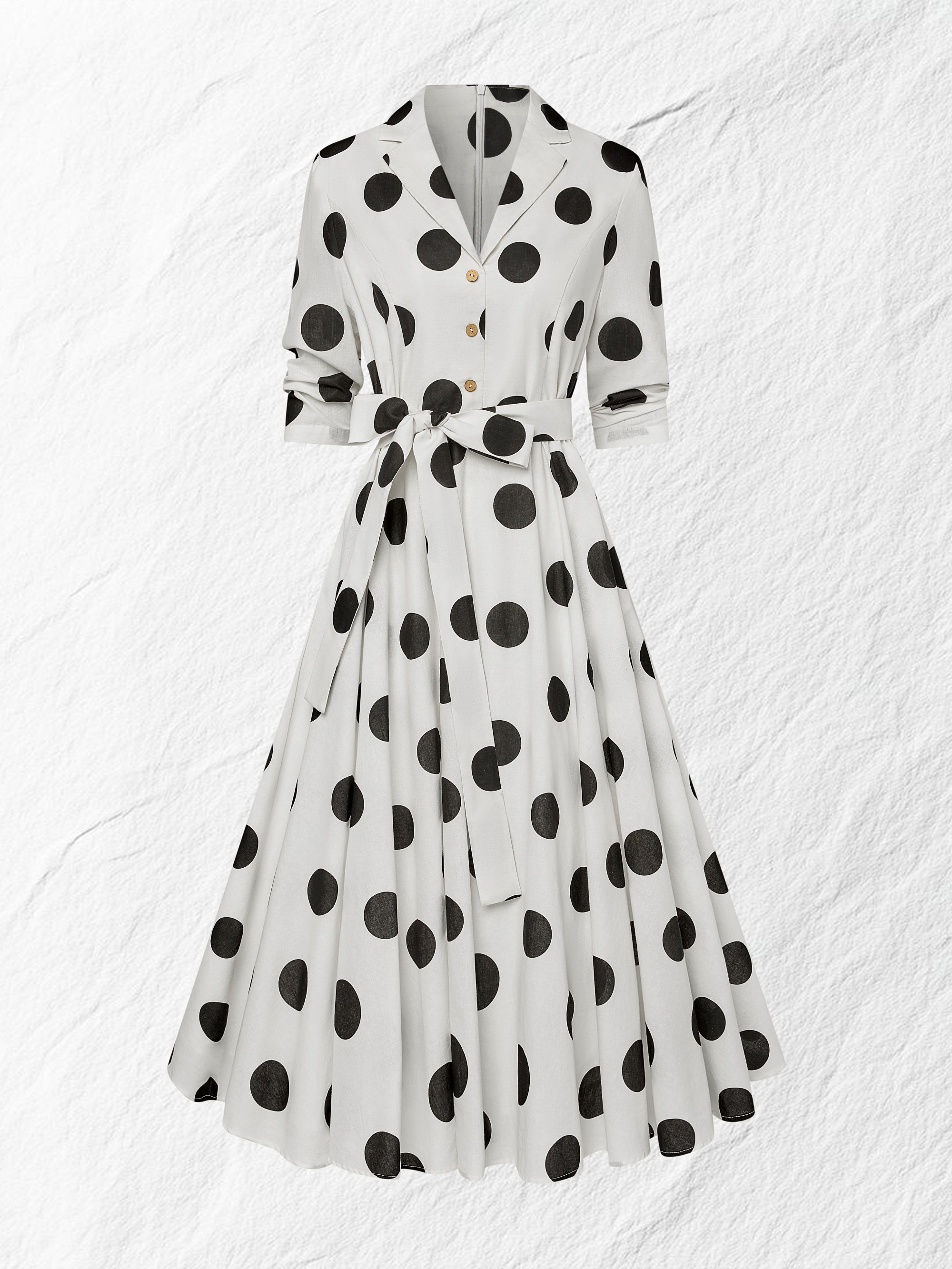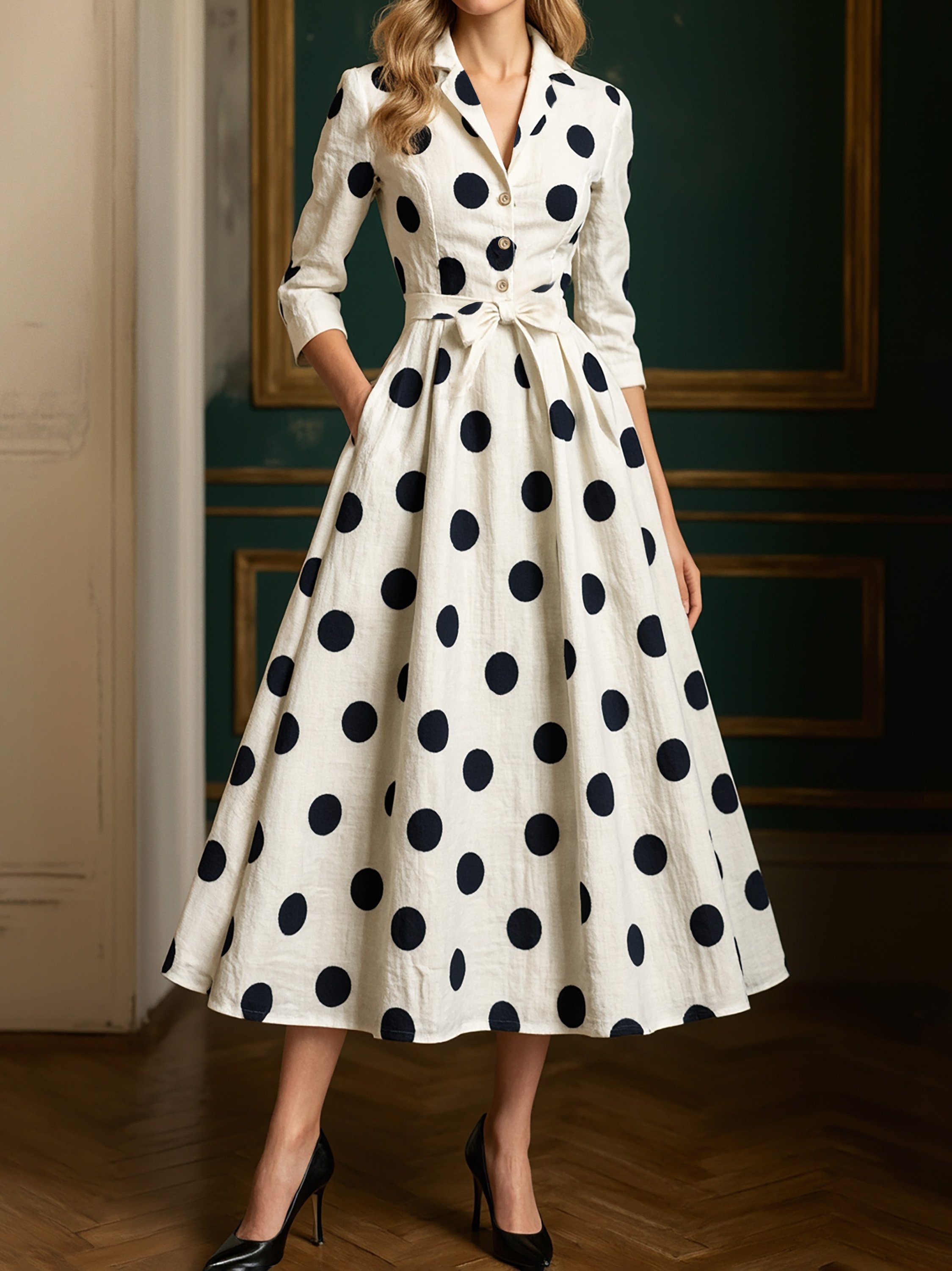 Midi Cotton Dress, Half Sleeve, Shawl Collar, Polka Dots, Button Design, French Vintage, White