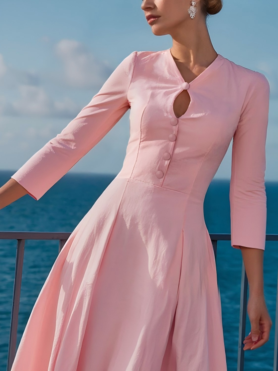 Midi Cotton Dress , Half Sleeve, V Neck, Plain, Button Design, French Vintage, Pink