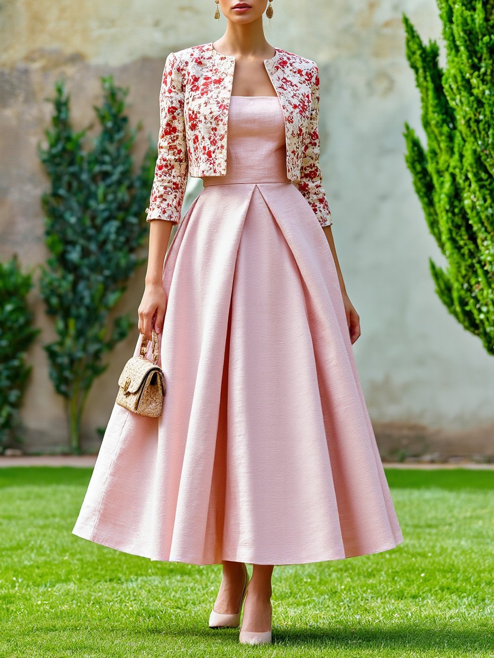 Maxi Cotton Dress Set, Half Sleeve, Round Neck, Floral, Pocket Design, French Vintage, Light Pink