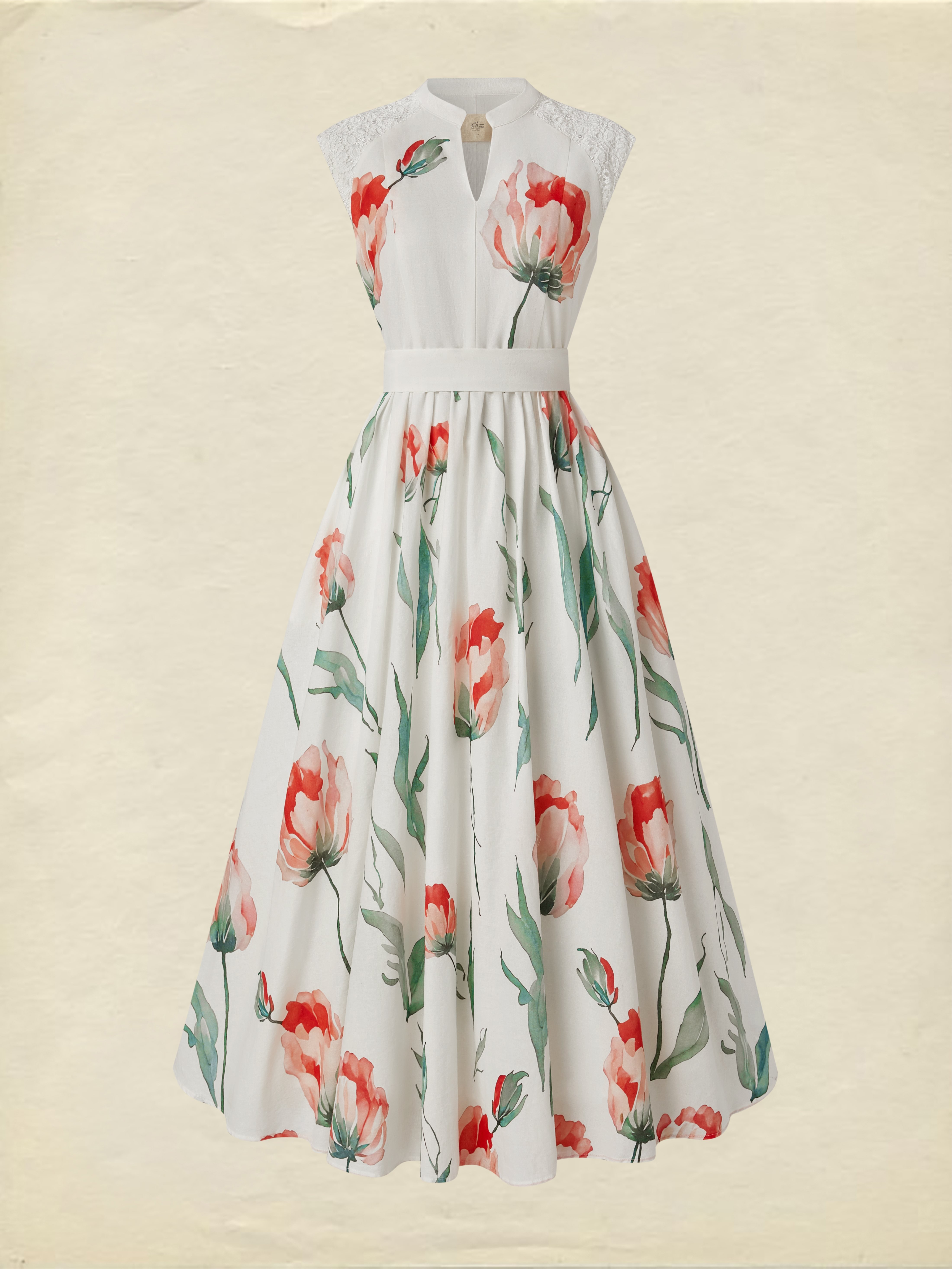 Maxi Linen Dress , Sleeveless, V Neck, Floral, Lace, Vacation, Vintage, Coral