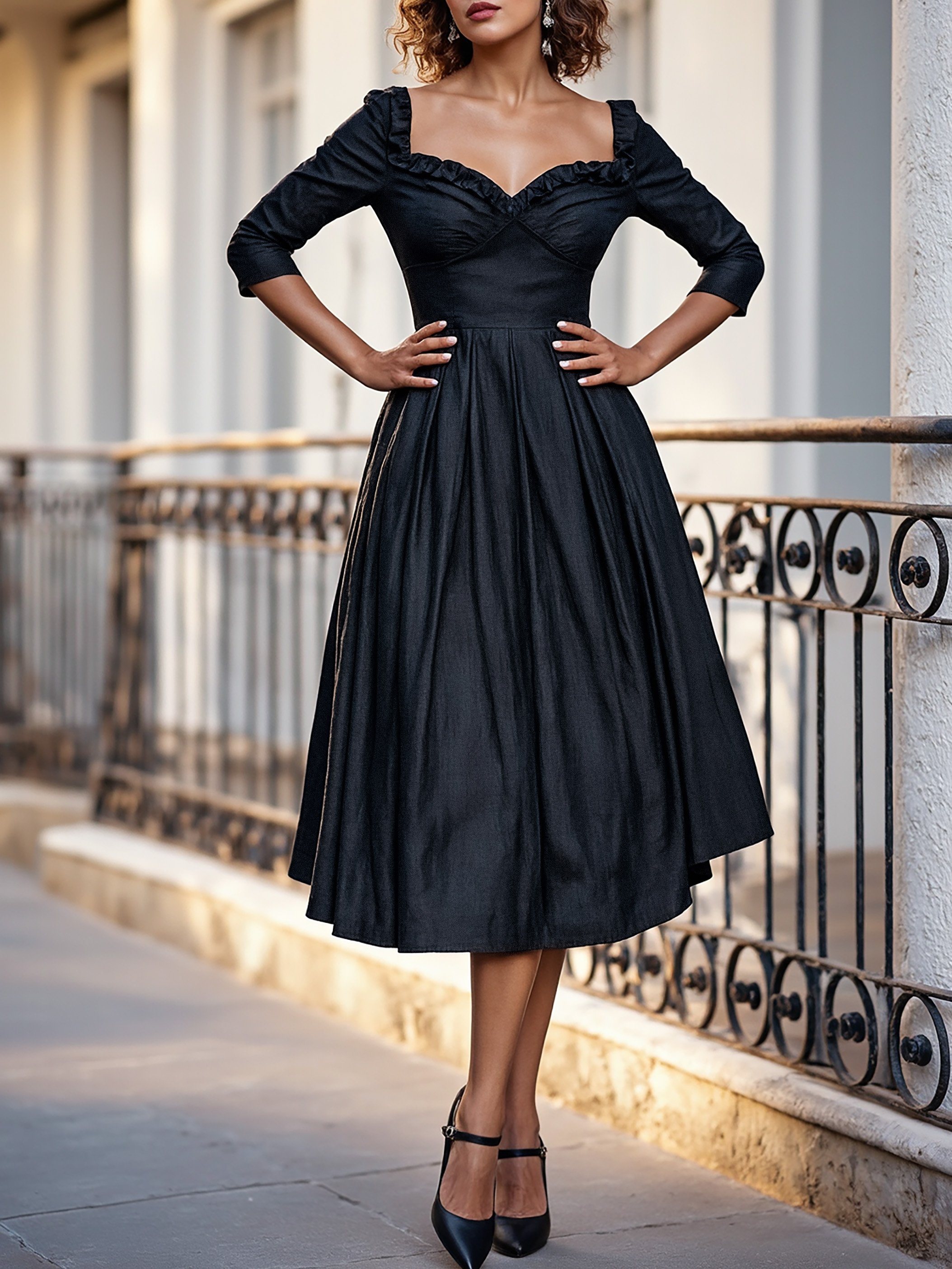 Midi Linen Dress, Half Sleeve, Sweetheart Neck, Plain, Lace, Vintage, Black