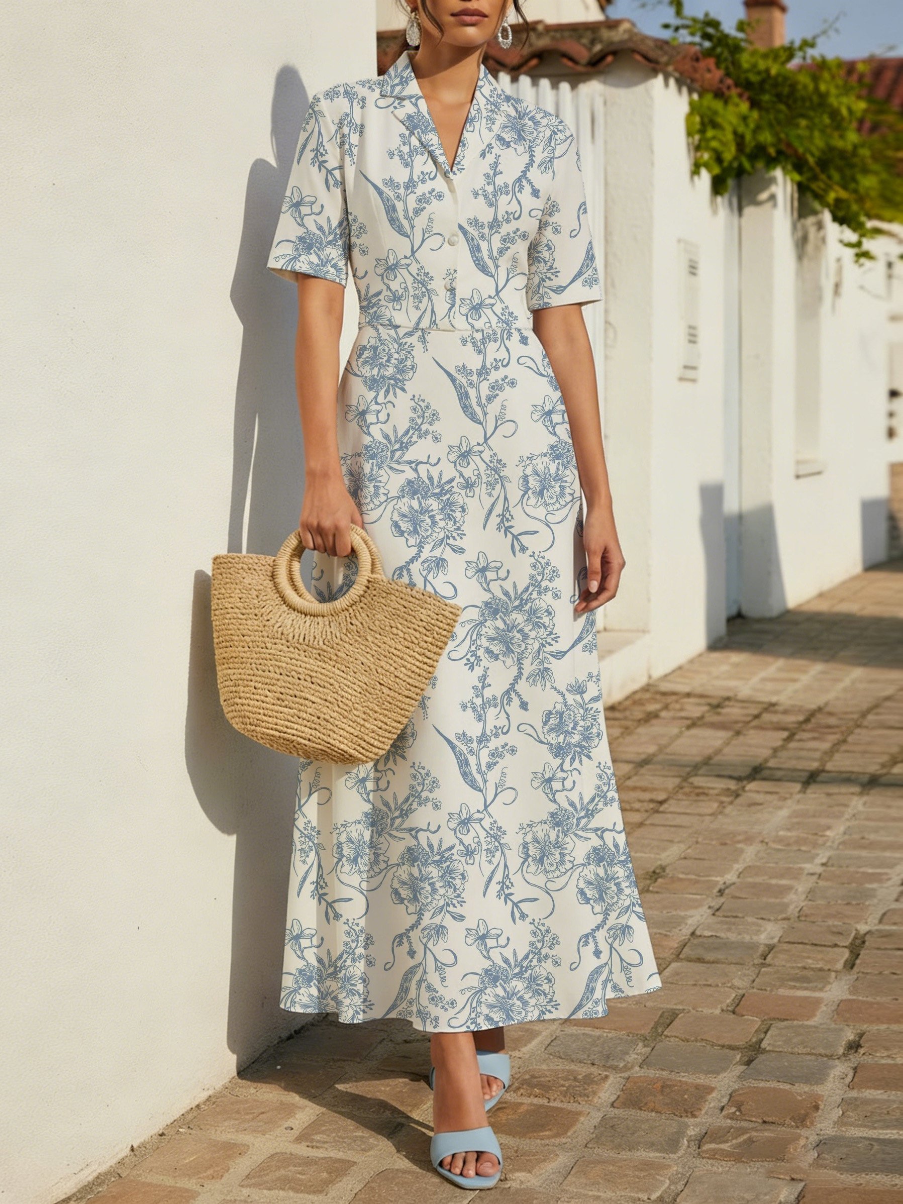 Maxi Linen Dress , Half Sleeve, Lapel Collar, Floral, Vacation, Vintage, Blue