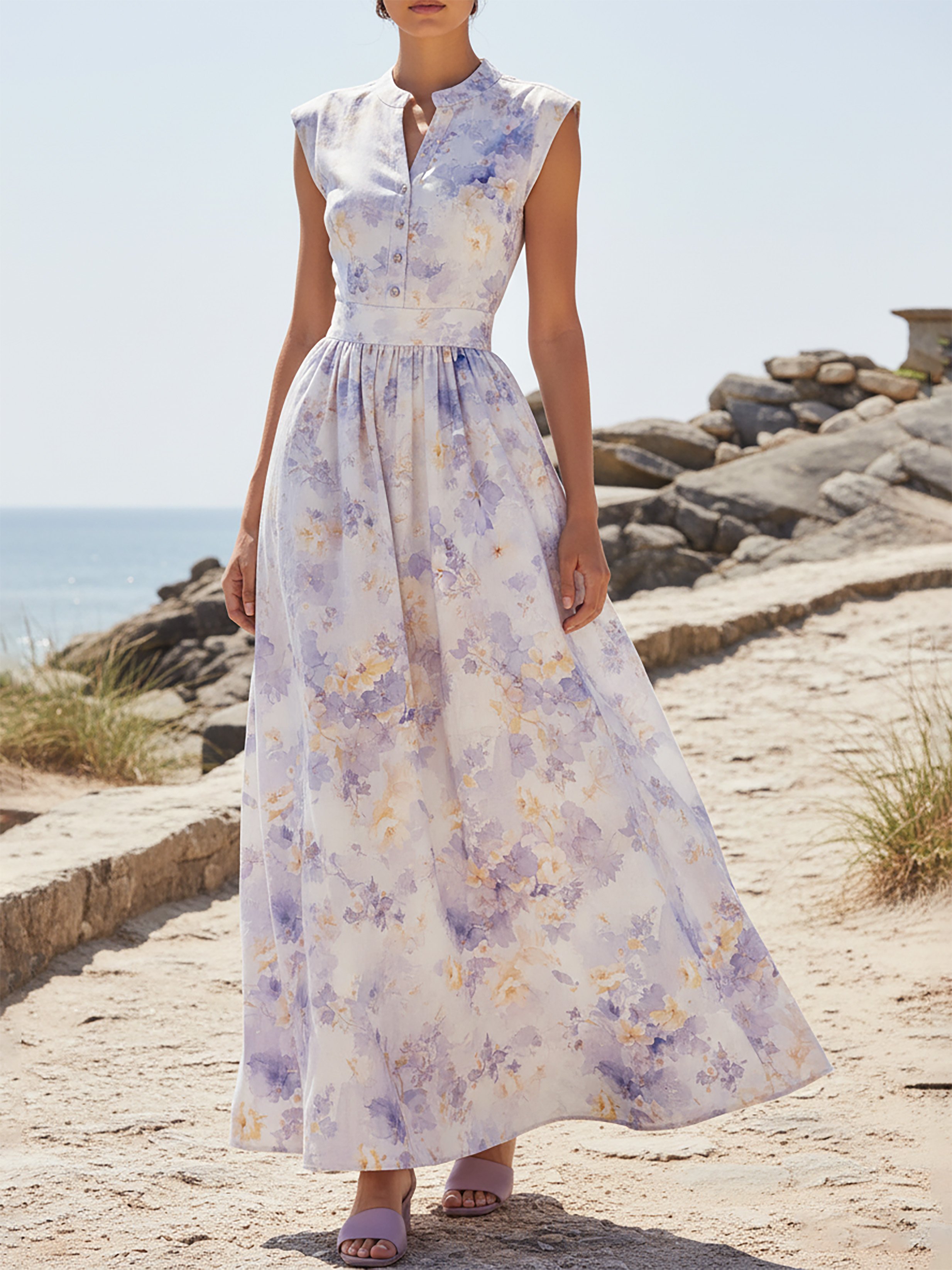 Maxi Leinenkleid, Kurzärmel, V-Ausschnitt, Floral, Knopfdesign, Urlaub, Vintage, Lavendel