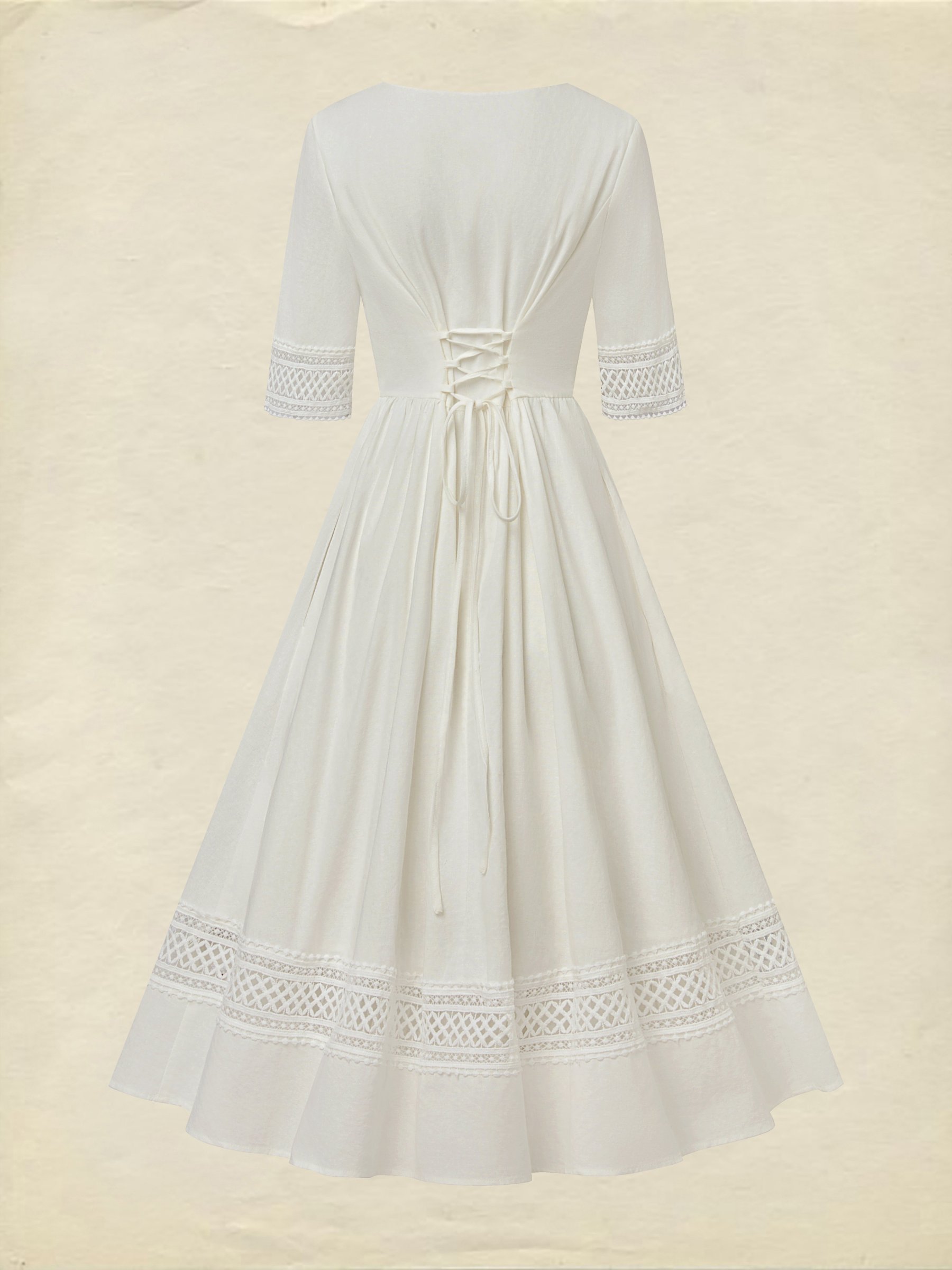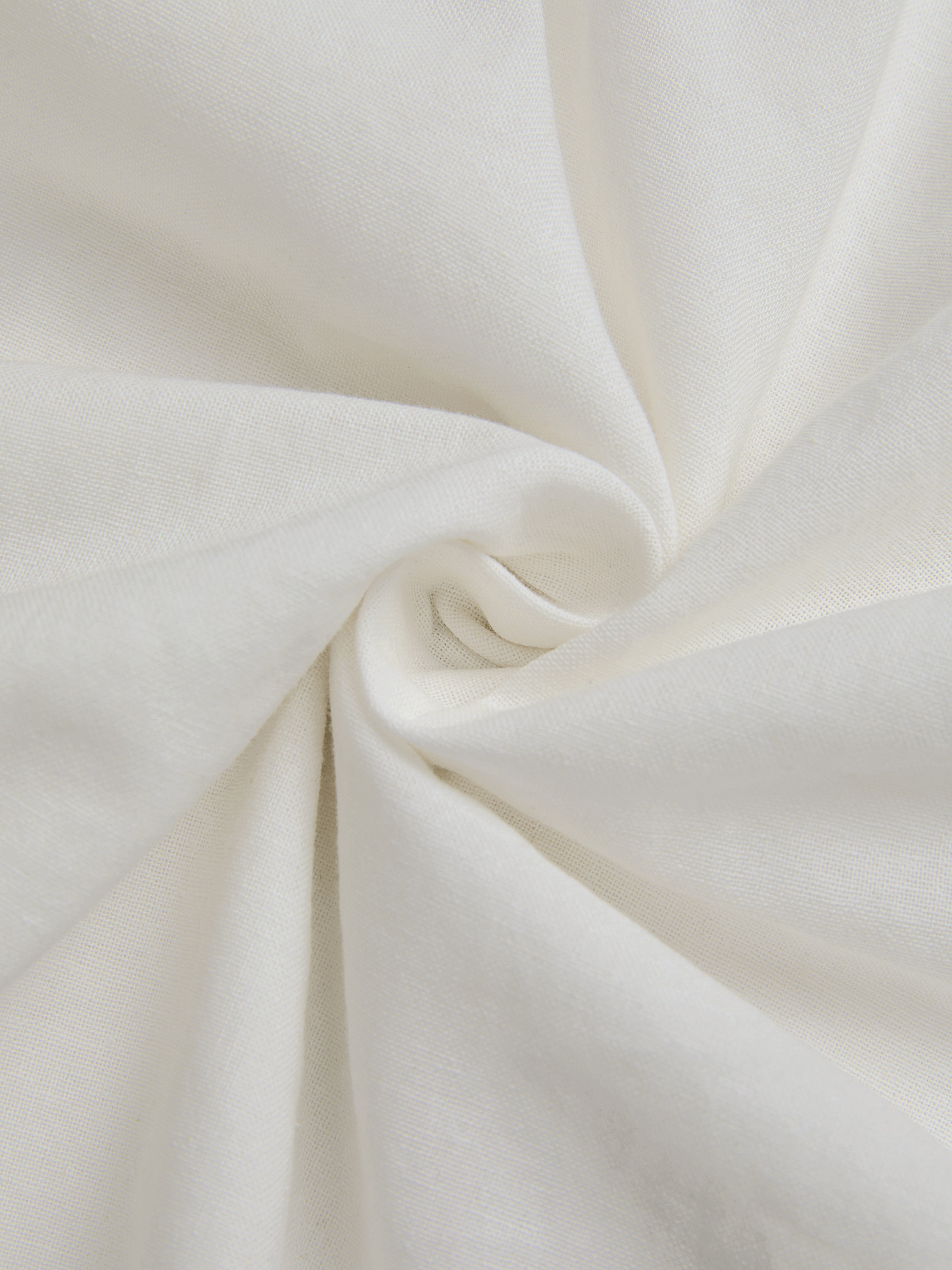 Midi Leinenkleid, Halbarm, V-Ausschnitt, Unifarben, Spitze, Französischer Vintage, Weiß