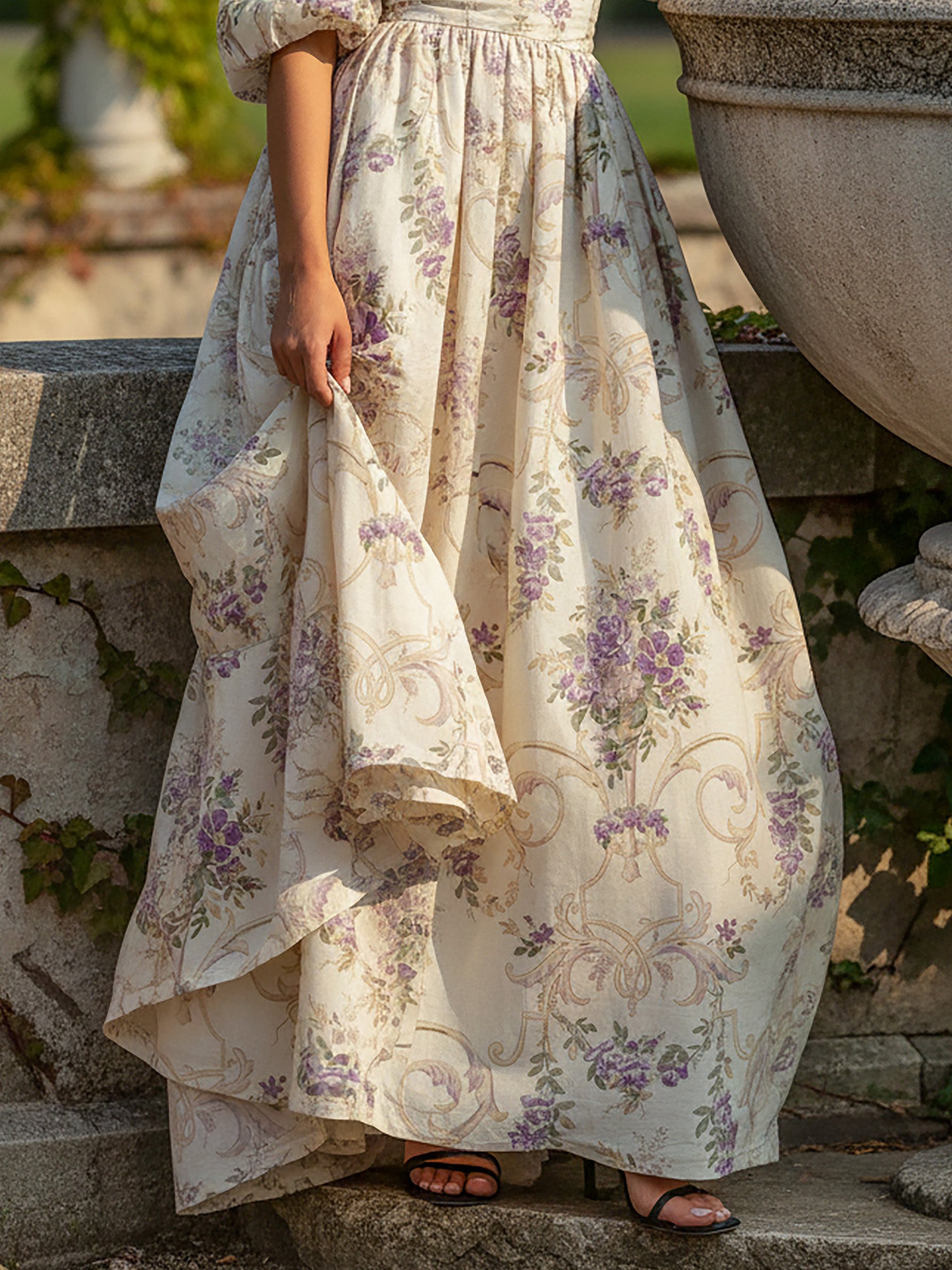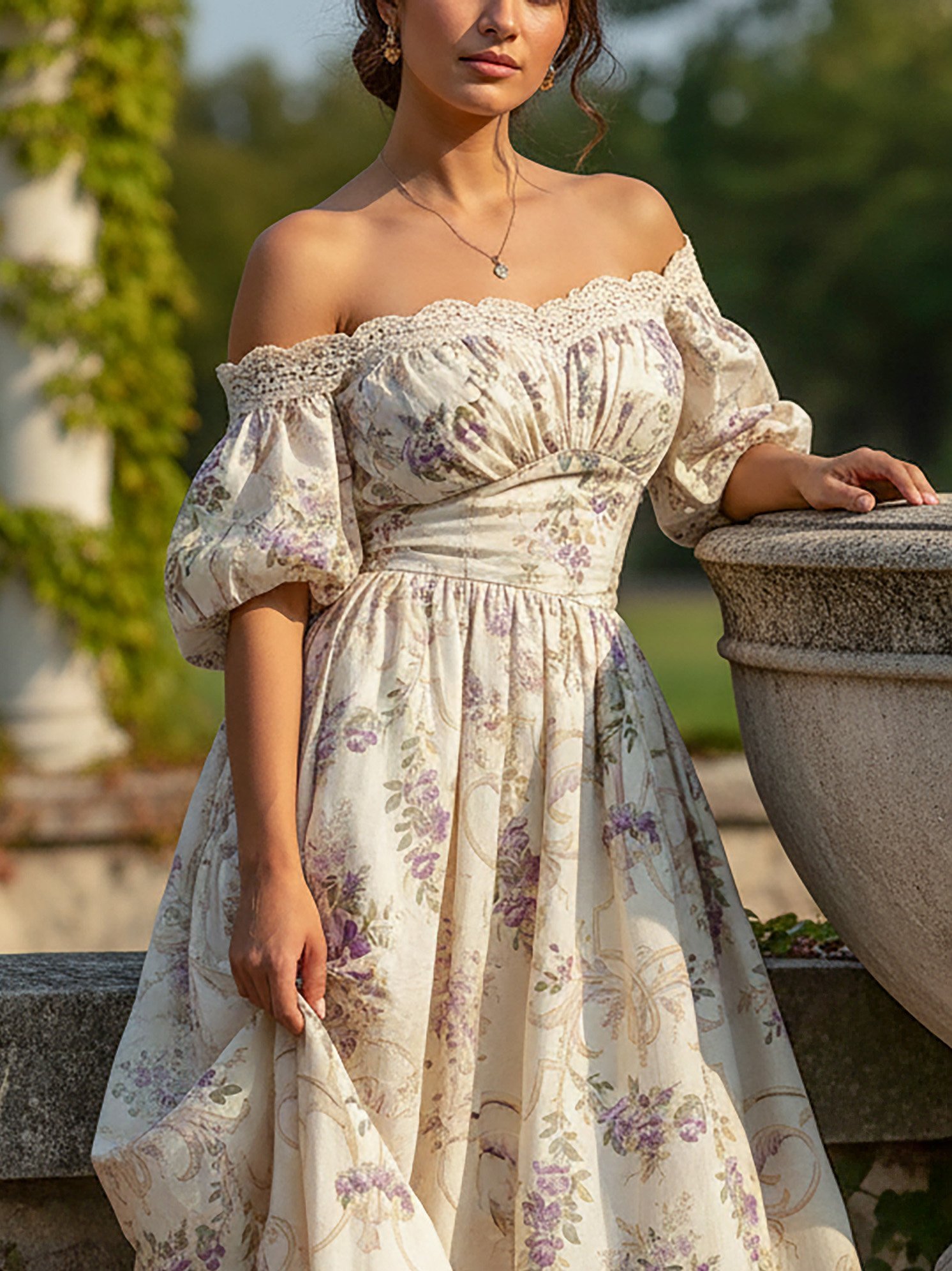 Maxi Linen Dress, Short Sleeves, Off The Shoulder, Floral, Lace, Vintage, White
