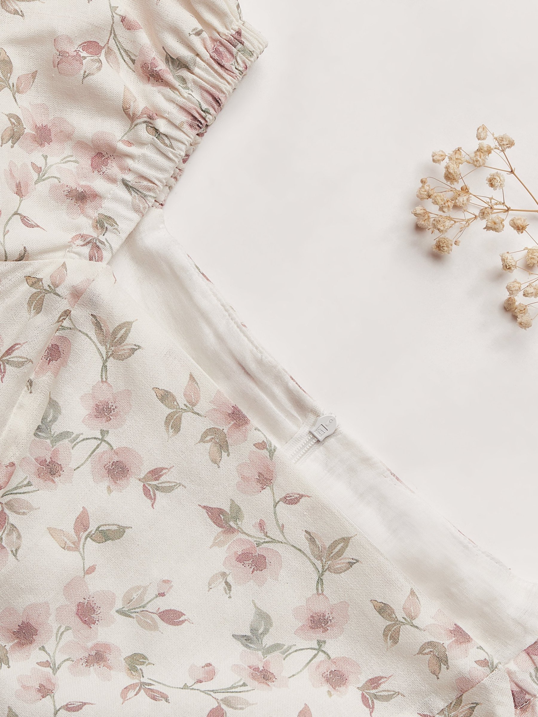Maxi Linen Dress, Square Neck, Regency Era, Linen Blend, Floral, Pink