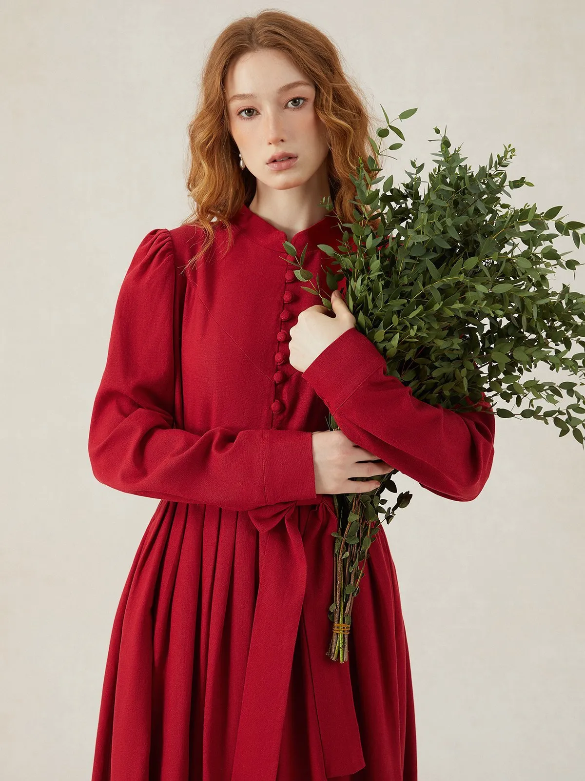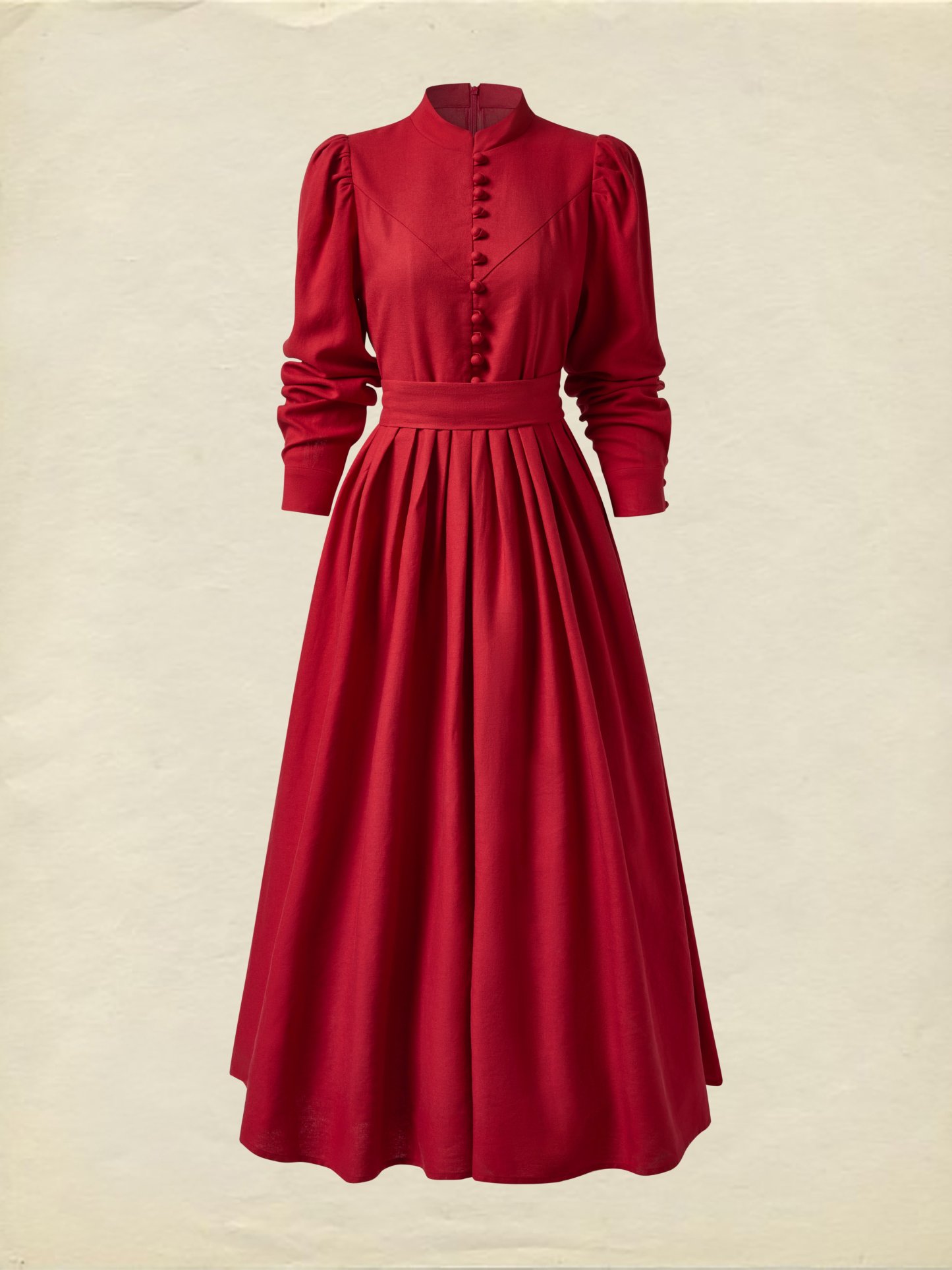Linen Maxi Dress, Long Sleeves, Stand Collar, Belt, Red,Broochless,Vintage