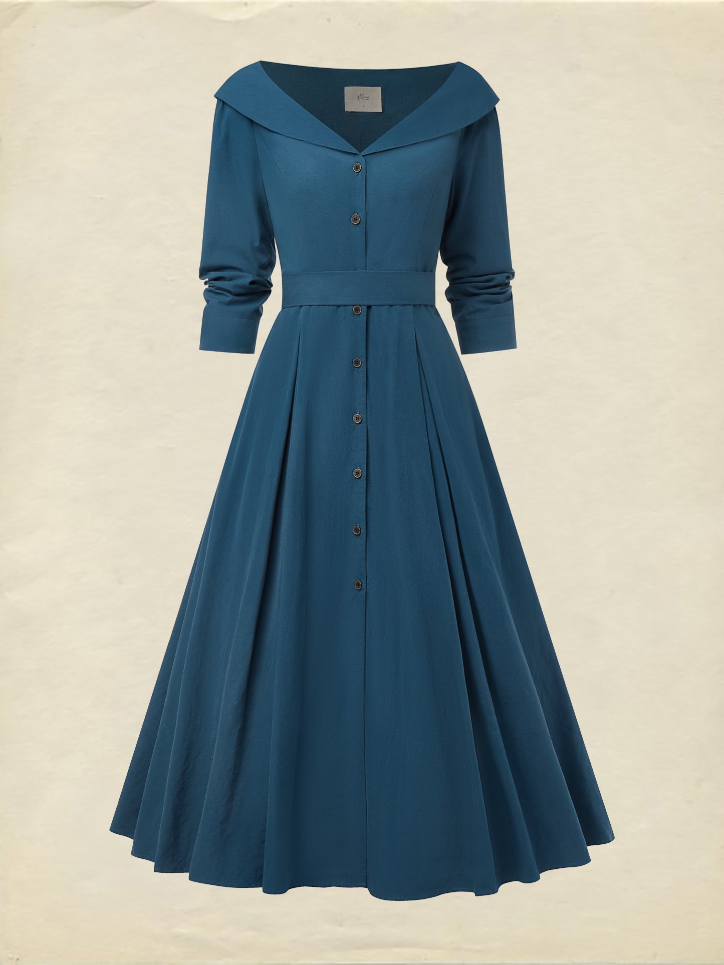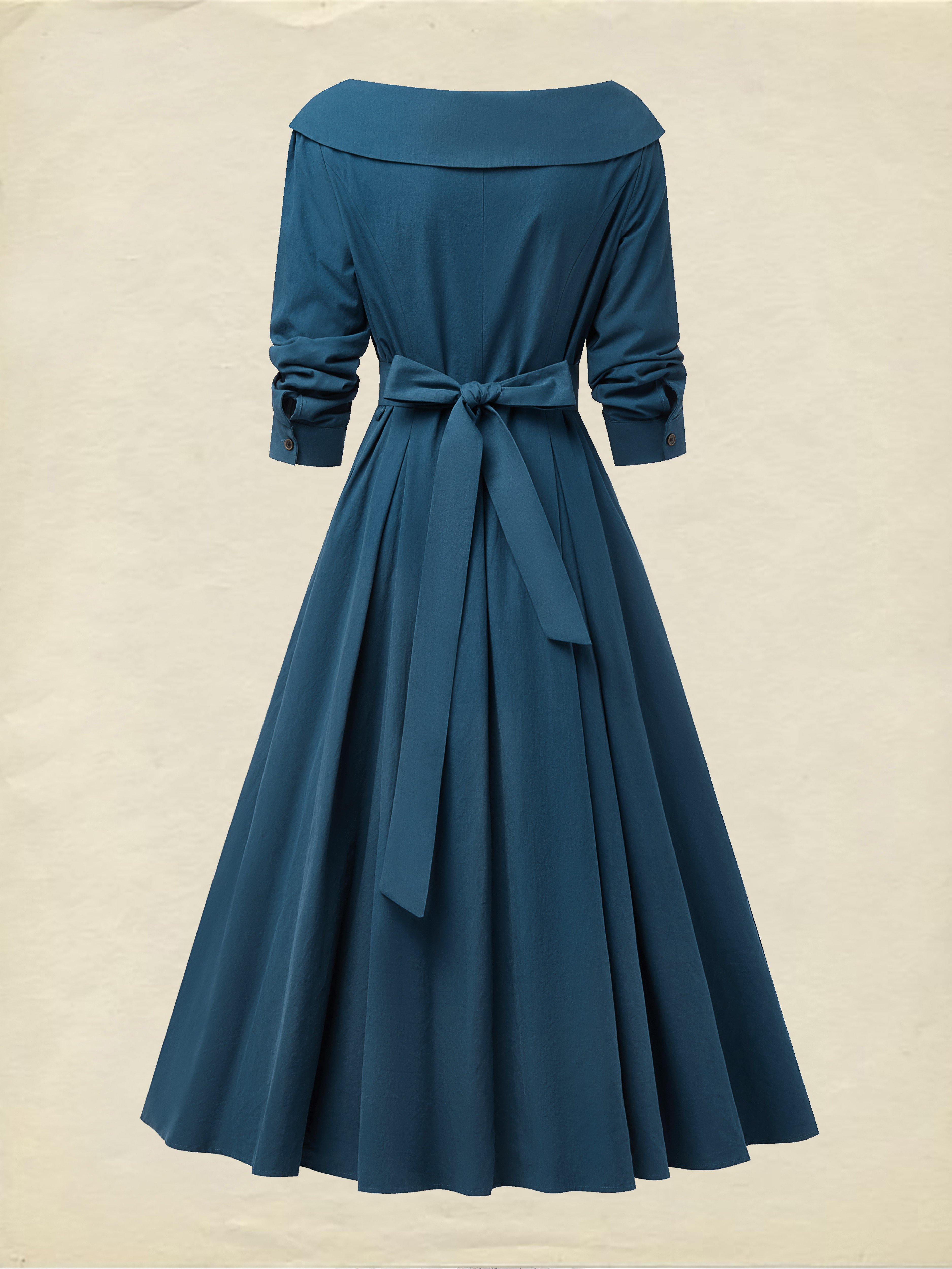 Midi Cotton Dress, Half Sleeve, V Neck, Plain, Button Design, French Vintage, Navyblue