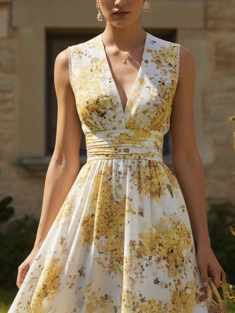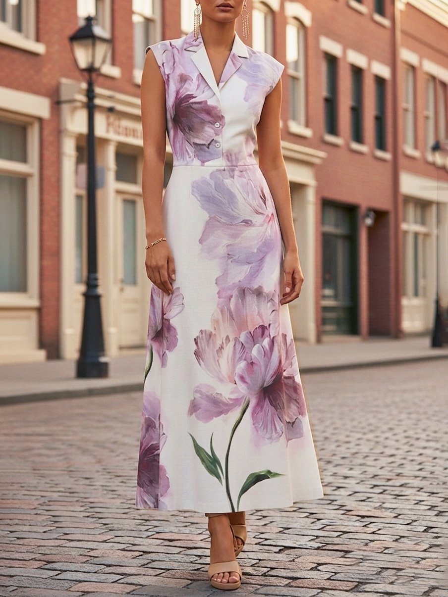 Maxi Linen Dress, Sleeveless, Lapel Collar, Floral, Button Design, Vintage, White