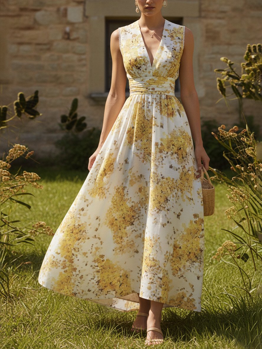 Linen Maxi Dress, Long Sleeves, V Neck, Floral, Apricot,Daily