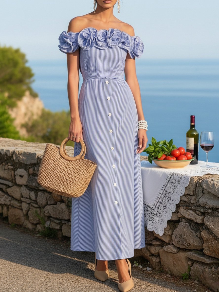 Maxi Cotton Dress, Sleeveless, Off The Shoulder, Striped, 3D Floral, Vacation, Vintage, Blue