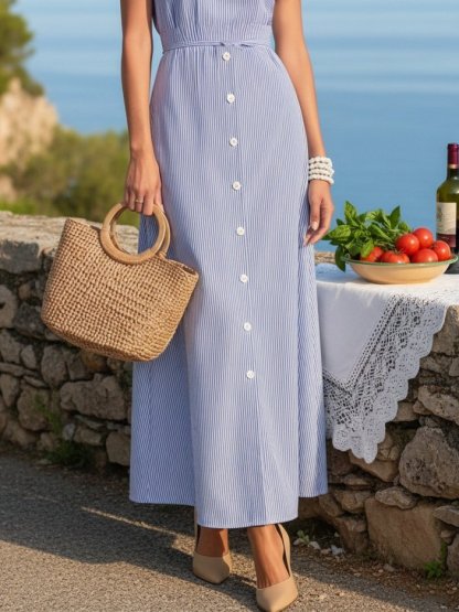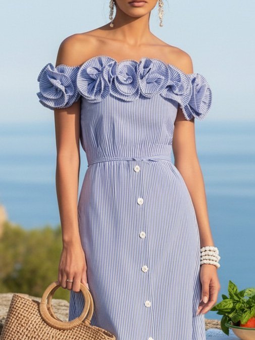 Maxi Cotton Dress, Sleeveless, Off The Shoulder, Striped, 3D Floral, Vacation, Vintage, Blue