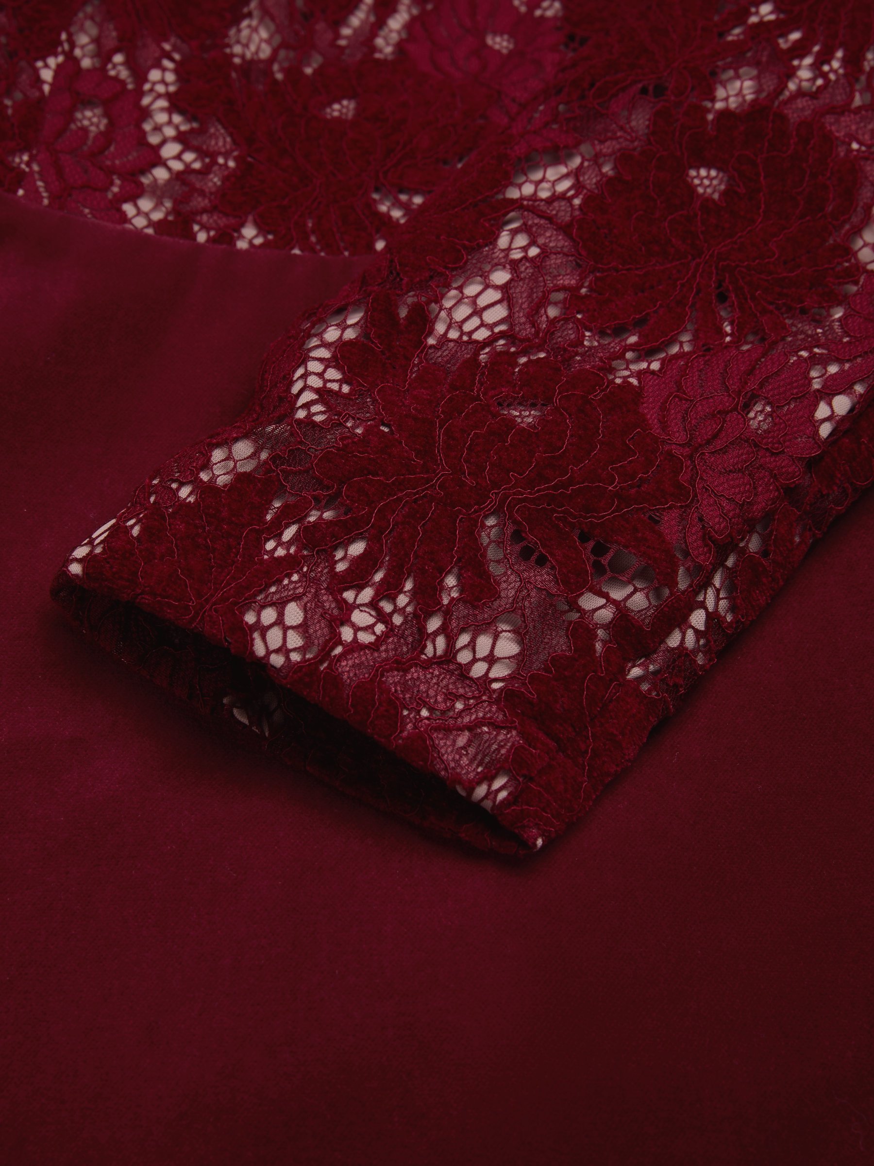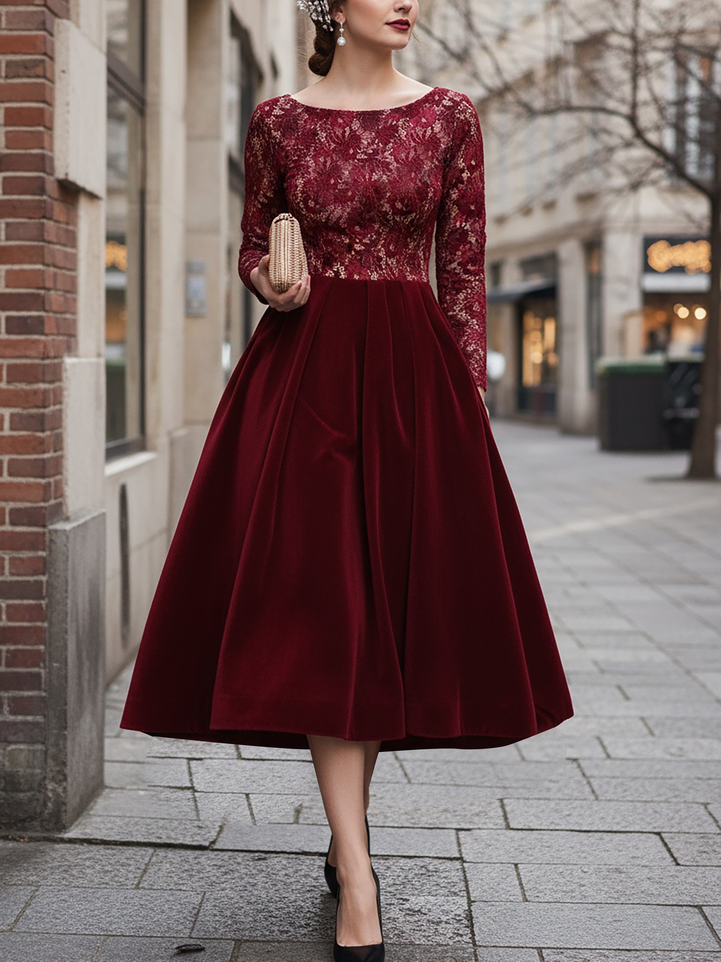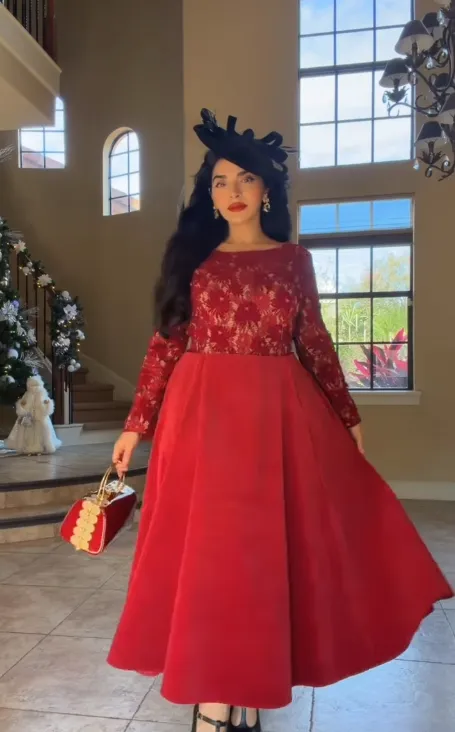 Midi Cotton Dress, Long Sleeves, Round Neck, Floral, Lace, Vintage, Red