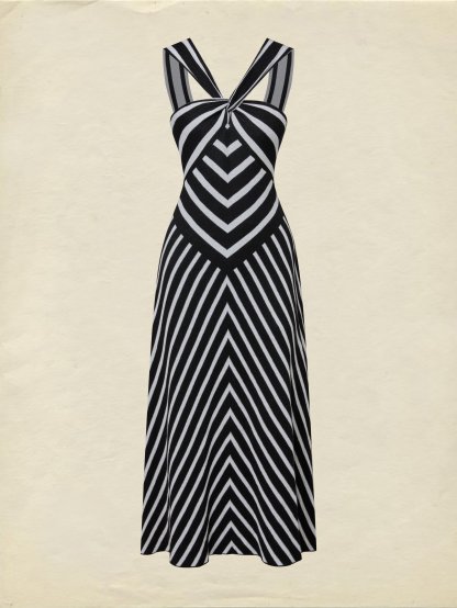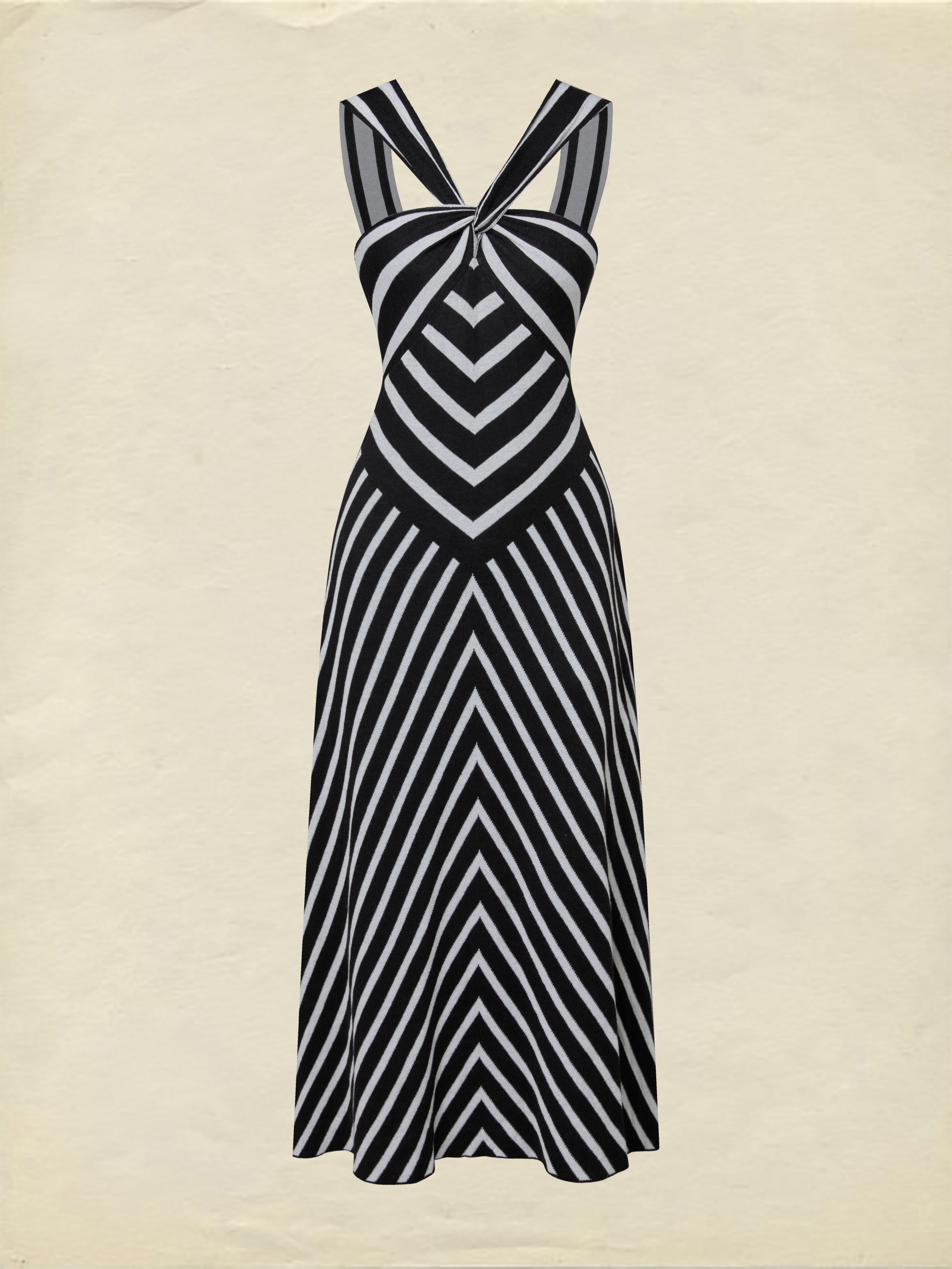 Maxi Sweater Dress, Sleeveless, V Neck, Striped, , French Vintage, Black