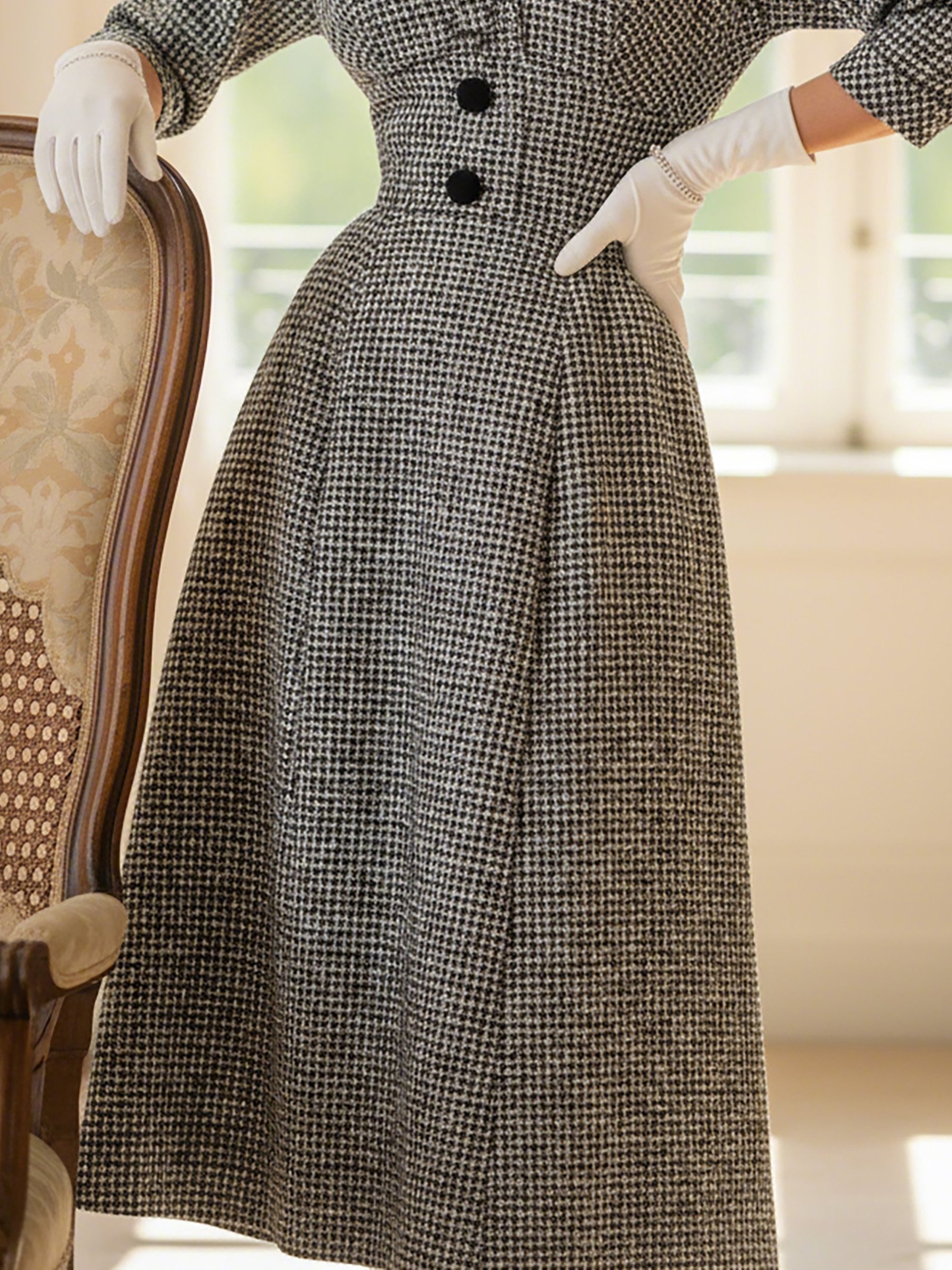 Midi Wool Dress, Half Sleeve, V Neck, Plaid, Belt Design, Vintage, Black