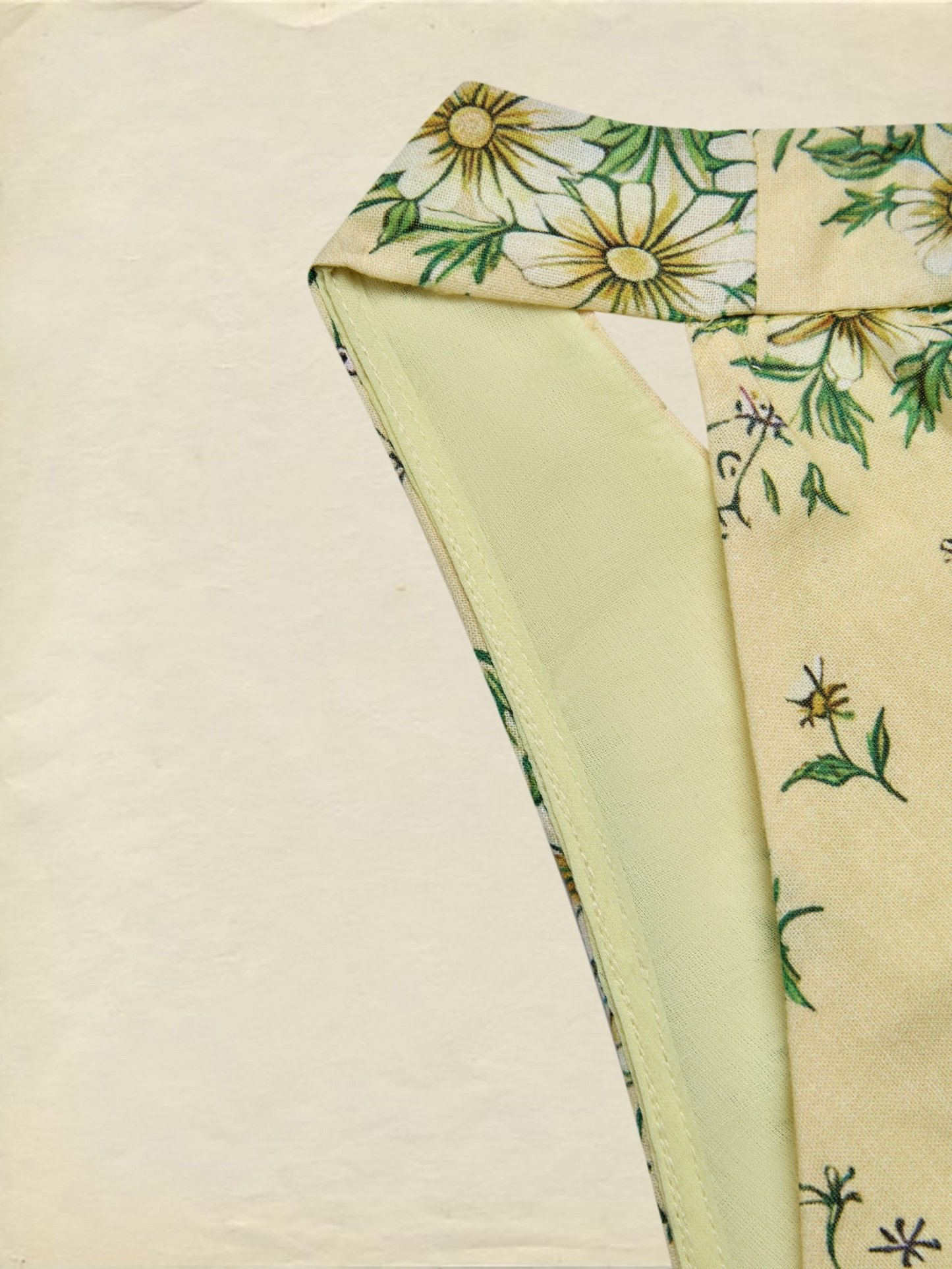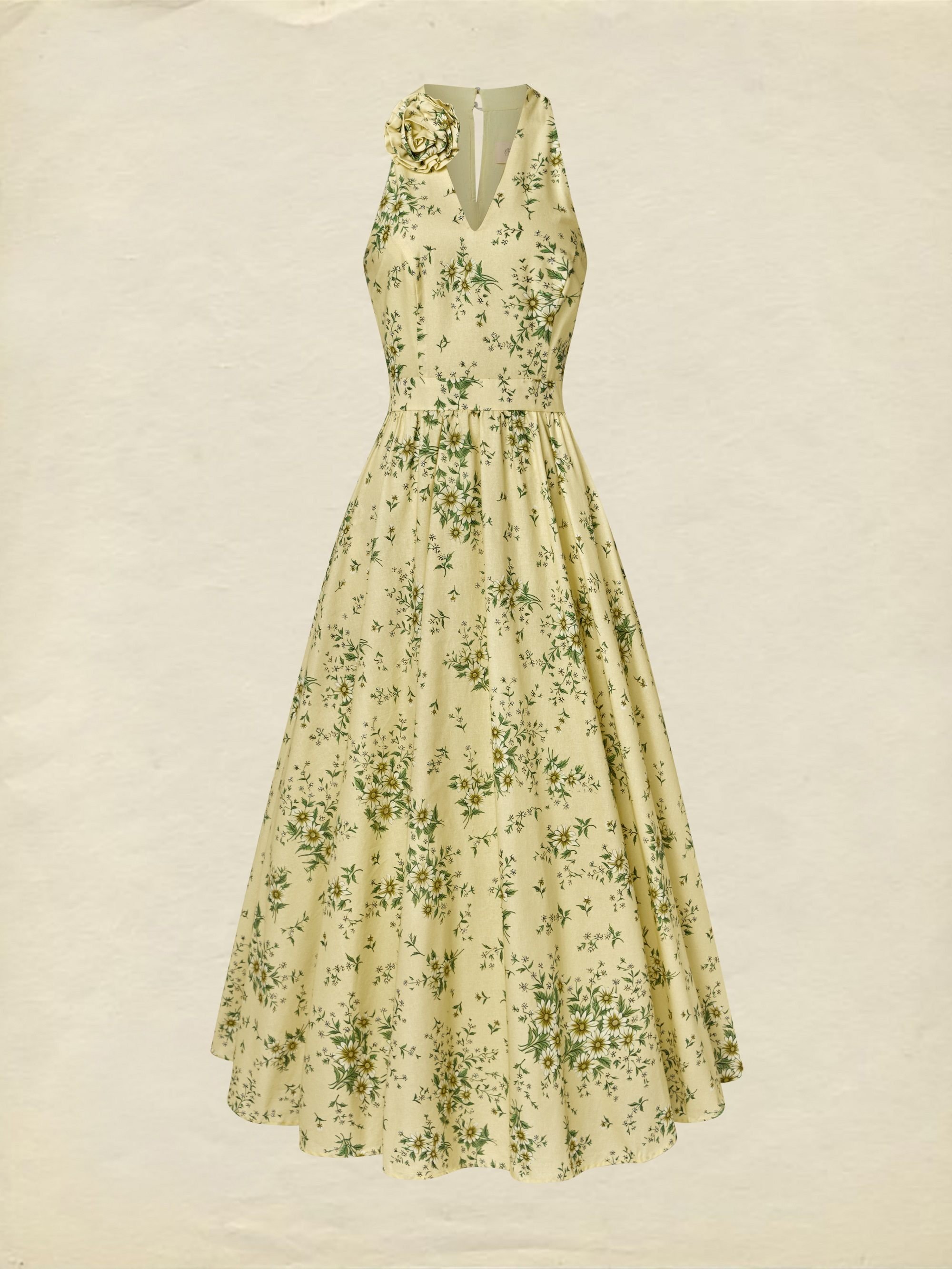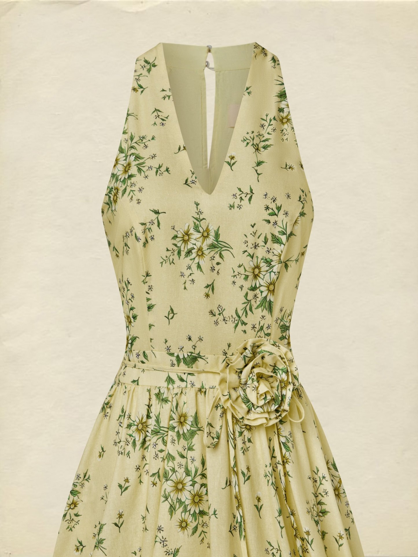 Maxi Cotton Dress, Sleeveless, V Neck, Floral, 3D Floral (Detachable), Vacation, Vintage, Yellow