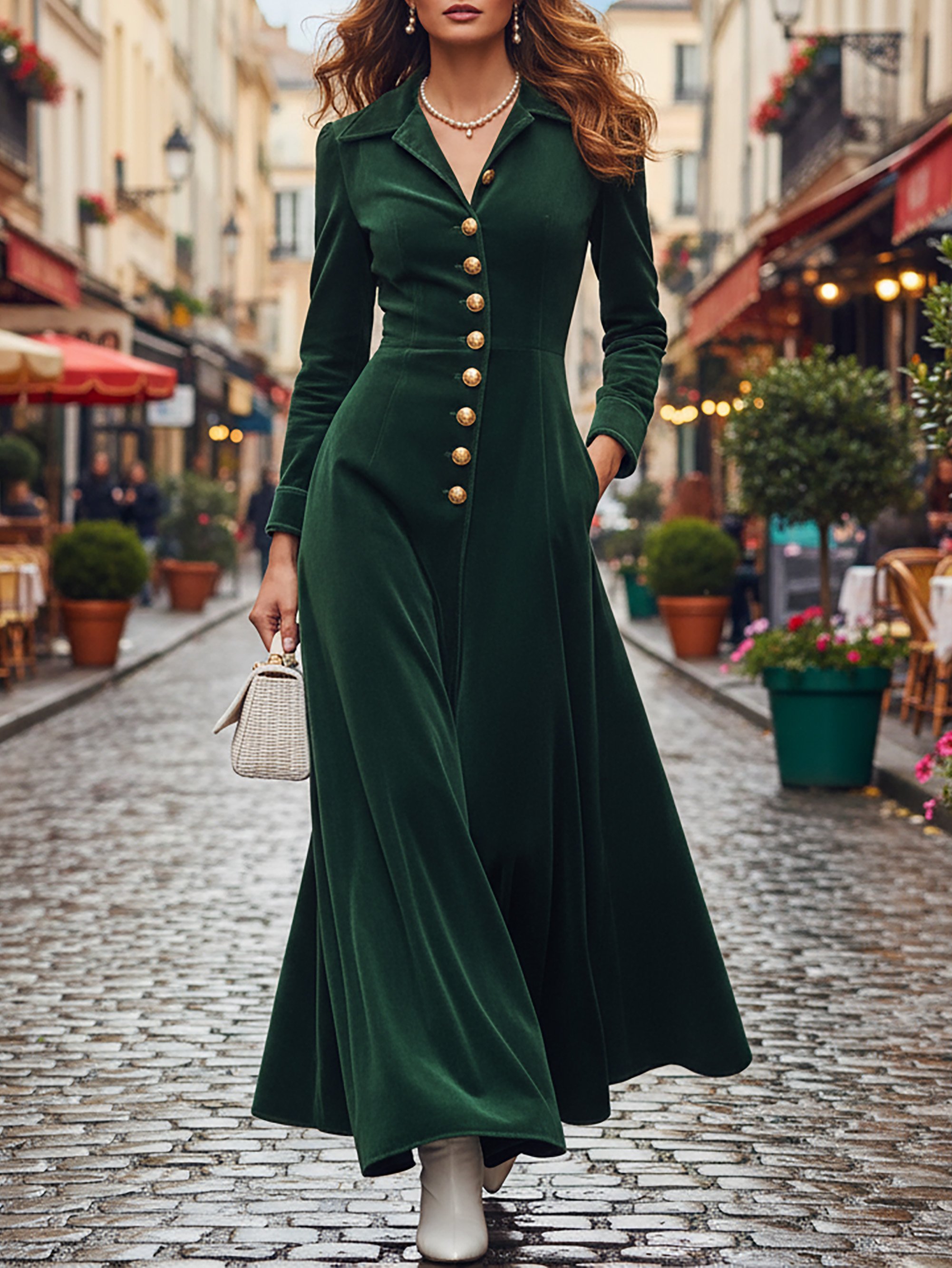 Maxi Cotton Dress, Long Sleeves, Shawl Collar, Plain, Button Design, Vintage, Green