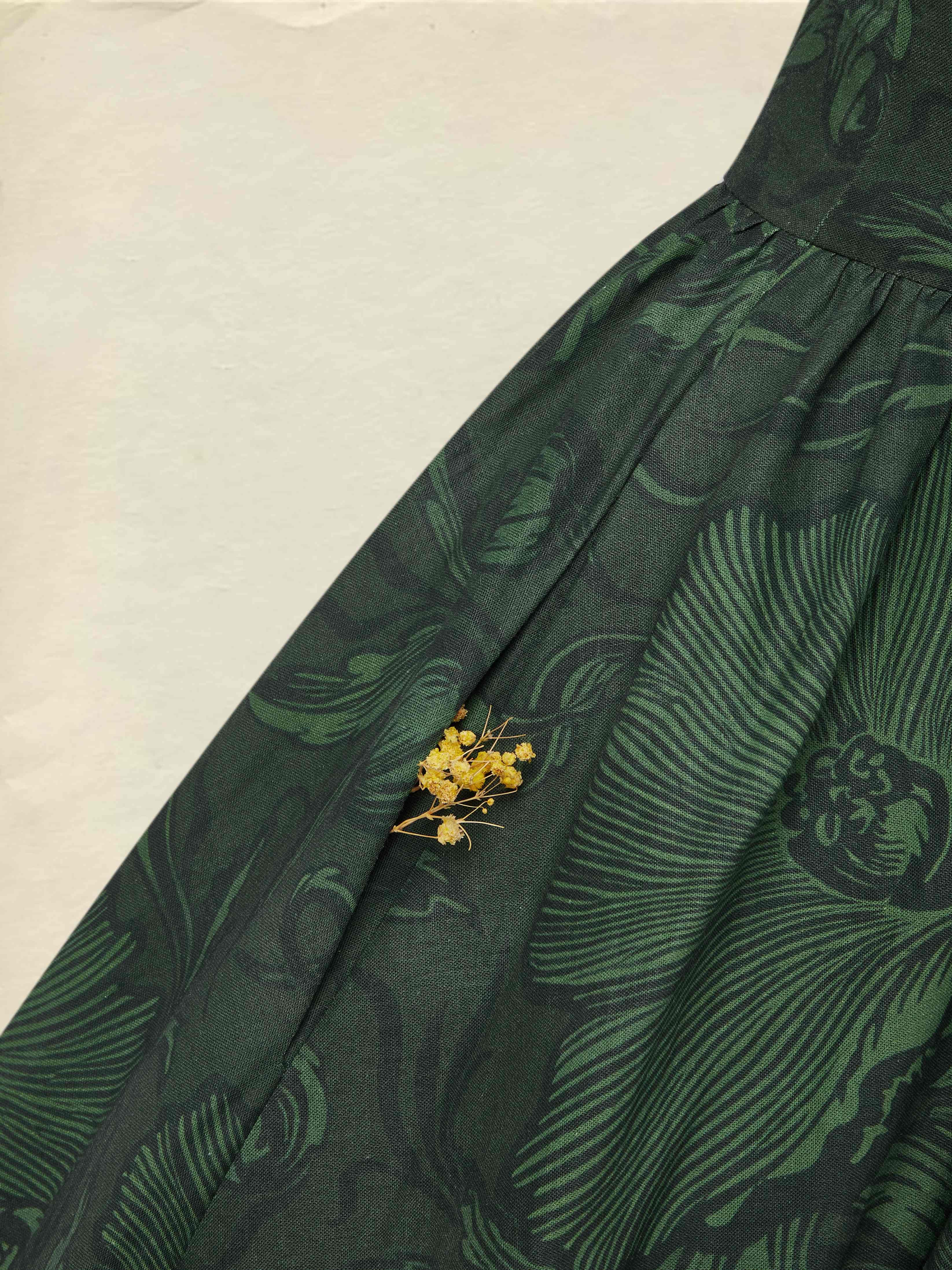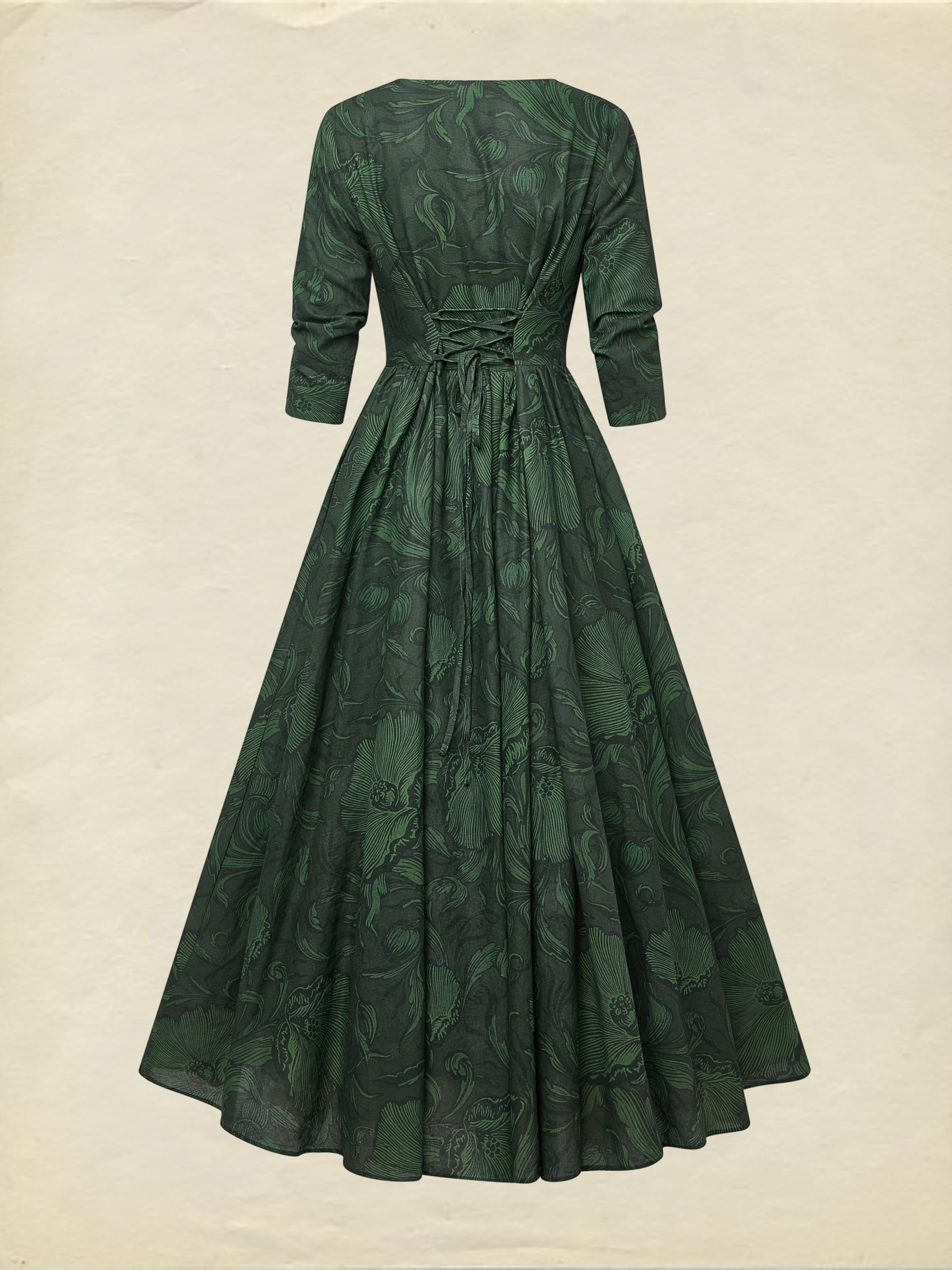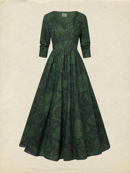 Maxi Linen Dress, Half Sleeve, V Neck, Floral, Vacation, Vintage, Deep Green