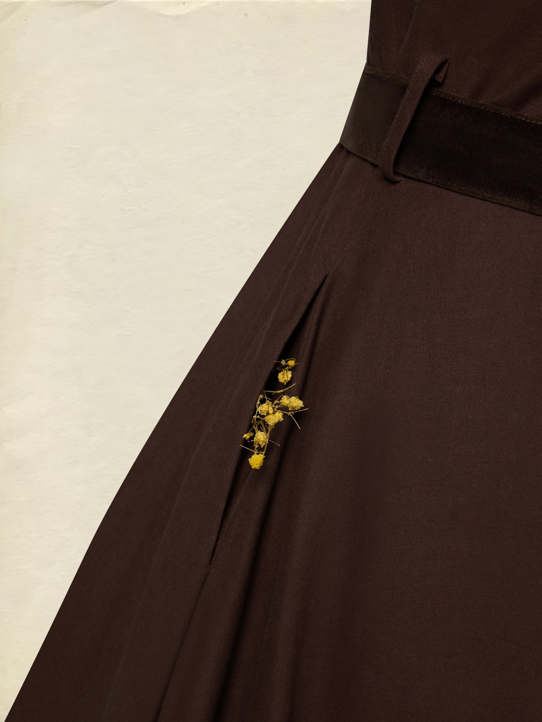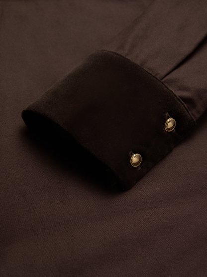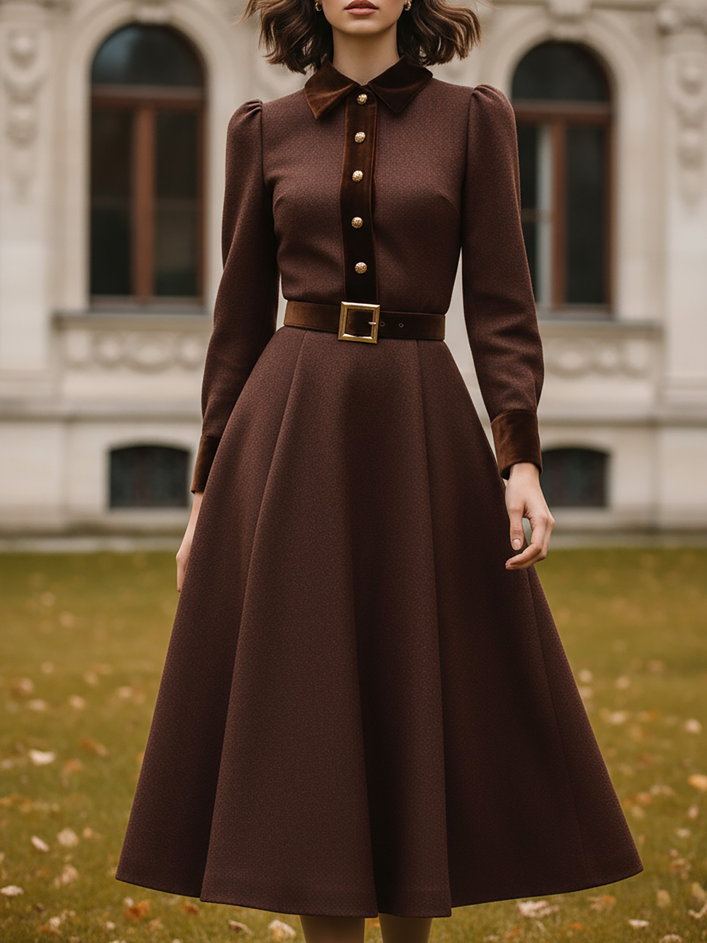 Midi Cotton Dress, Long Sleeves, Shawl Collar, Plain, Belt Design, Vintage, Coffee