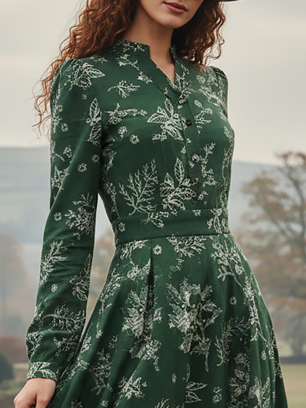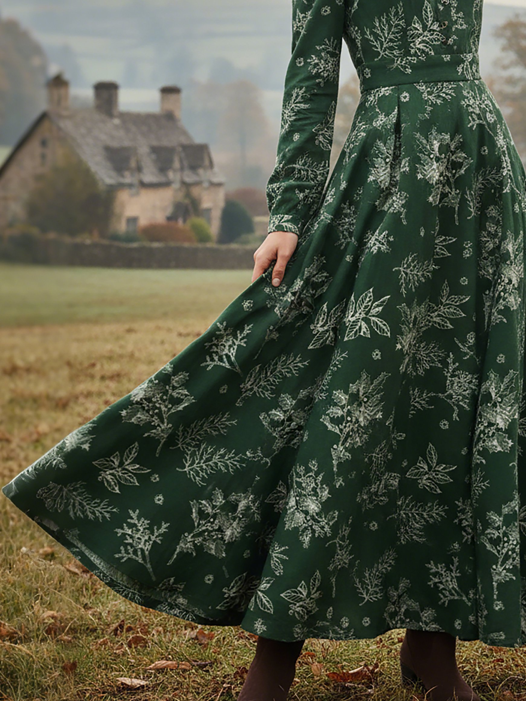 Maxi Linen Dress, Long Sleeves, V Neck, Floral, Button Design, Vintage, Dark Green