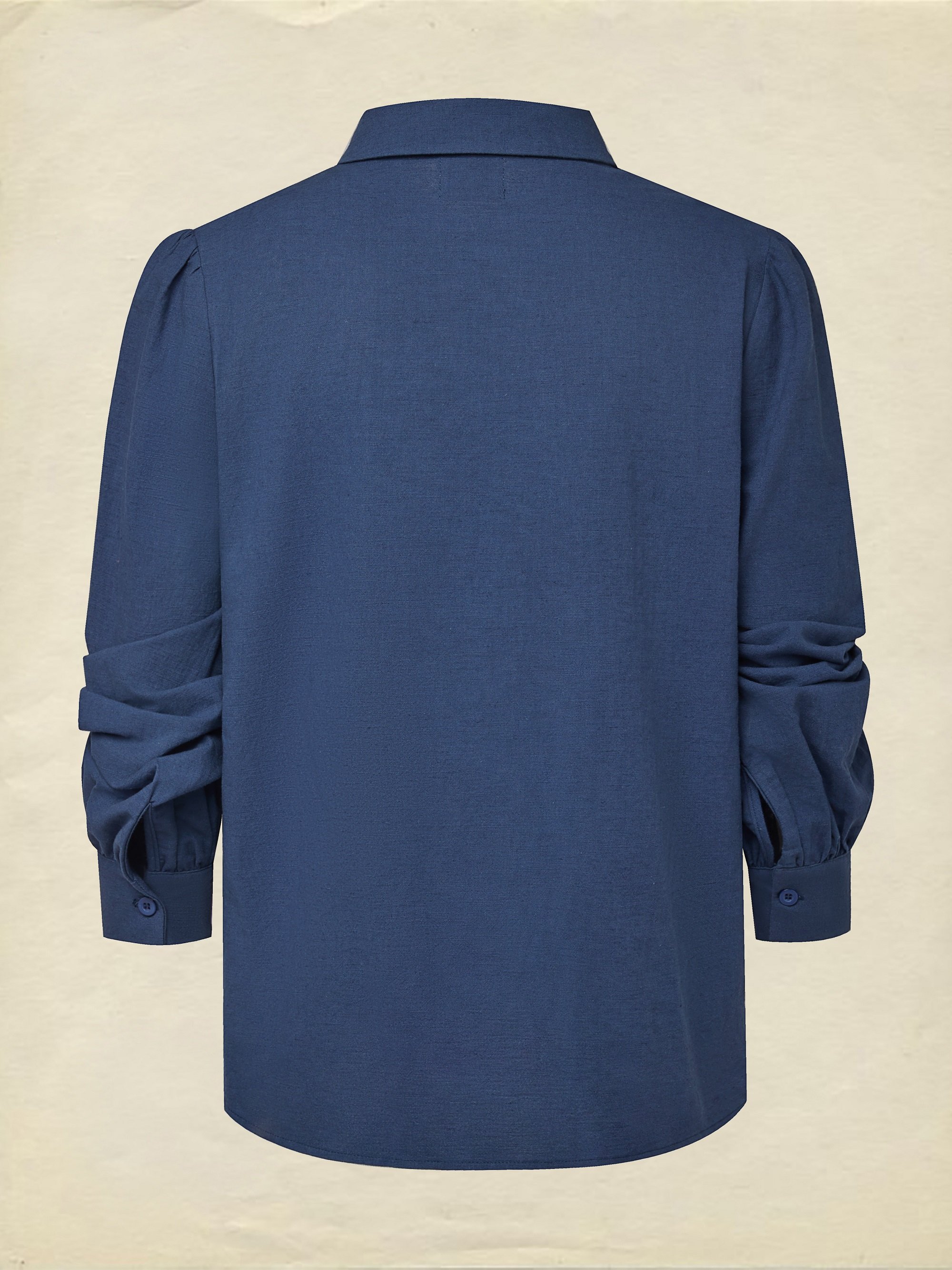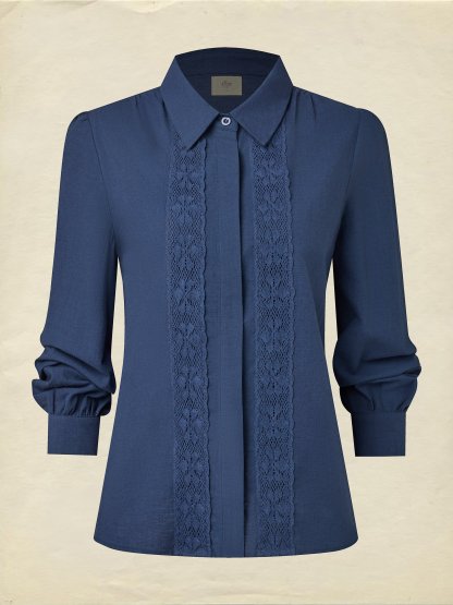 Linen Shirt, Long Sleeves, Shawl Collar, Plain, Lace, Vintage, Blue