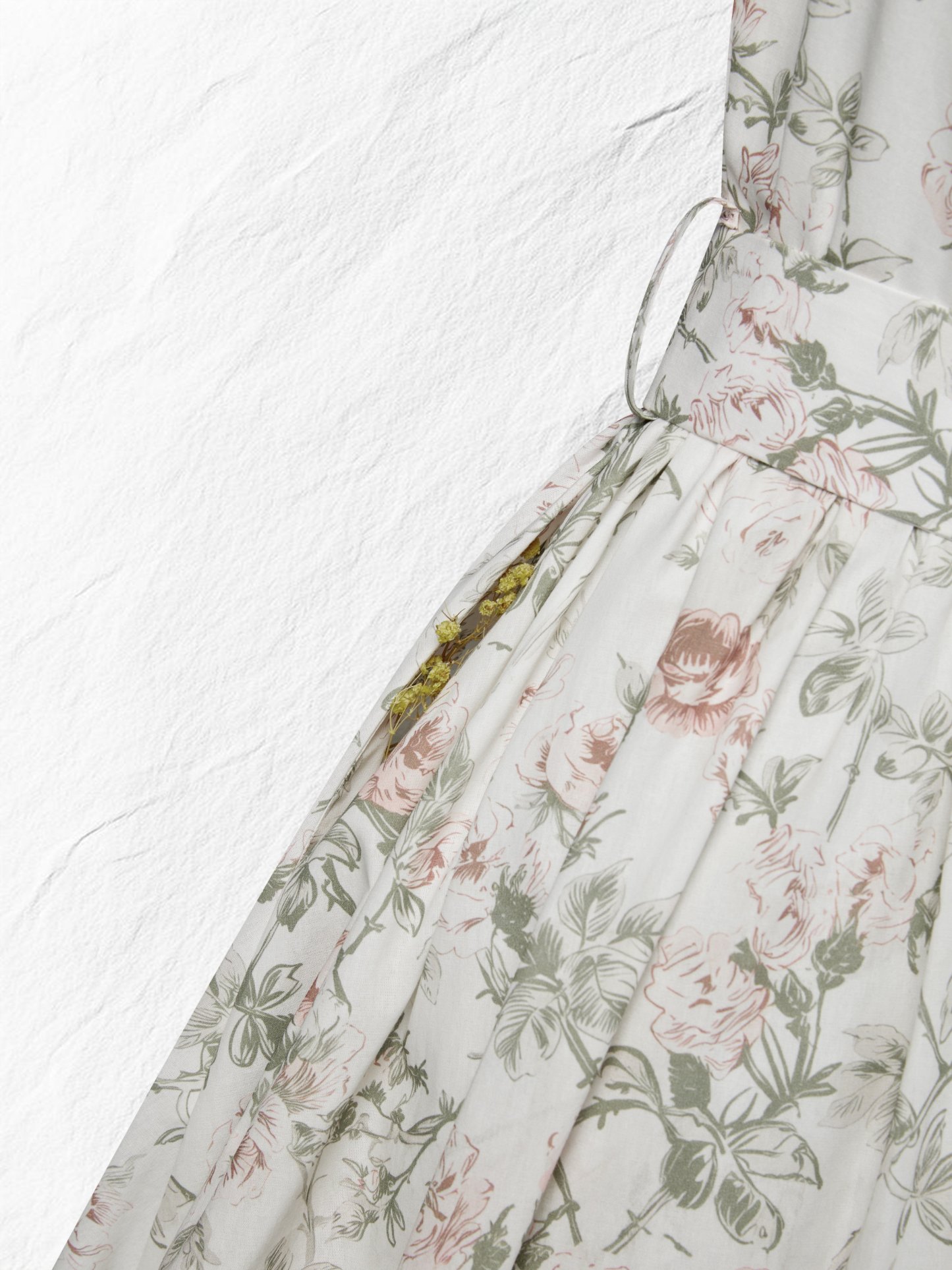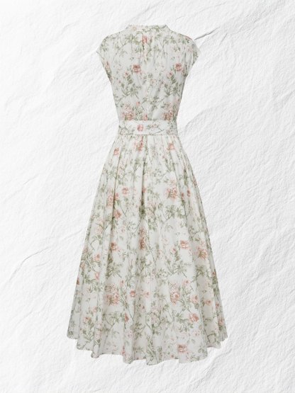 Midi Cotton Dress, Cap Sleeves, Round Neck, Floral, Belt Design, Vintage, Apricot