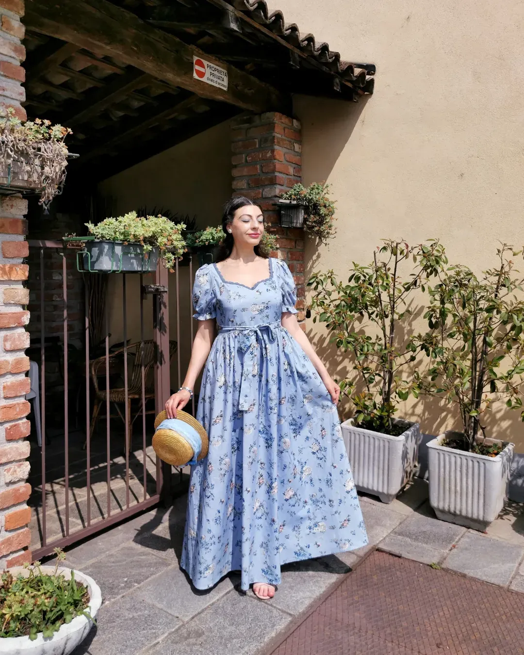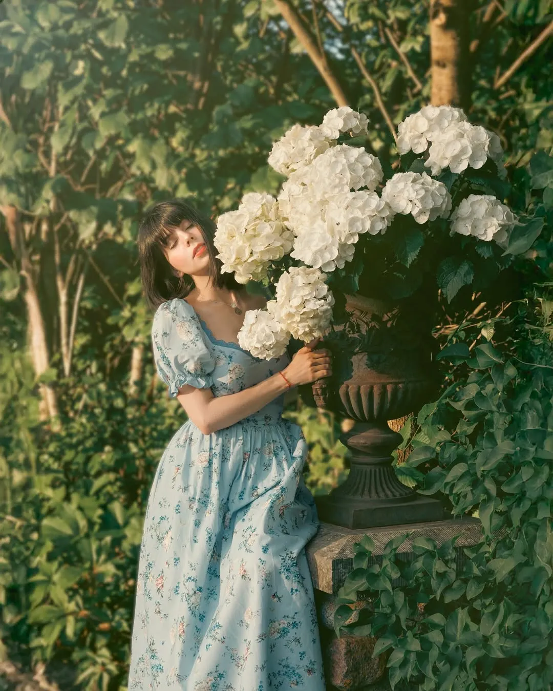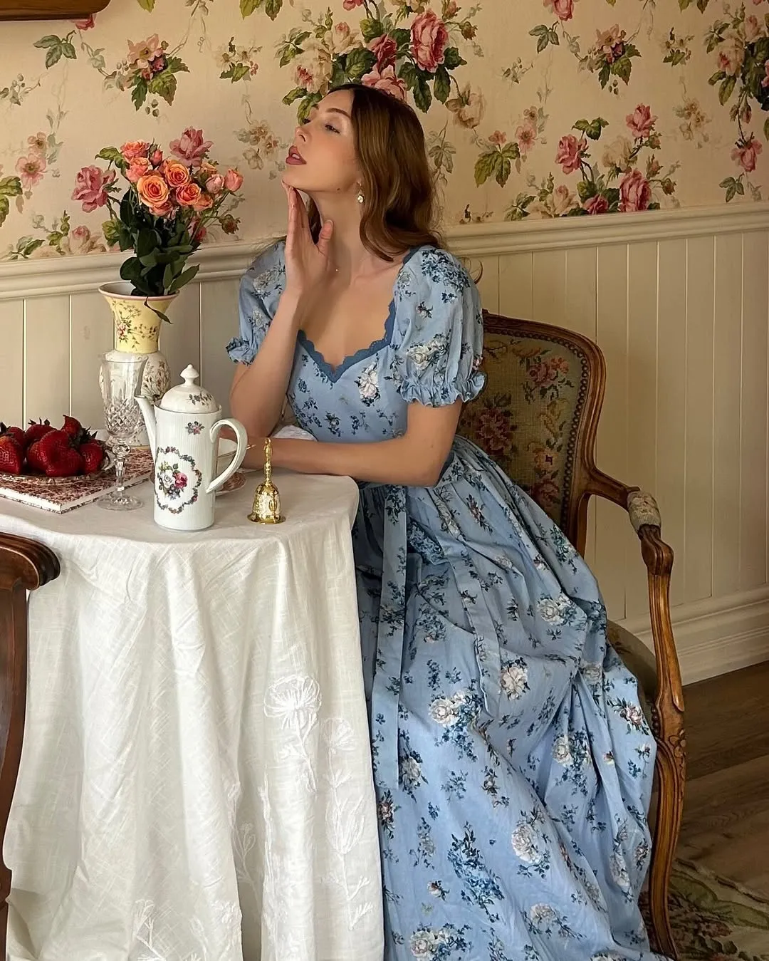 As you walk down a country path, the pale blue sky and blooming wildflowers draw your gaze. A gentle breeze sets the blue blossoms swaying among the green leaves, painting a dreamy picture. This dress captures that vision—a soft sky blue, blooming with wildflower prints. Bubble sleeves and lace add a delicate charm, bringing to mind the romance of a fragrant countryside.