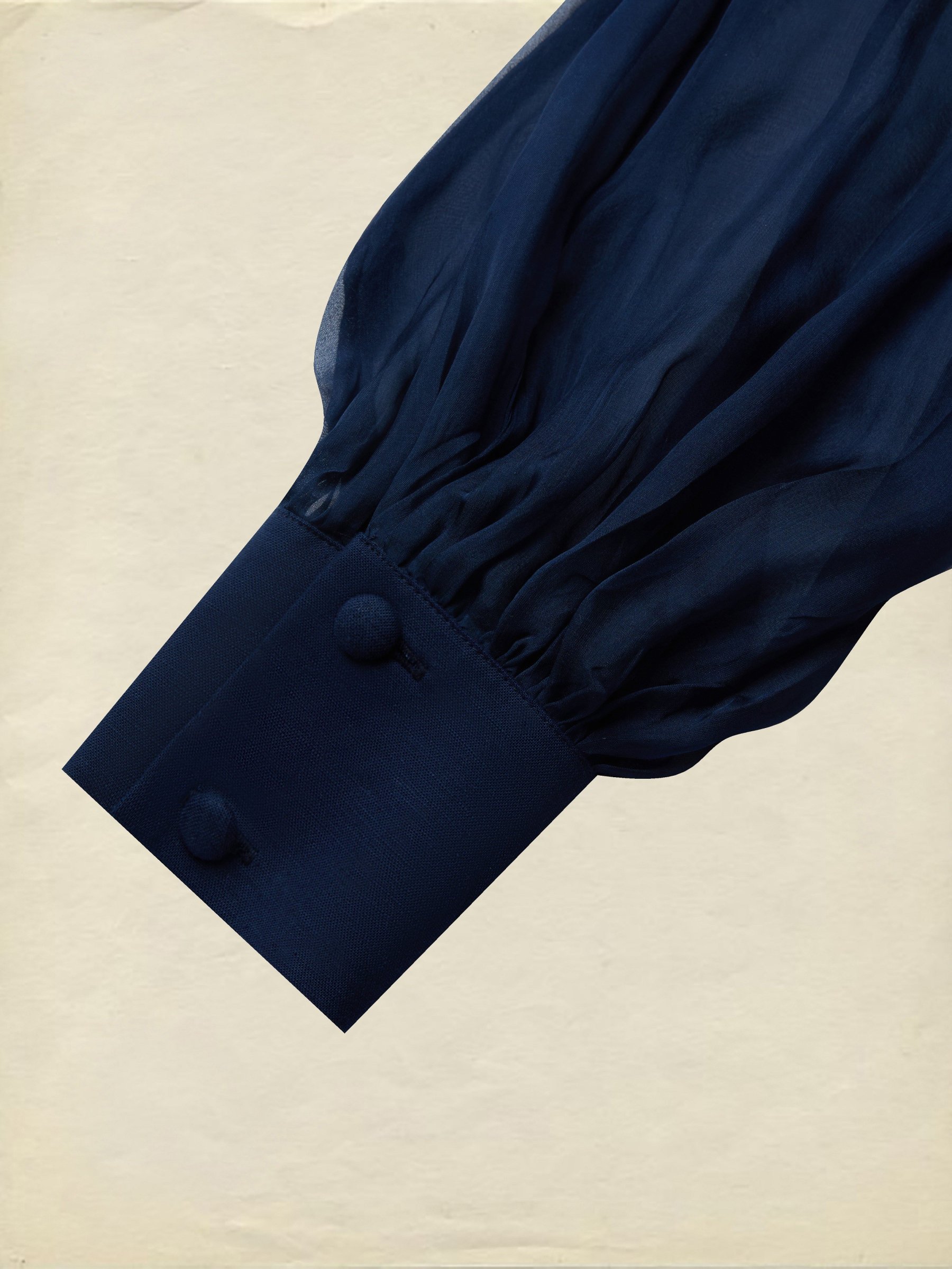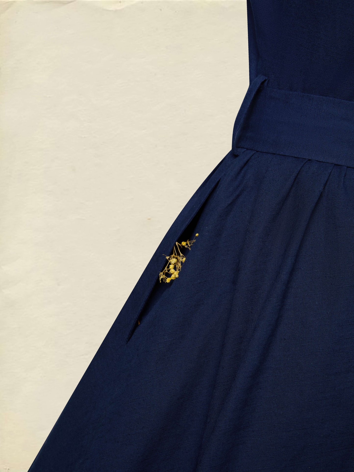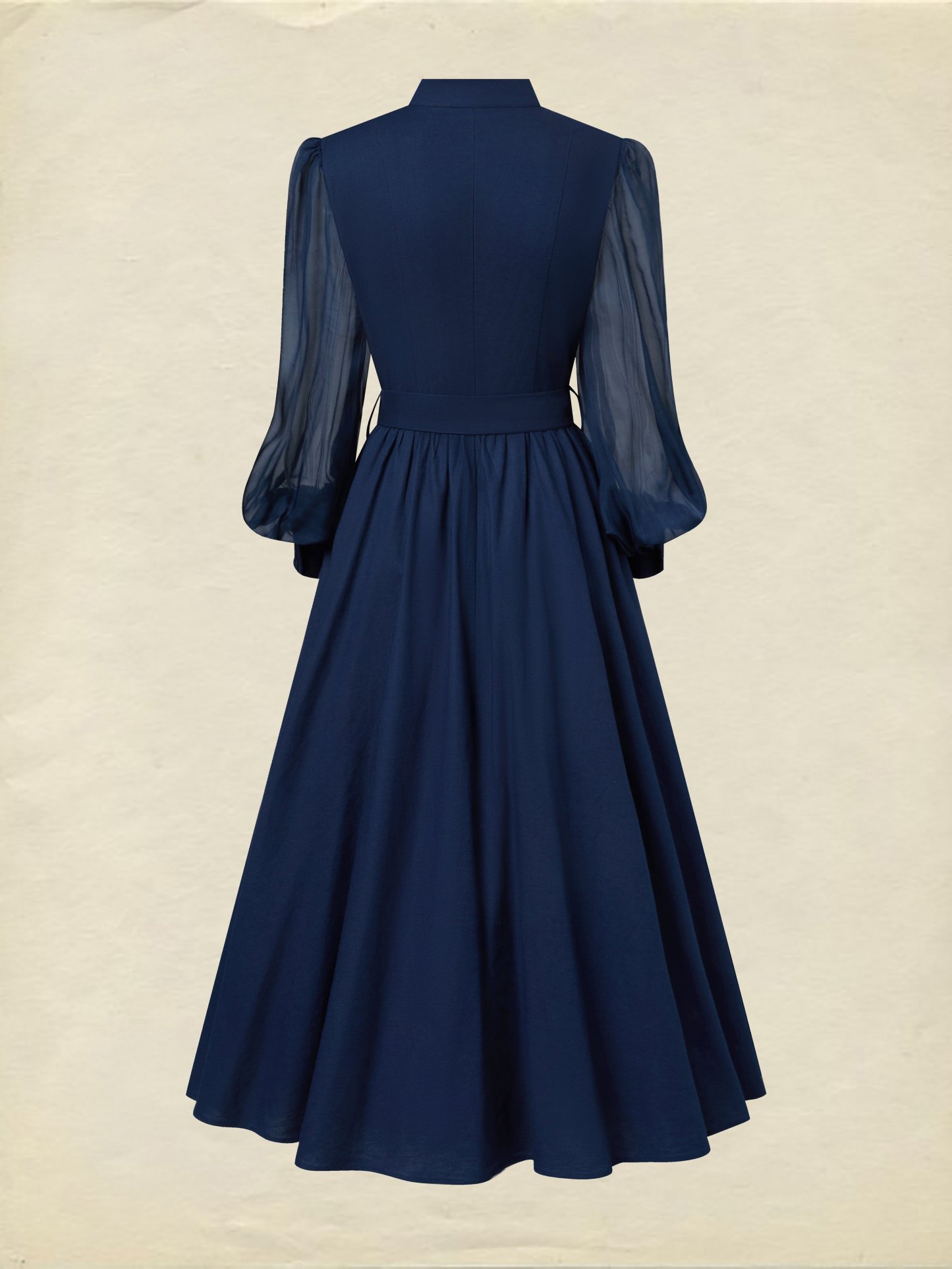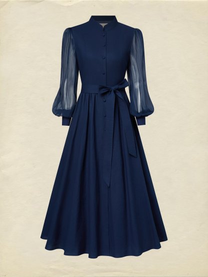 Maxi Cotton Dress, Long Sleeves, Stand Collar, Plain, Belt Design, French Vintage, Blue Purple