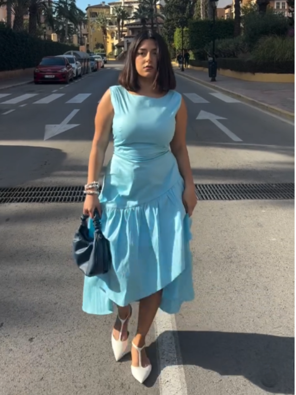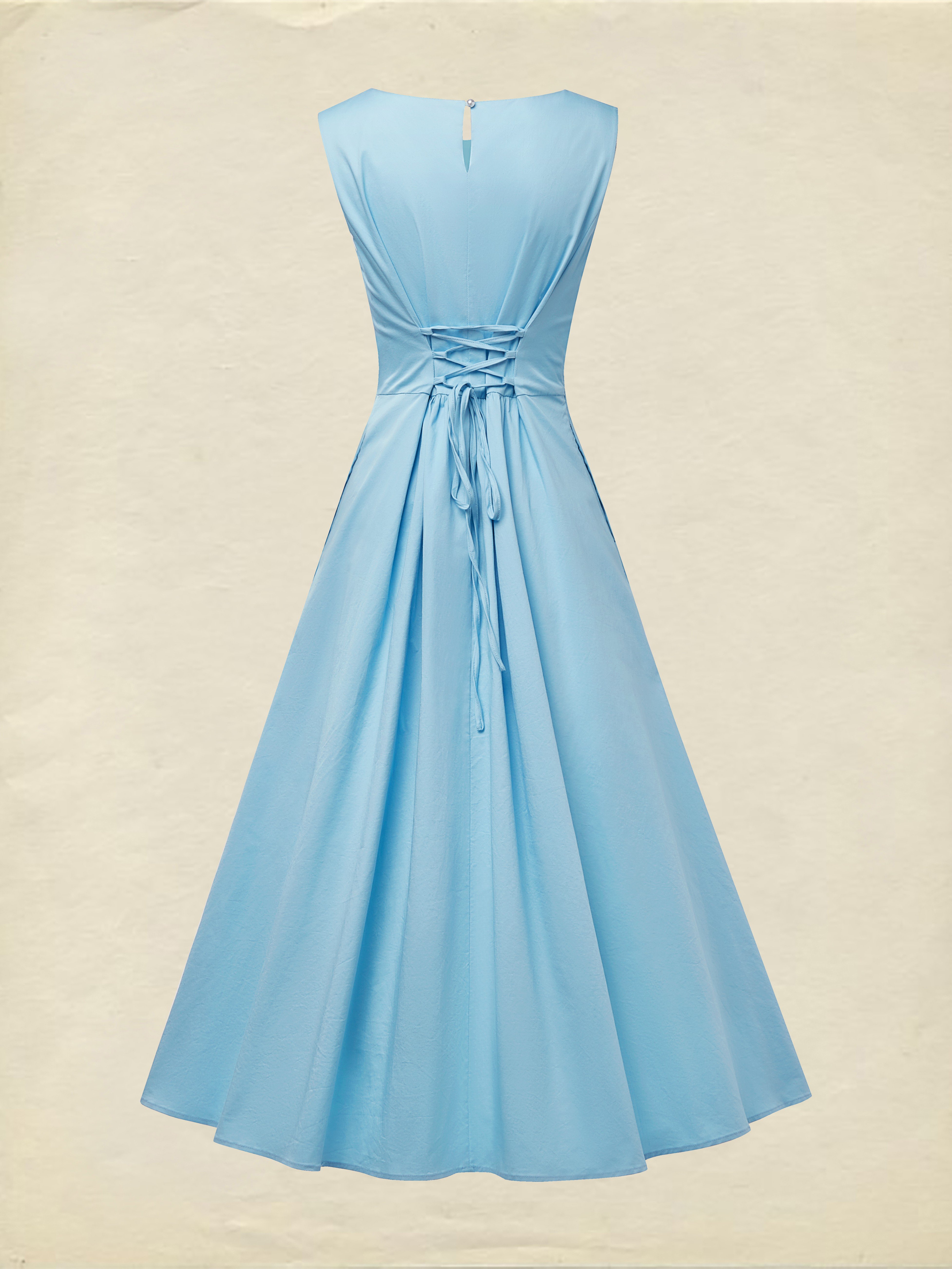 Maxi Cotton Dress , Sleeveless, Round Neck, Plain, Ruffles, French Vintage, Blue