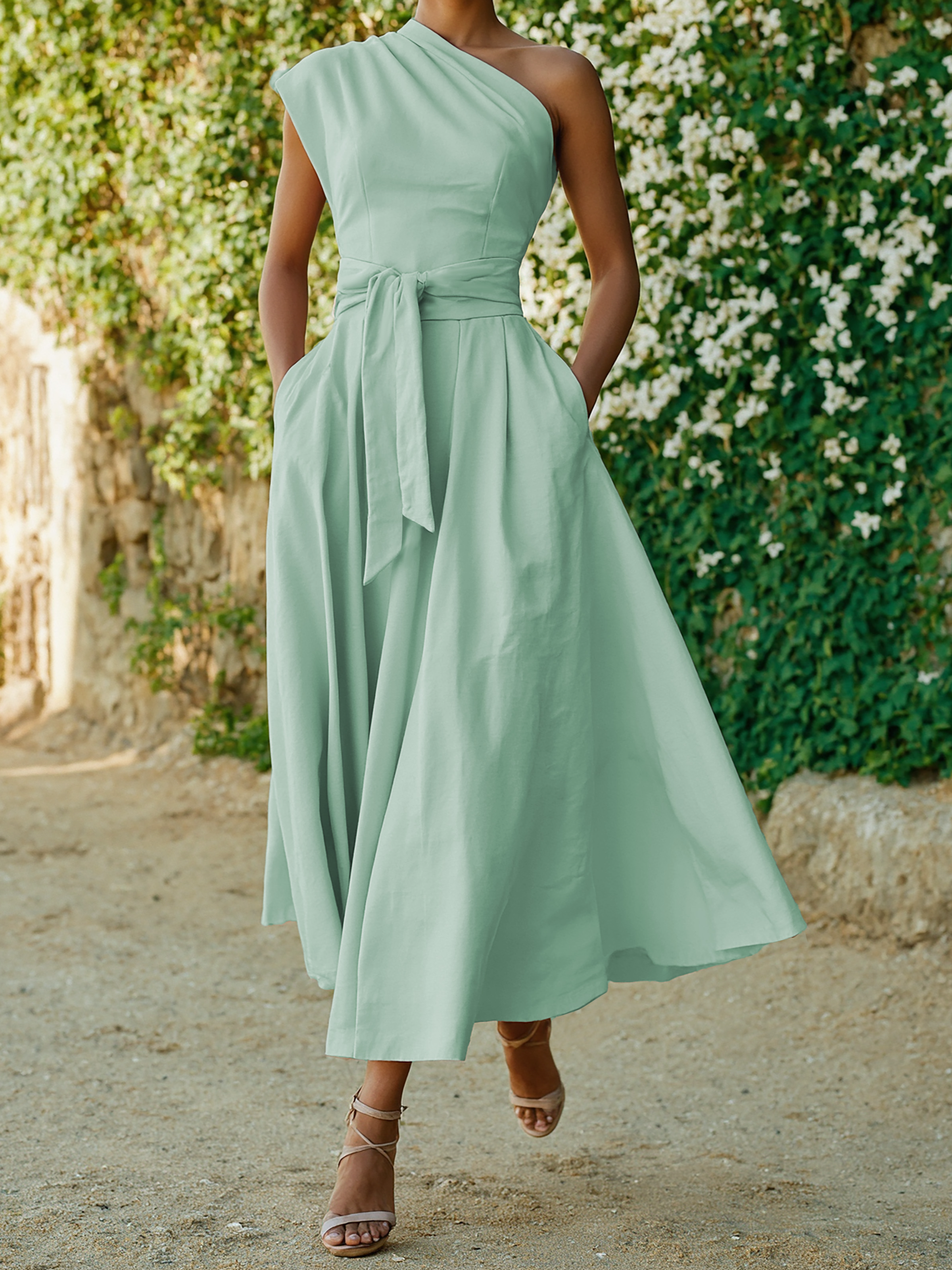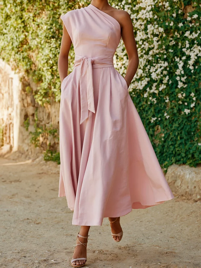 Maxi Cotton Dress , Sleeveless, One shoulder, Plain, Belt Design, Vintage, Light Pink