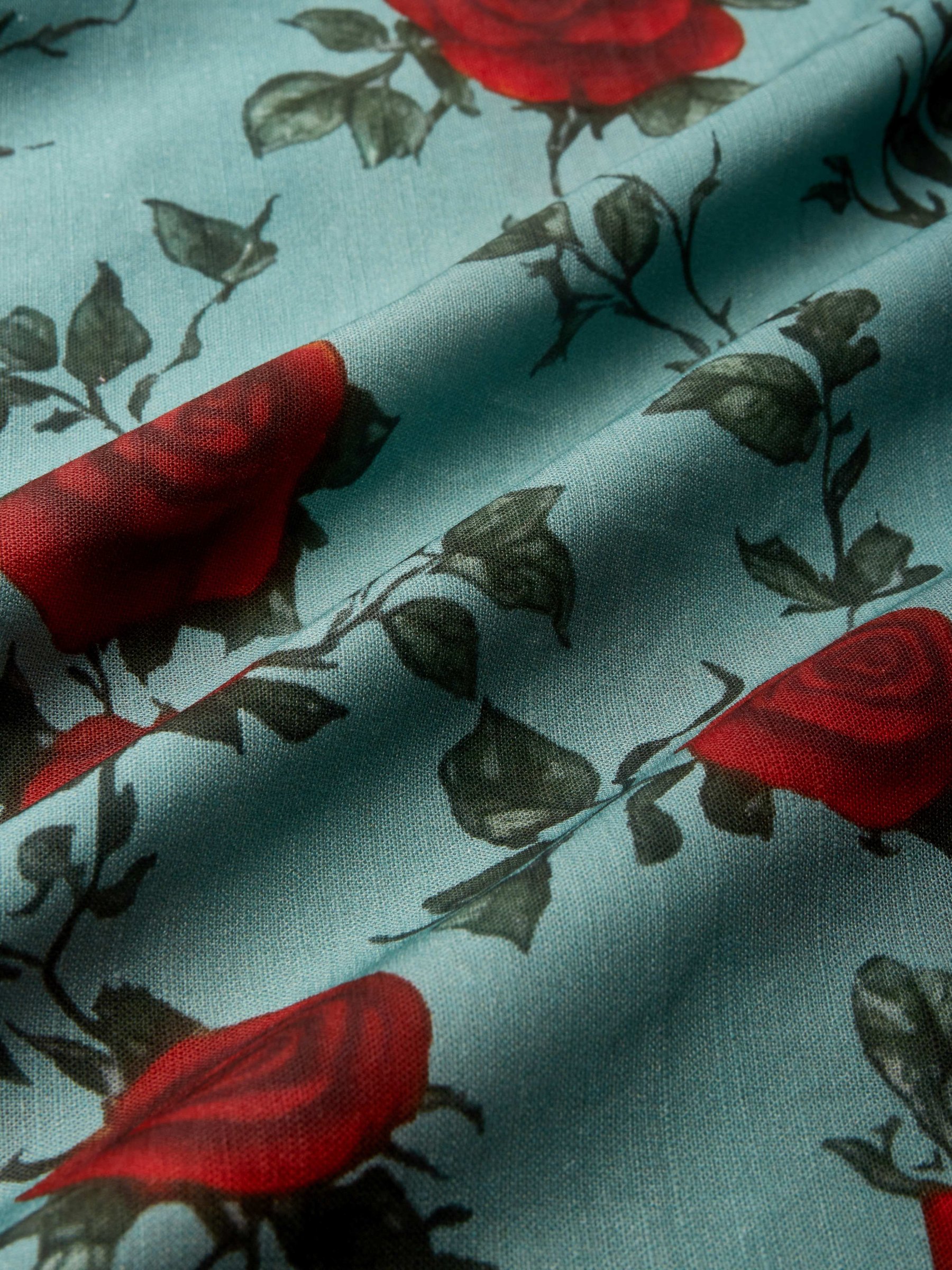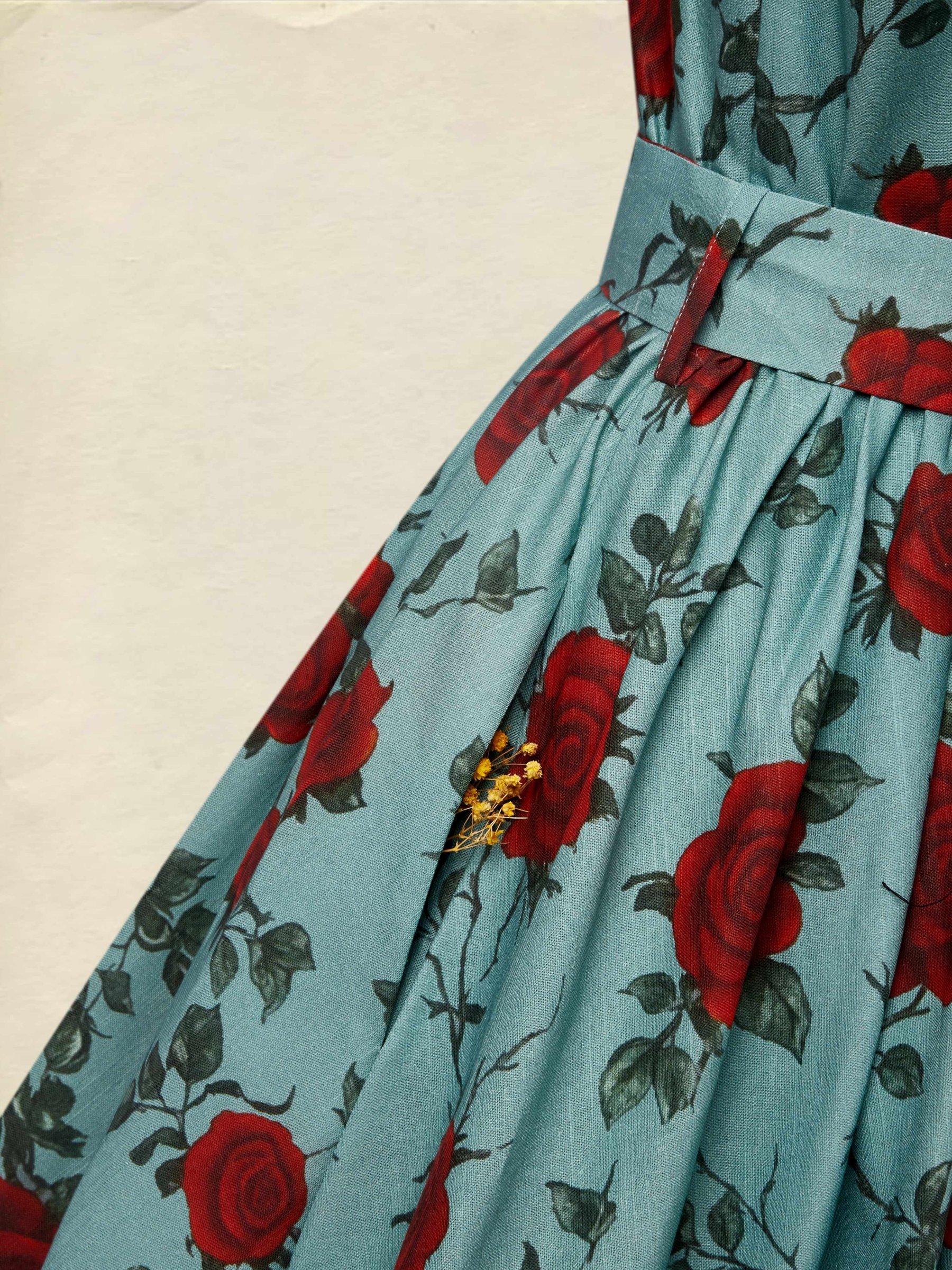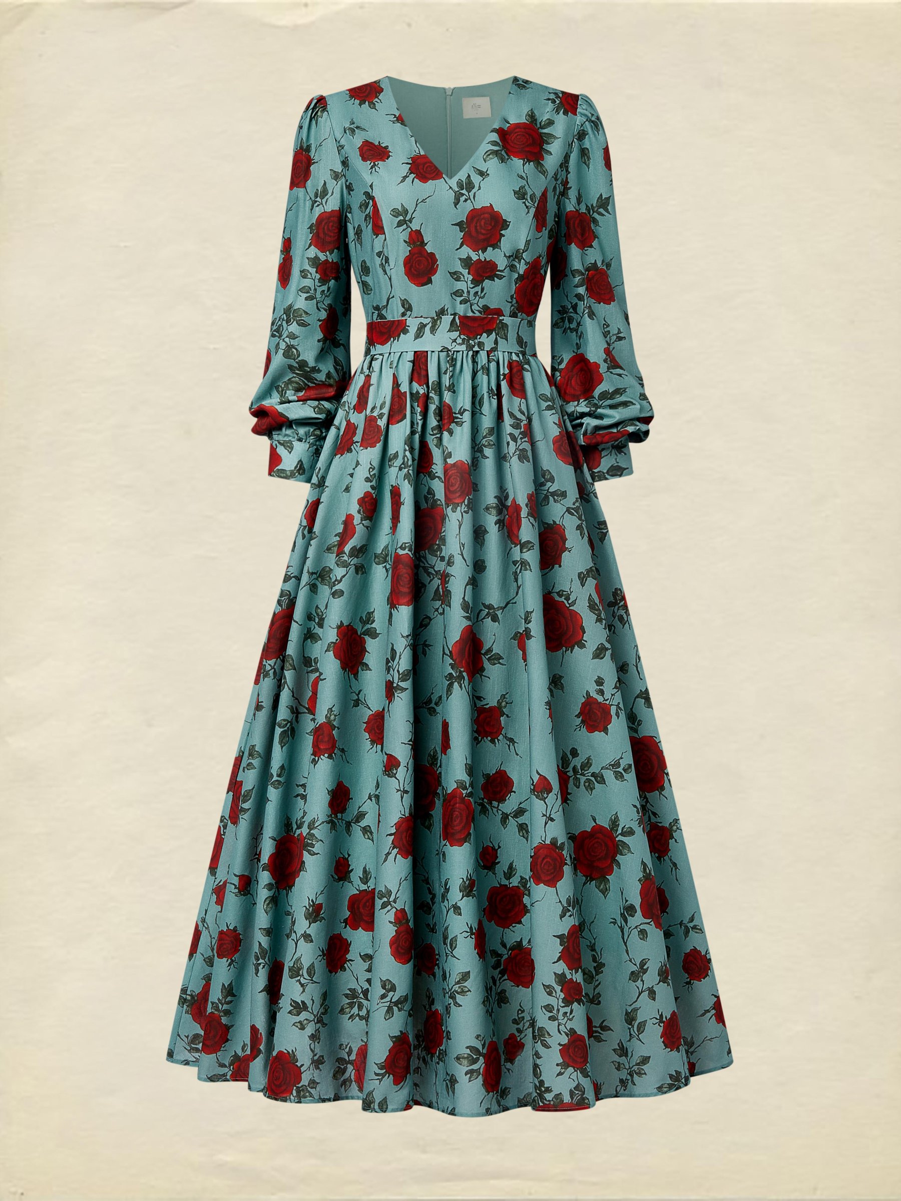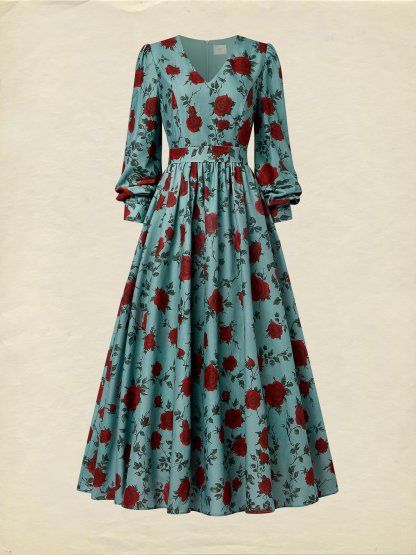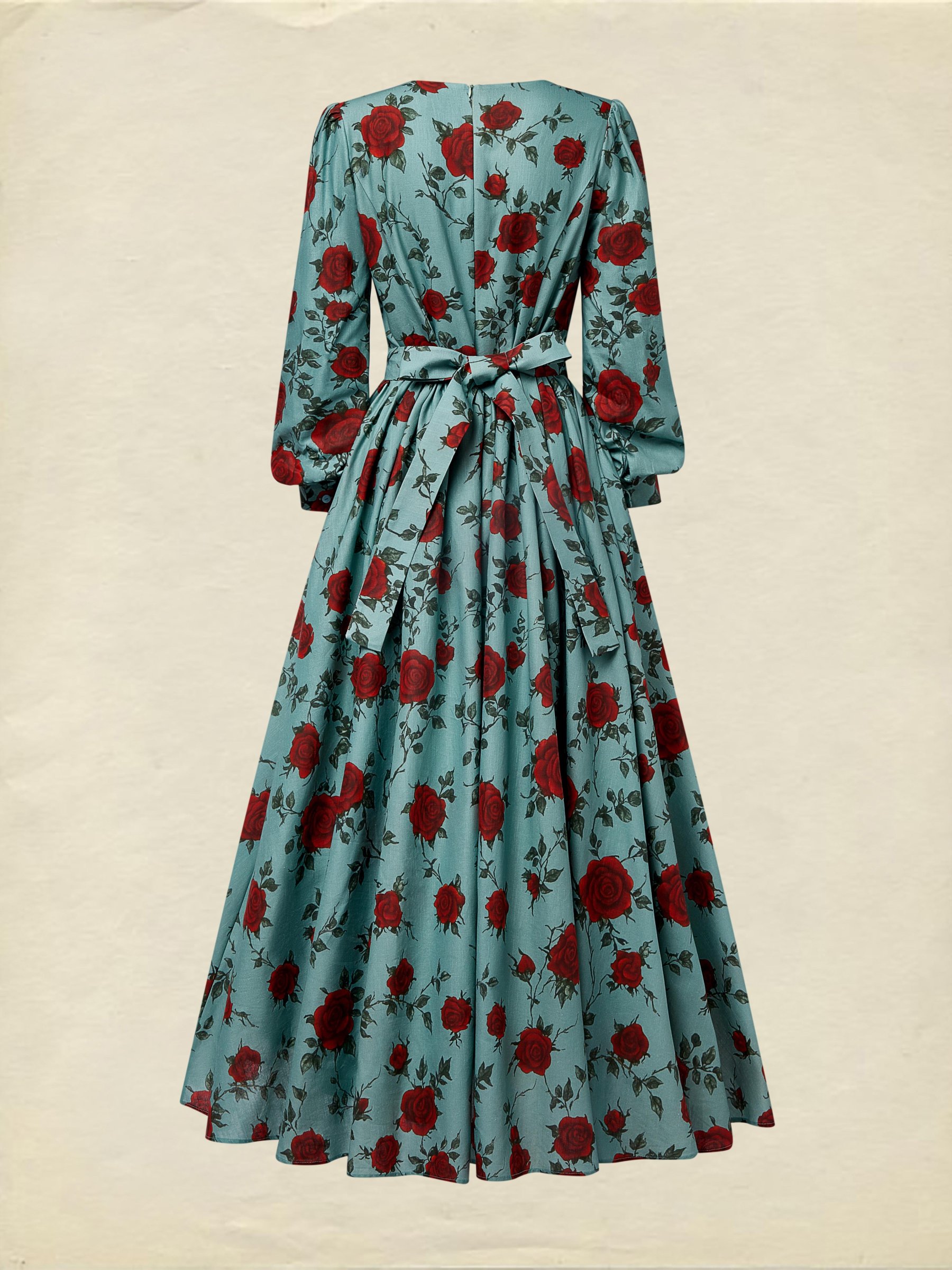 Maxi Linen Dress, Long Sleeves, V Neck, Floral, Belt Design, Vintage, Green