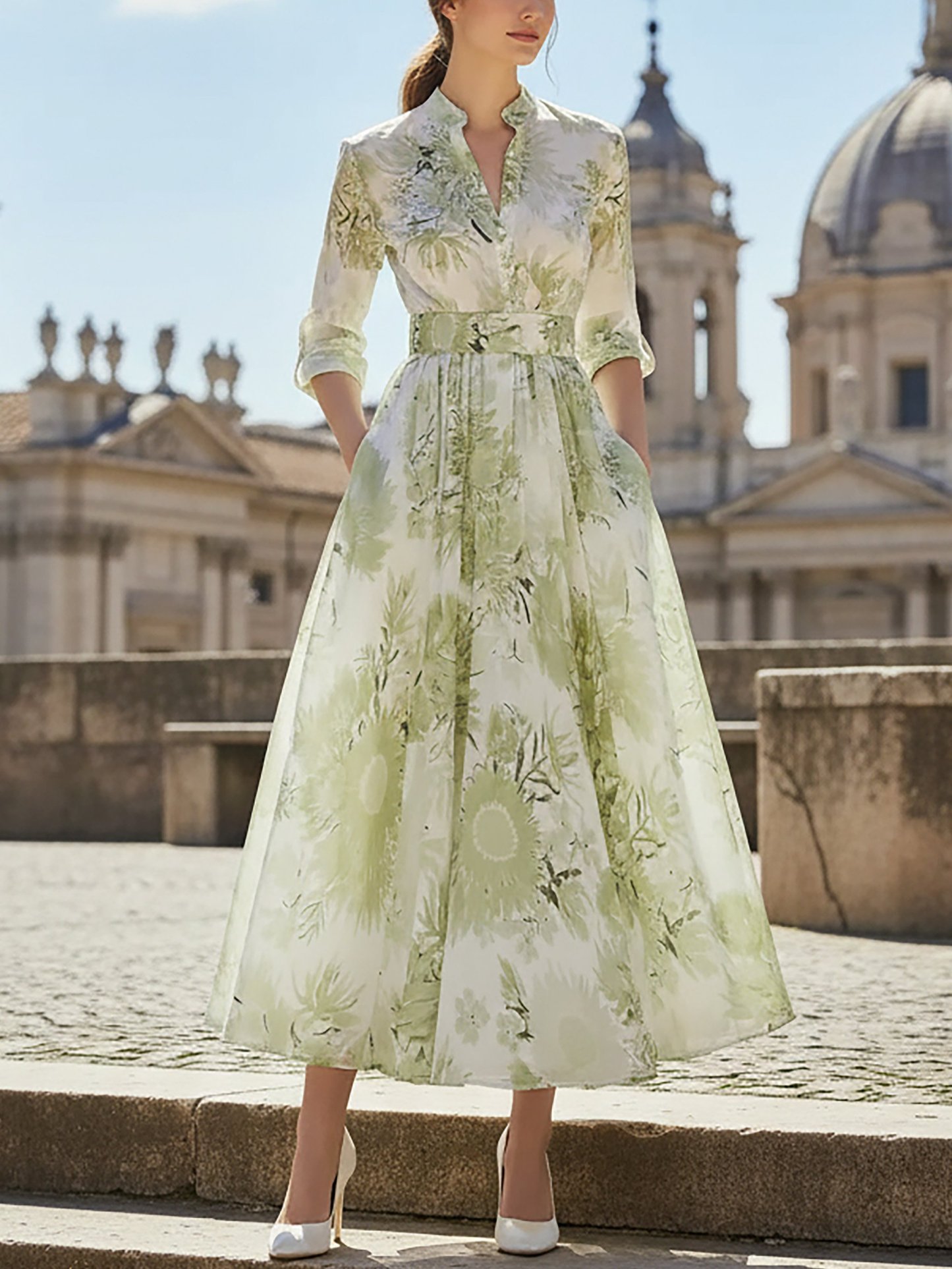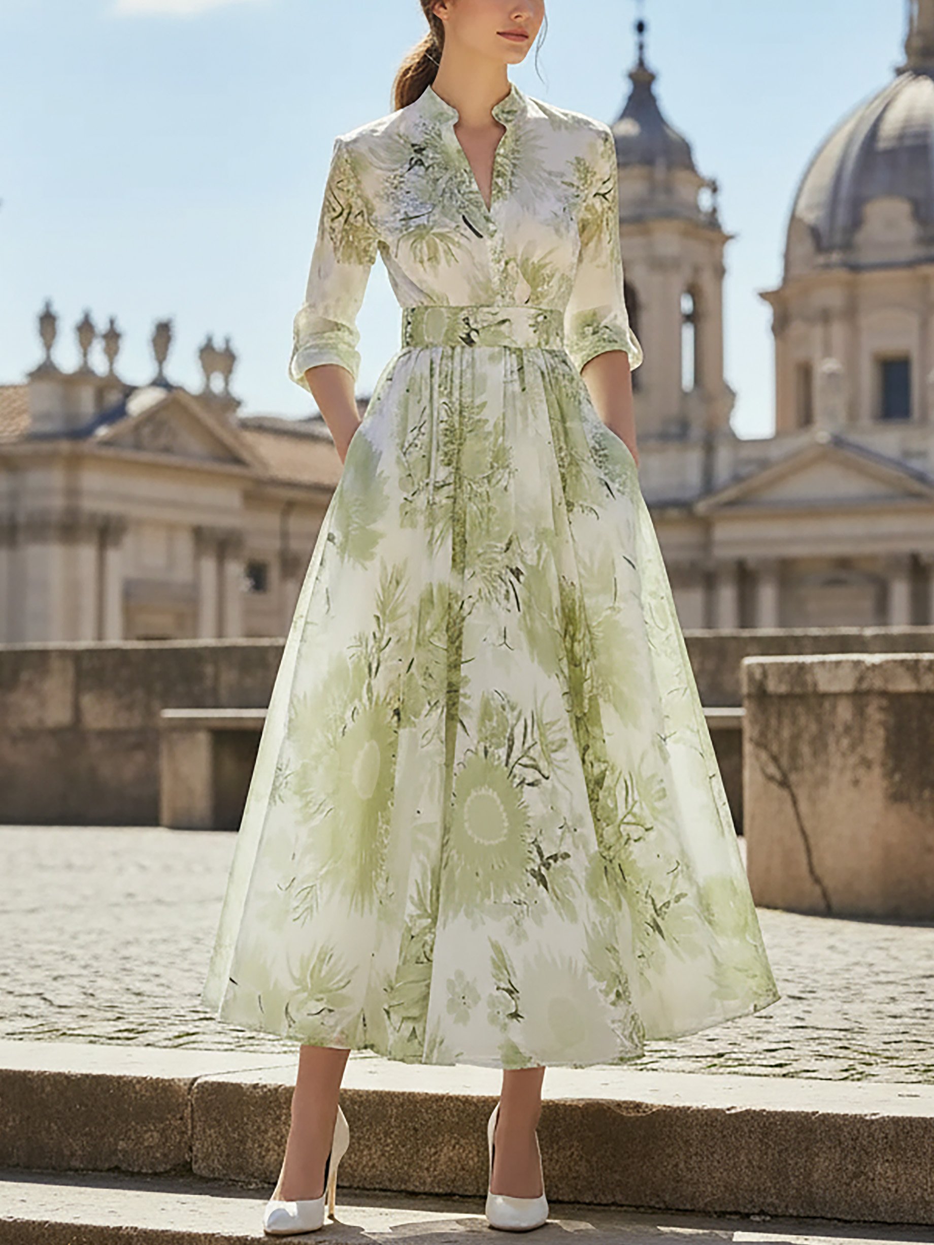 Maxi Linen Dress, Half Sleeve, Stand Collar, Floral, Vacation, Vintage, Lightgreen