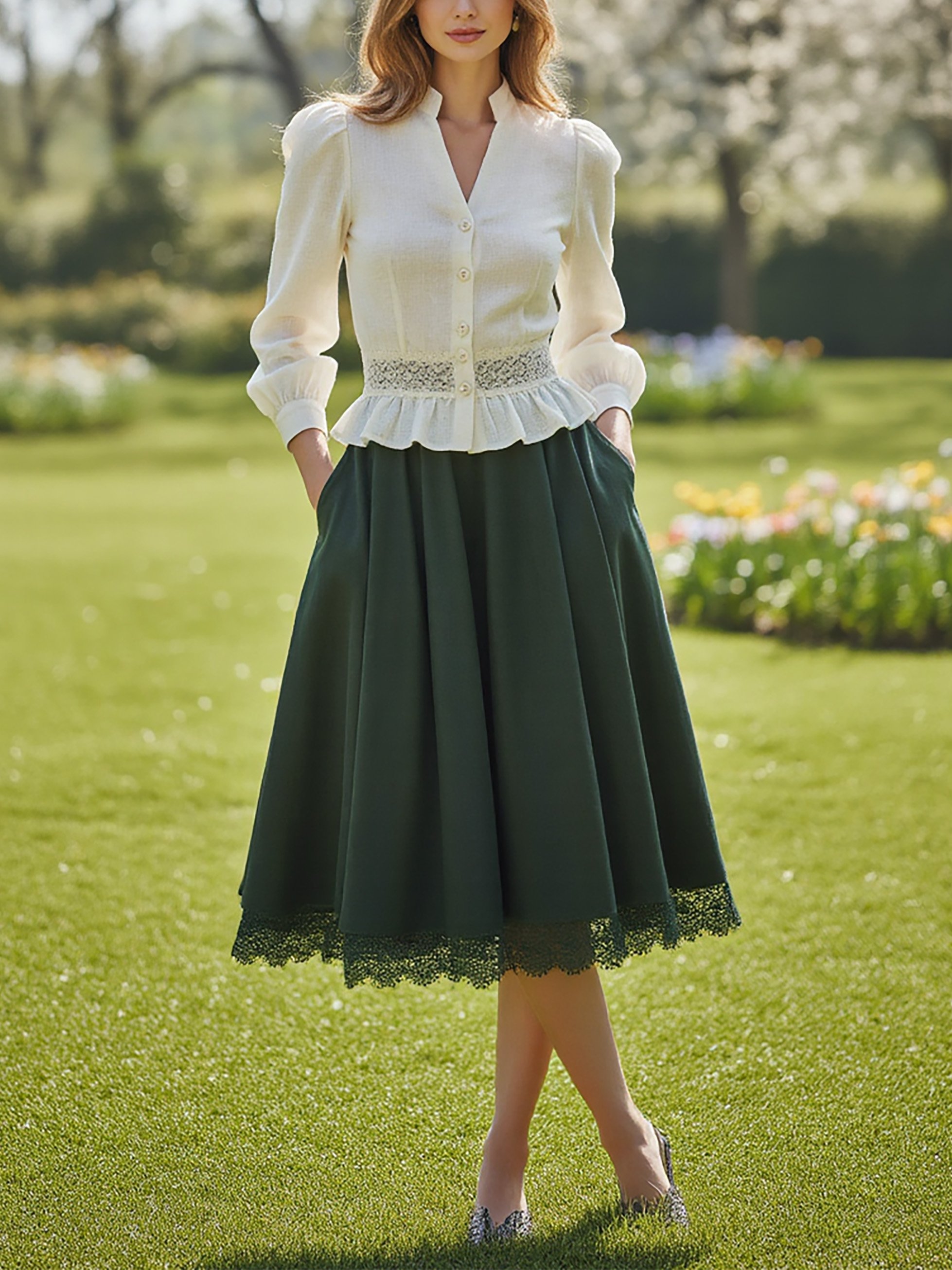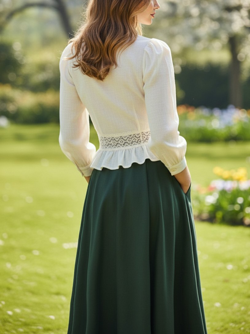 Linen Shirt, Long Sleeves, V Neck, Plain, Lace, Vintage, Ivory
