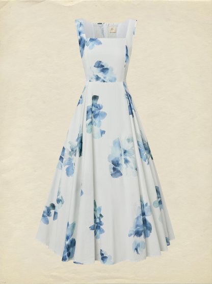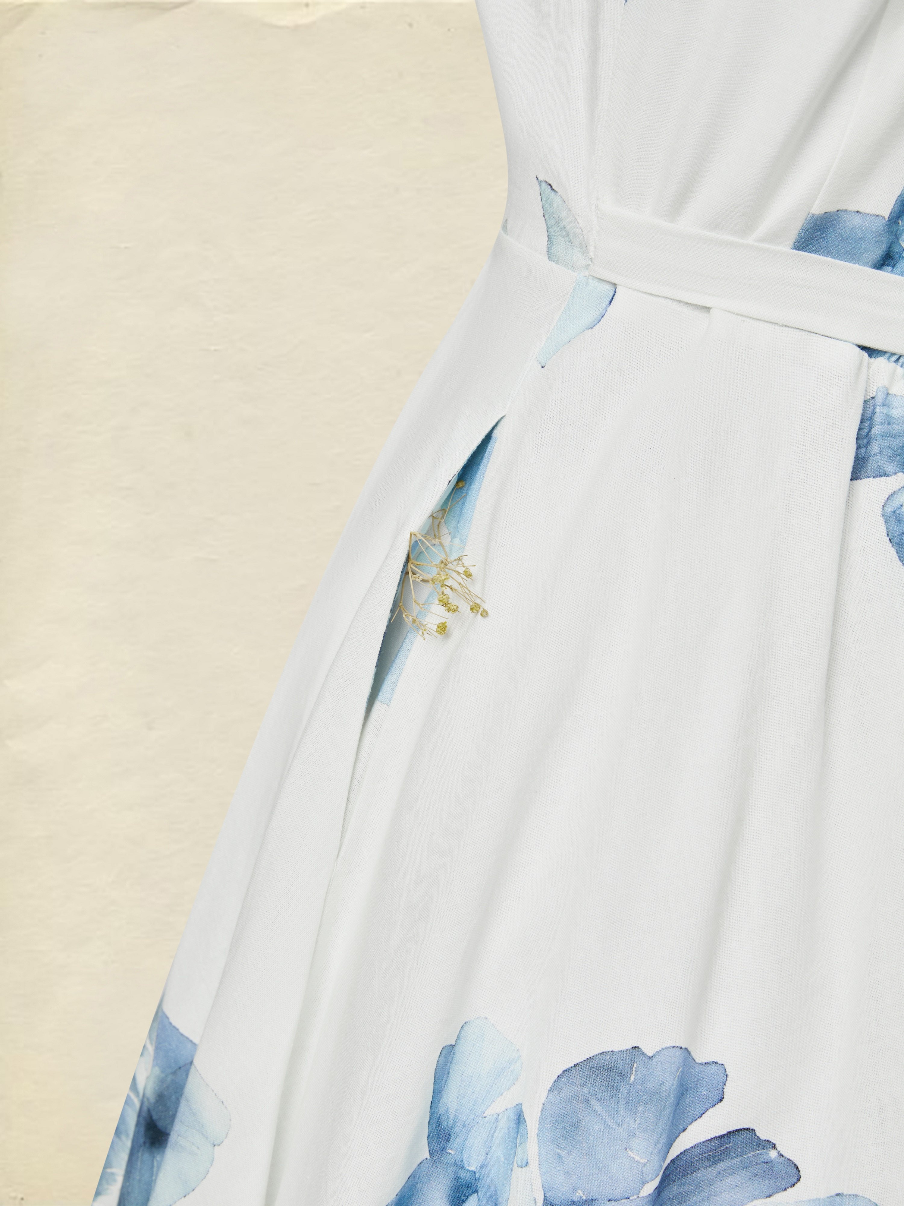 Maxi Cotton Dress, Sleeveless, Square Neck, Floral, Pocket Design, Vacation, Vintage, White