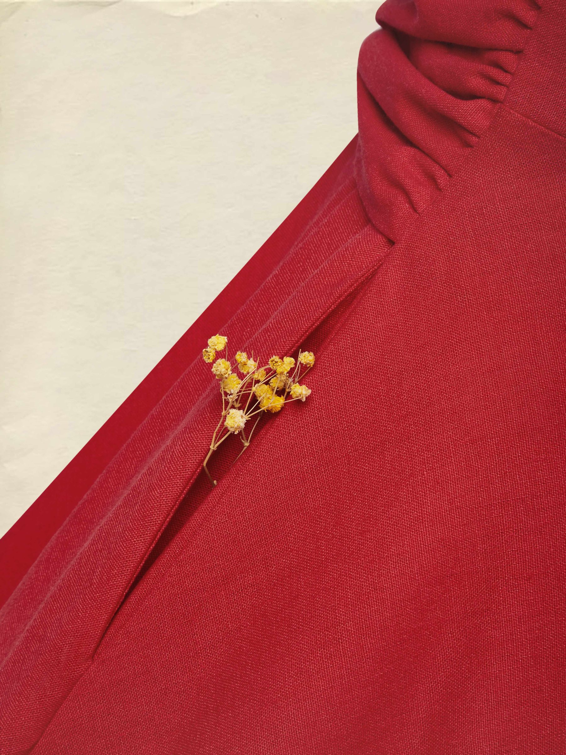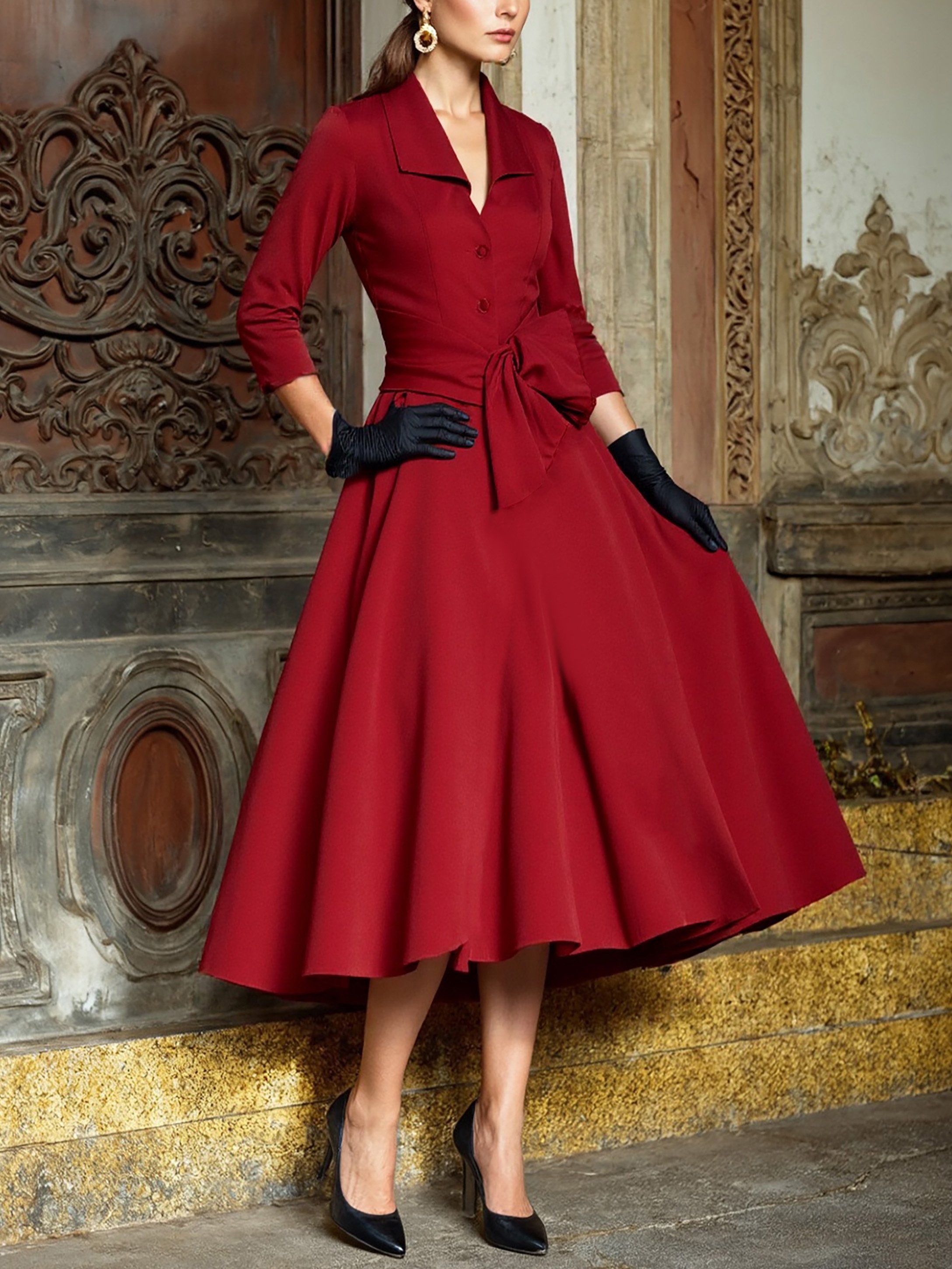 Midi Linen Dress, Half Sleeve, Shawl Collar, Plain, Button Design, French Vintage, Red