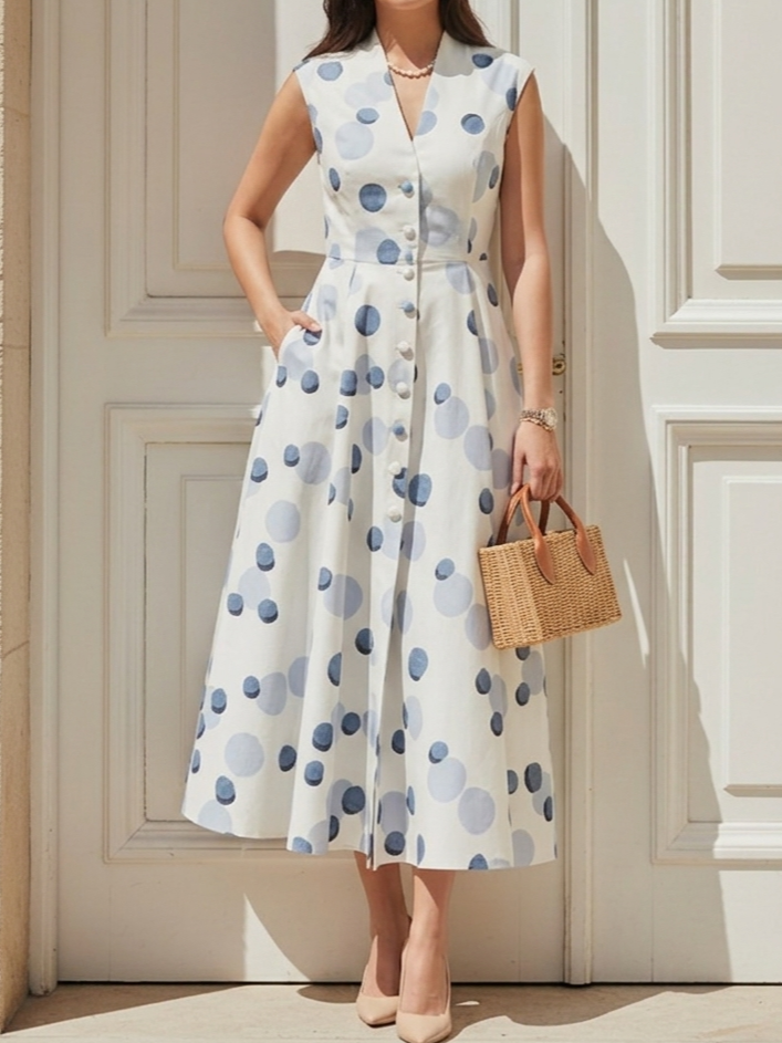 Midi Linen Dress, Sleeveless, V Neck, Polka Dots, Button Design, French Vintage, White