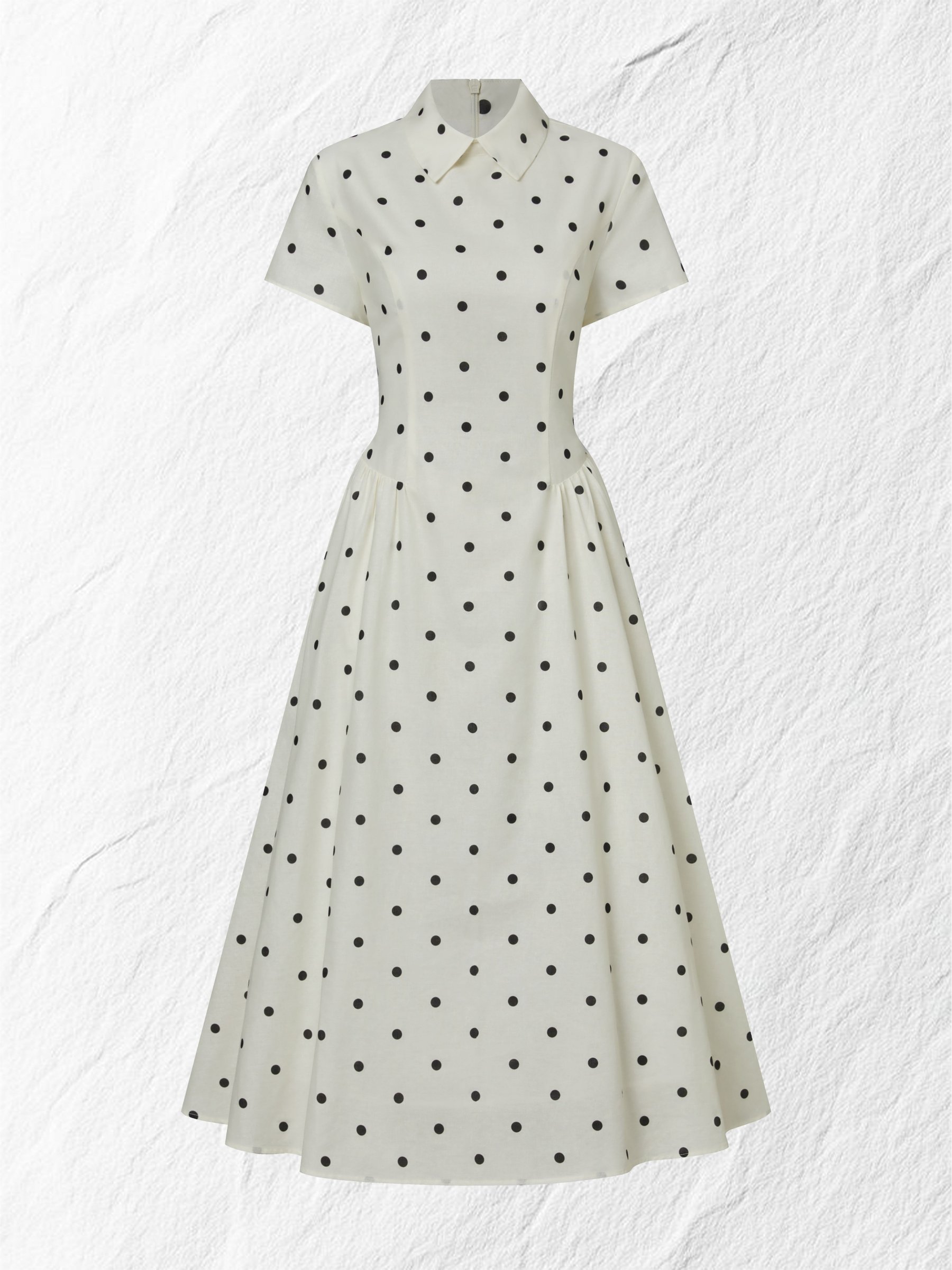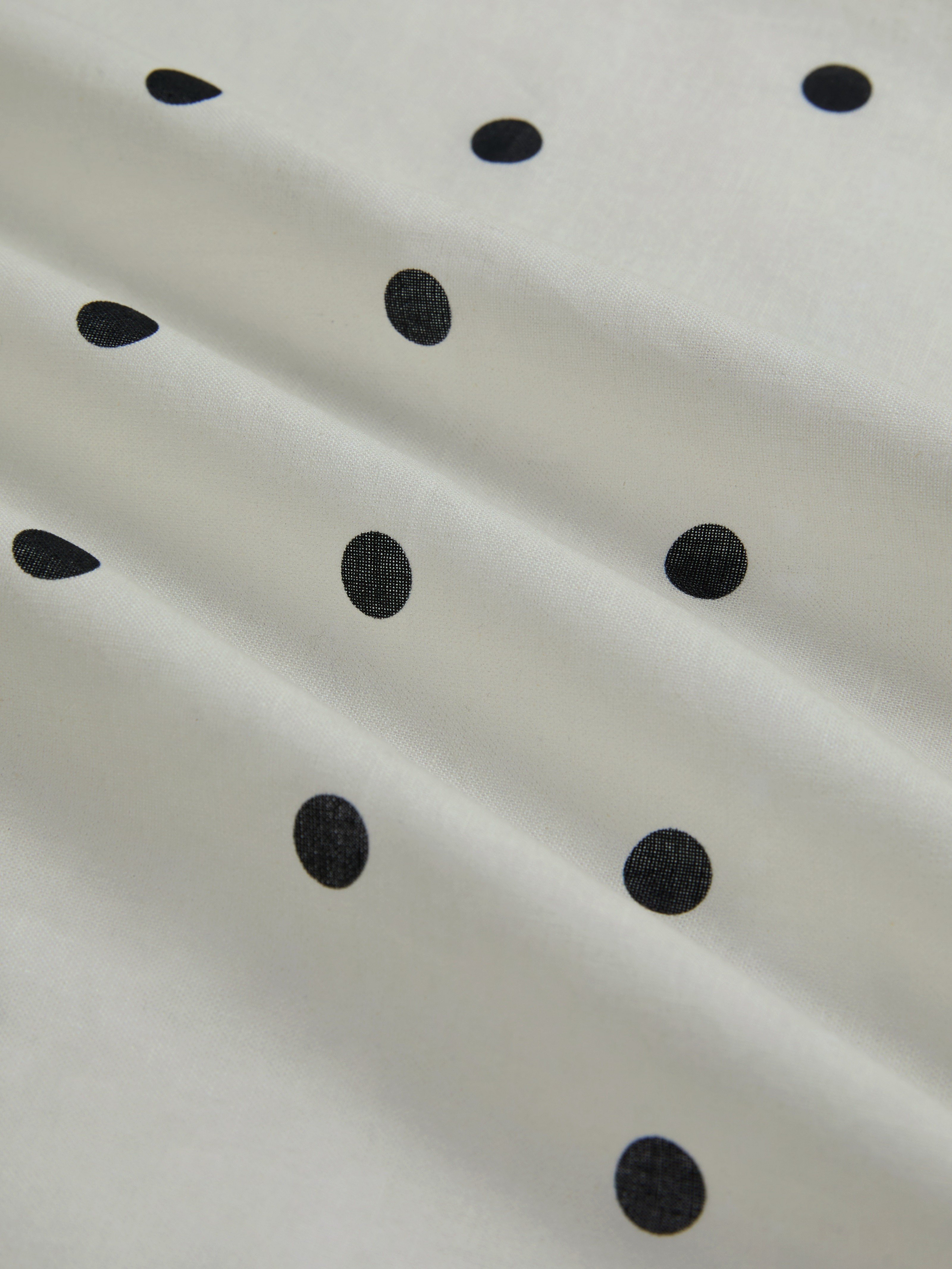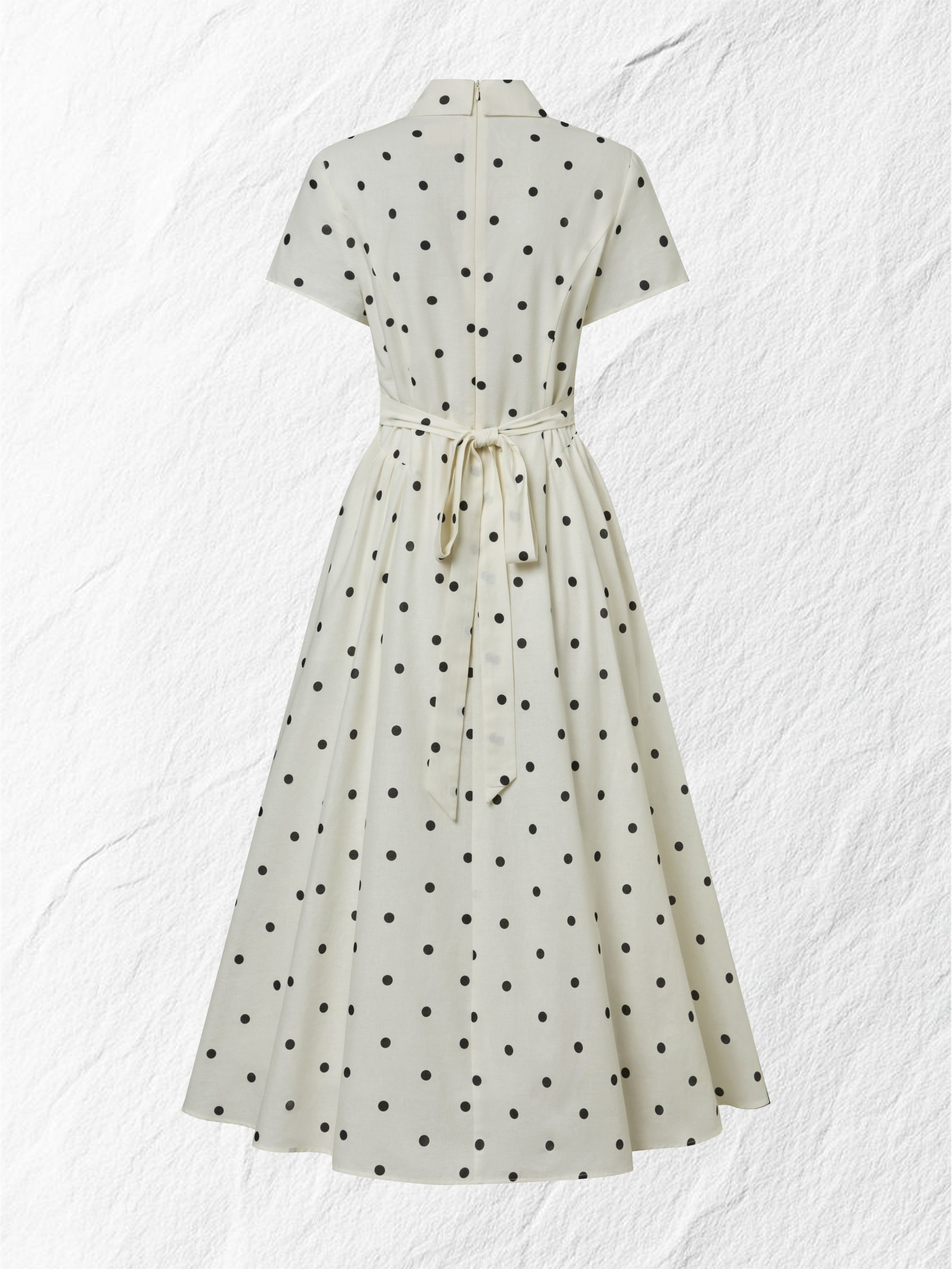 Maxi Linen Dress, Short Sleeves, Shawl Collar, Polka Dots, French Vintage, Off White