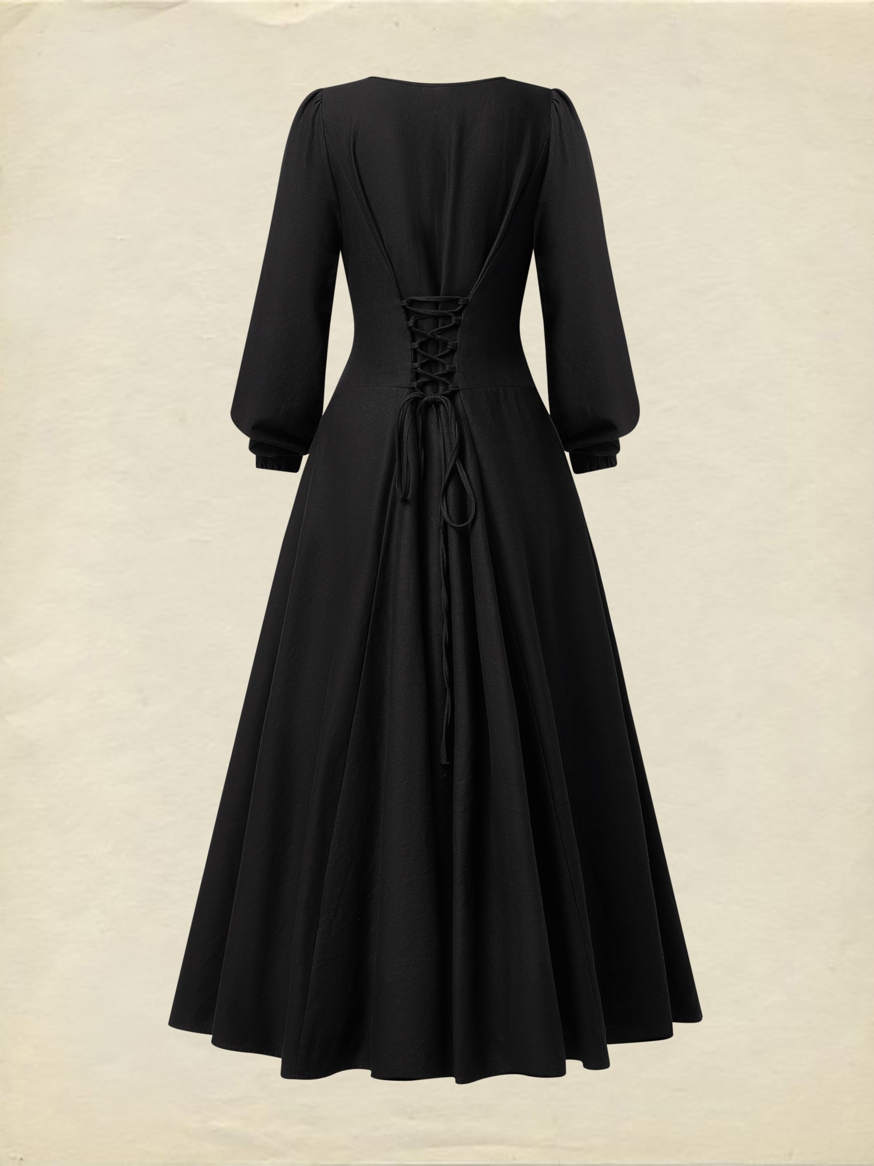 Maxi Linen Dress, Button Design, Square Neck, Lace Up, Linen Blend, Black
