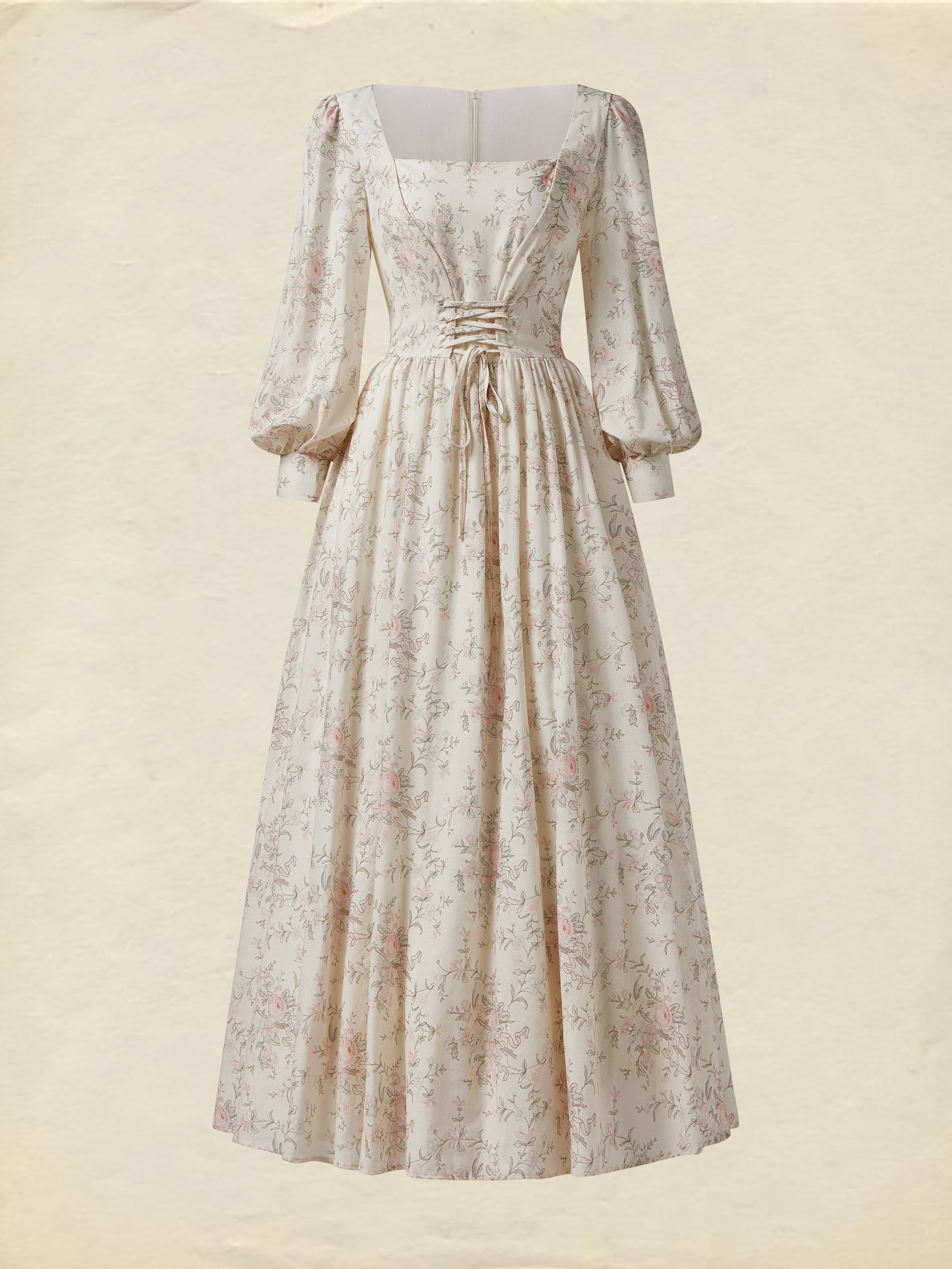 Linen Maxi Dress, Long Sleeves, Square neck, Floral, Pink, Tea Party