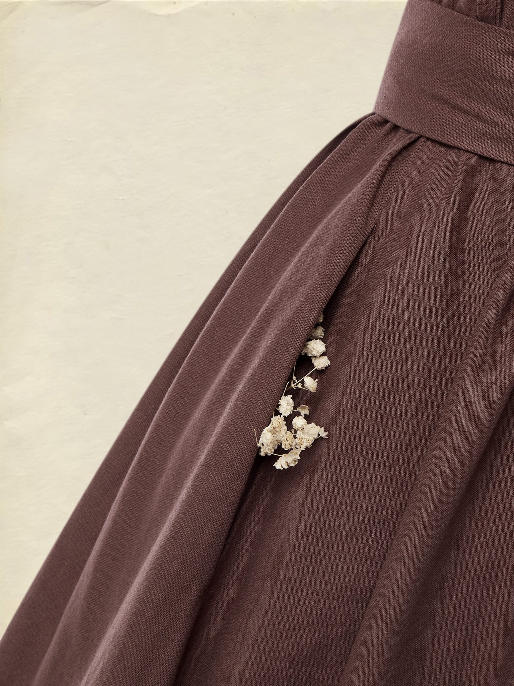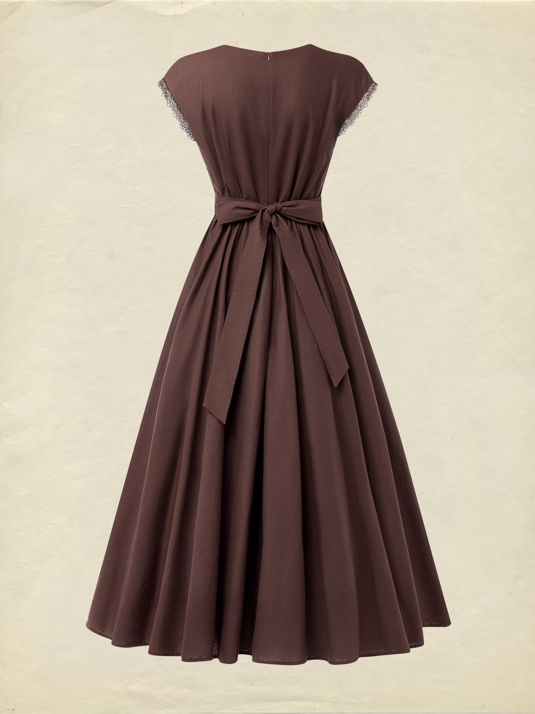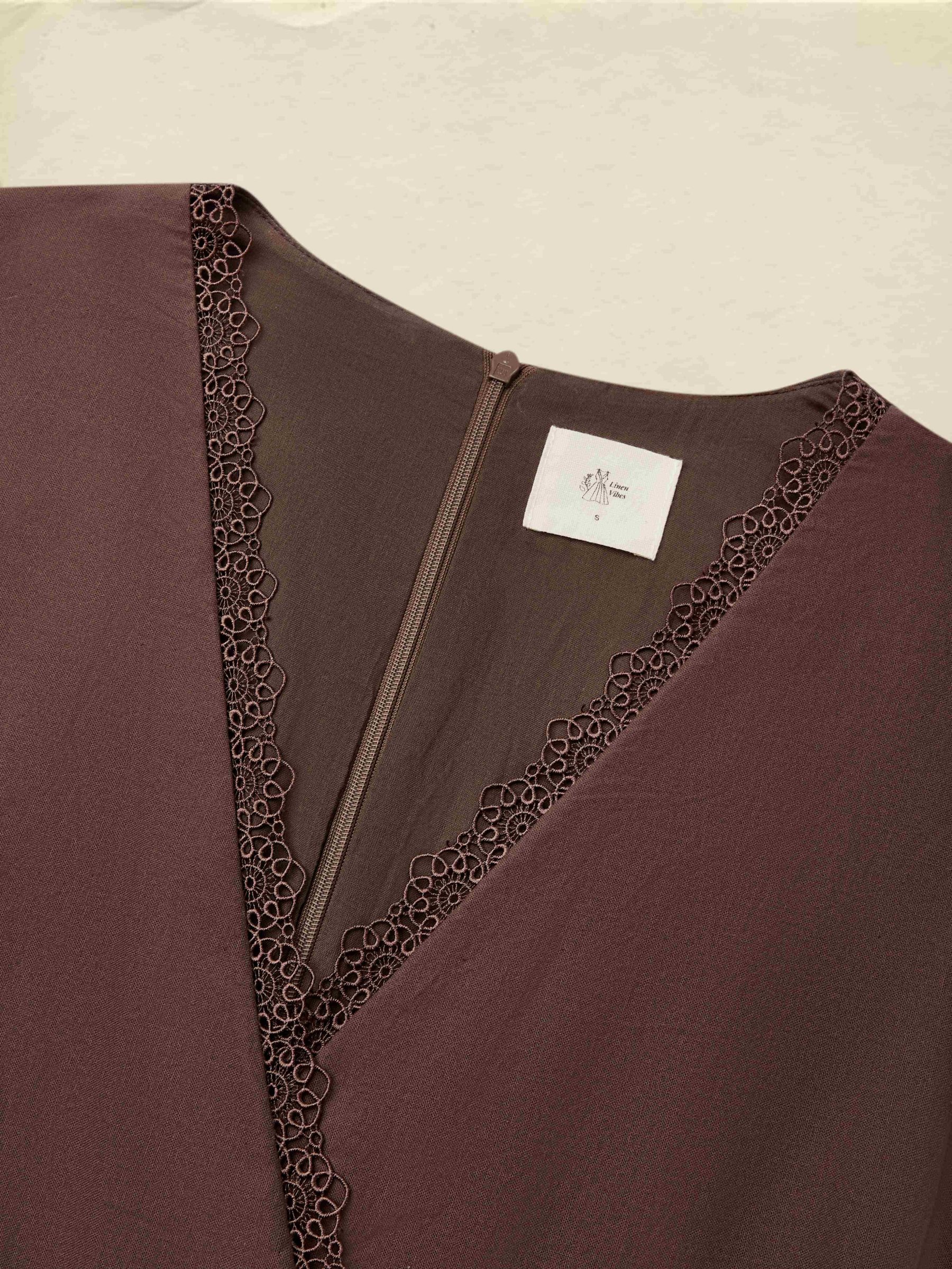 Linen Maxi Dress, Short Sleeve, Lace Collar, Plain, Vintage, CAMEO BROWN