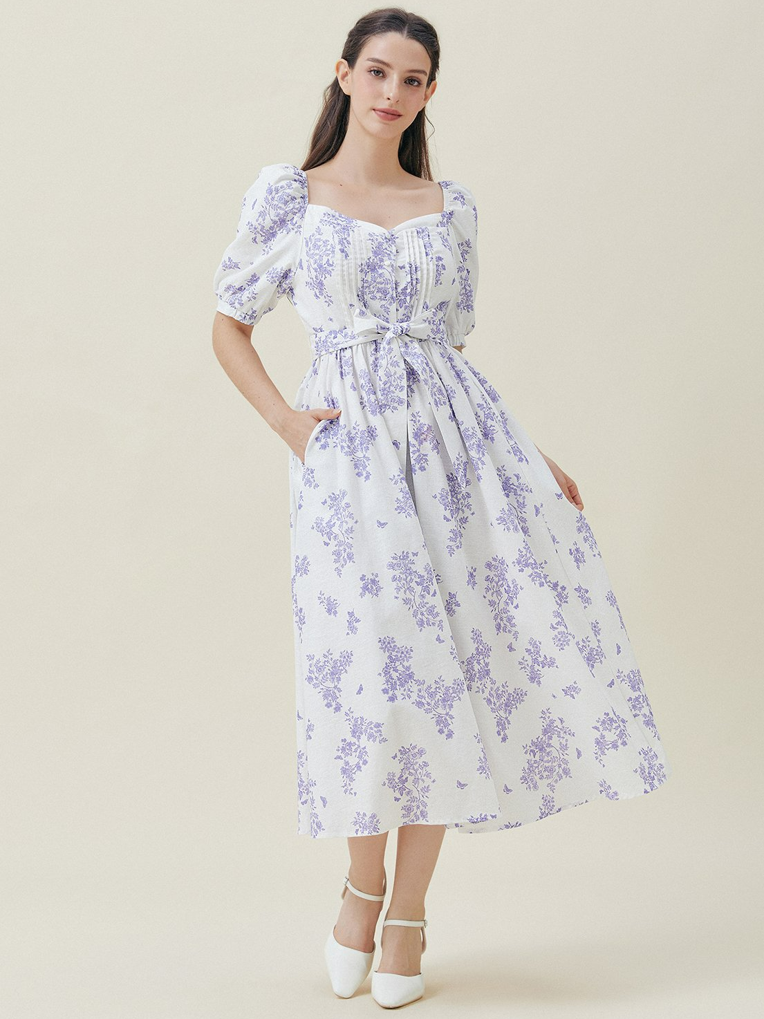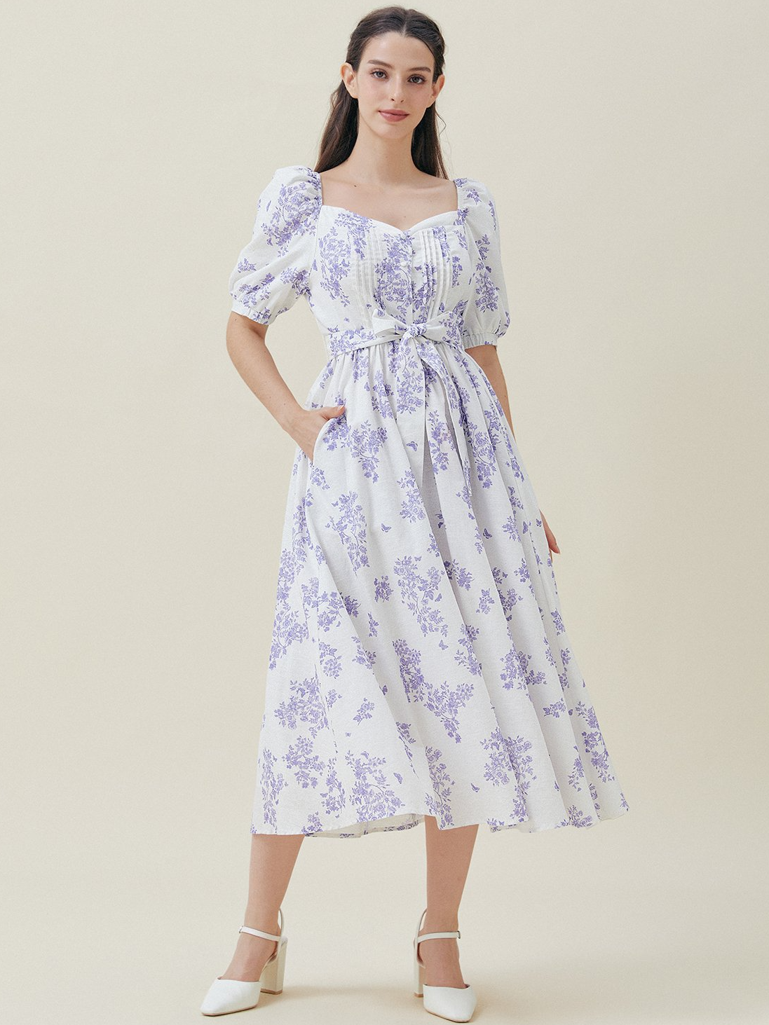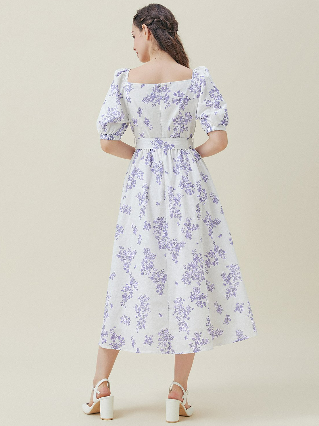 Floral Midi Dress, Puff Sleeve, Square Neck, Jane-Inspired Vintage, Summer Dress, Linen Blend