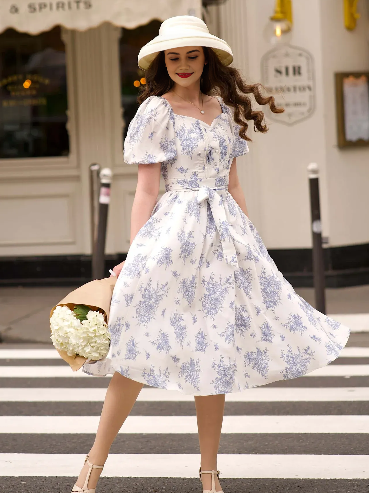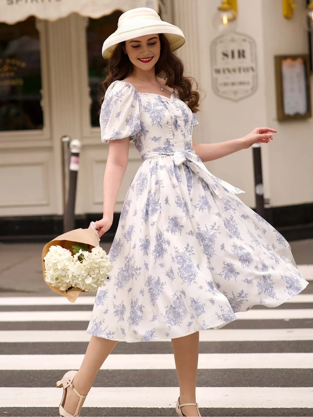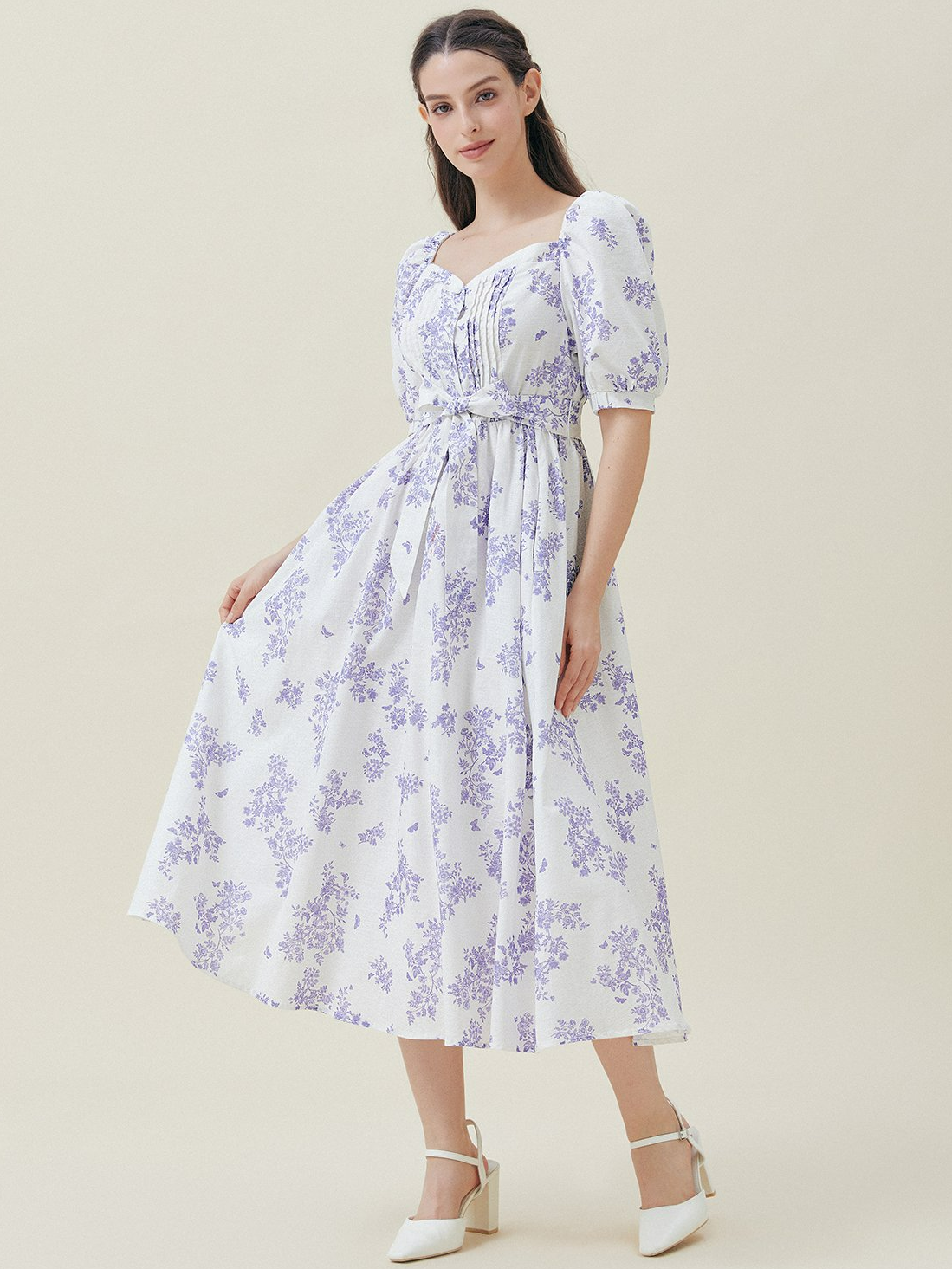 Floral Midi Dress, Puff Sleeve, Square Neck, Jane-Inspired Vintage, Summer Dress, Linen Blend
