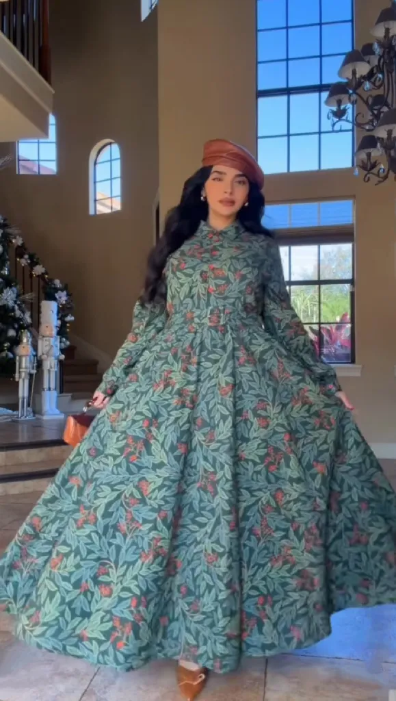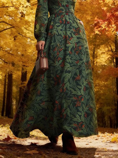 Maxi Linen Dress, Long Sleeves, Shawl Collar, Floral, Button Design, Vintage, Green