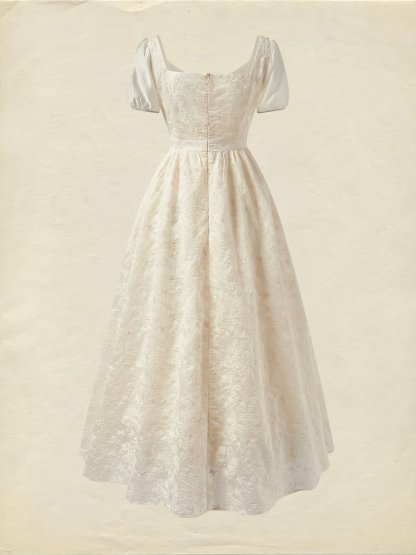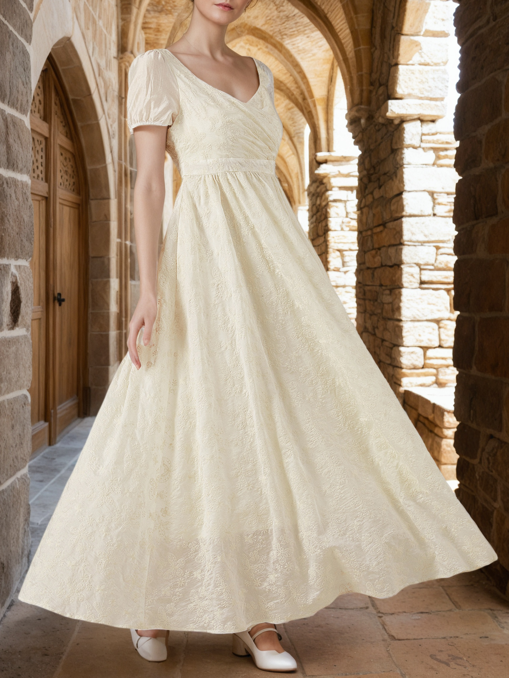 (Size XXS to XL) Maxi Tencel fiber Dress,Short Sleeve, V Neck, Jane-Vintage Inspired, Linen Blend, Floral,Embroidery pattern, White